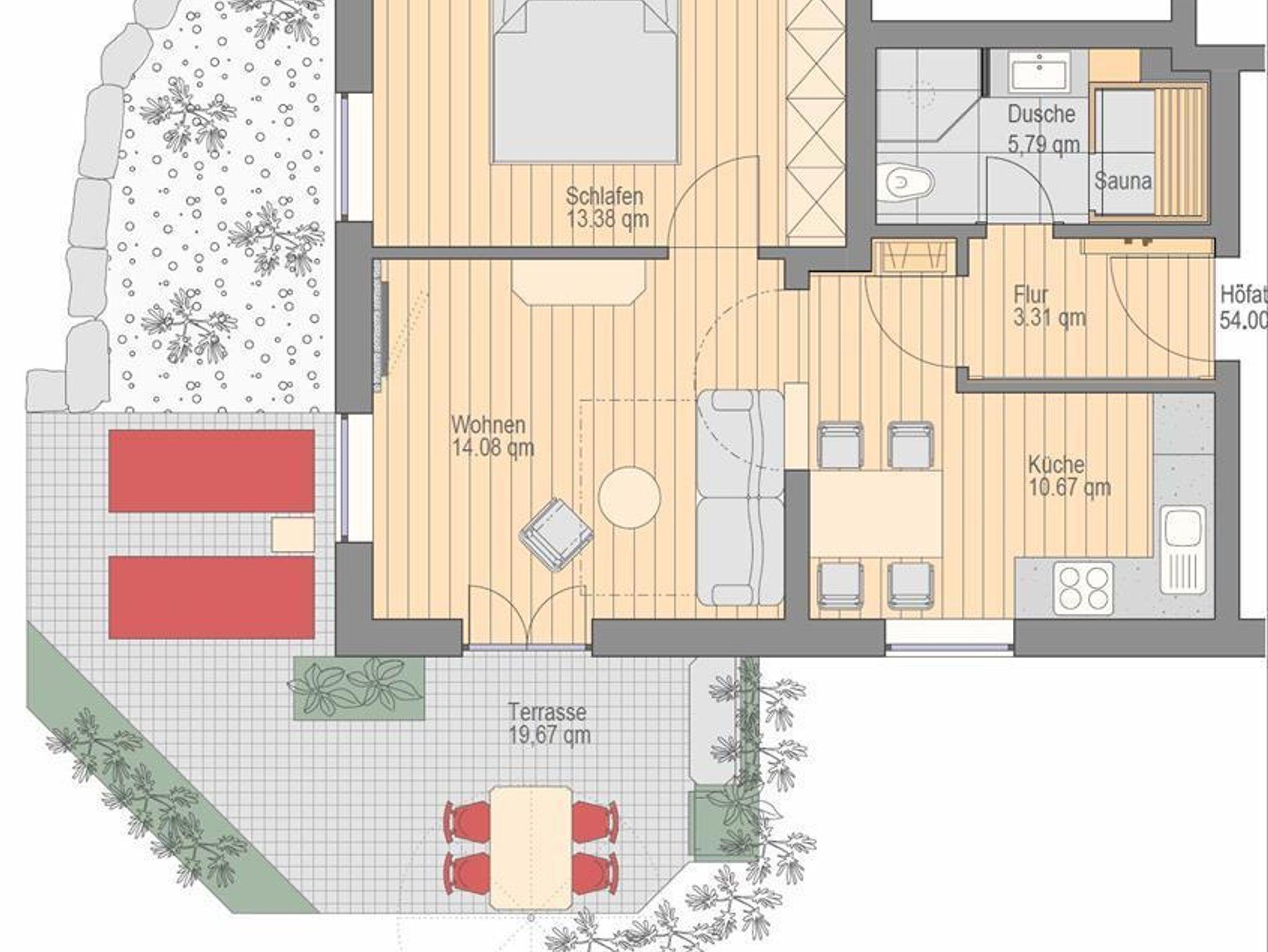 Auch unser Appartement Höfatsblick ist eine kleine Design-Perle: 54qm, separates Schlafzimmer mit Altholz und nostalgischem schwarz-weiß Foto an der Wand. Der Wohnraum mit Flachbildschirm ist von der voll ausgestatteten Küche mit Essplatz durch einen Rundbogen getrennt. Im Bad befindet sich ein wohnungseigenes Mini-Spa mit Sauna und Rainshower. Gemütliche Terrasse mit Ost- u. Südseite.