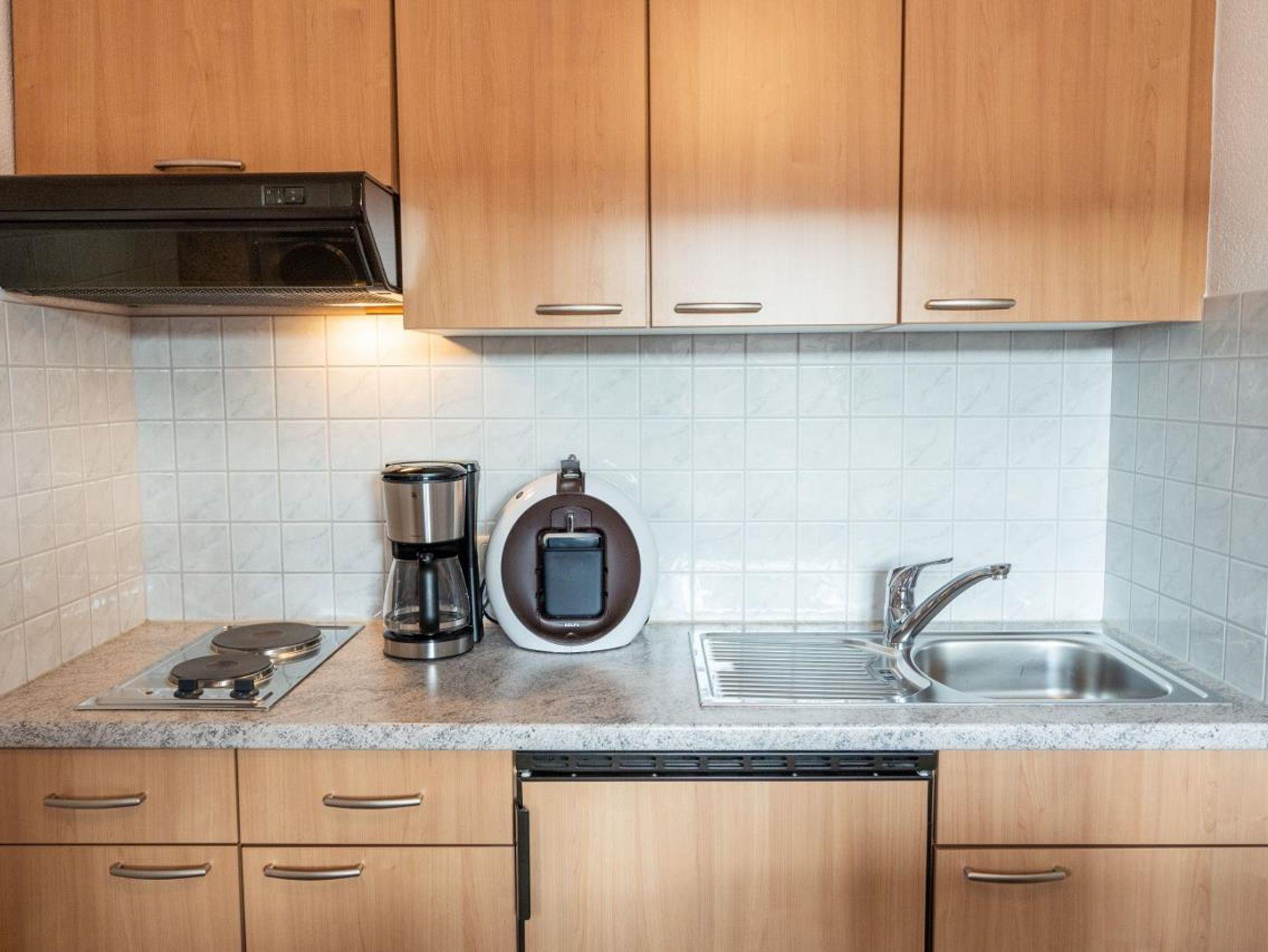 2-Raum Ferienwohnung im 1. Obergeschoss, für 2 Personen, Süd-West-Balkon, Du/WC, separate Küche mit Eckbankgruppe (2-Platten-Herd, Kaffeemaschine, Wasserkocher, Toaster), separates Schlafzimmer mit Doppelbett, Wohnzimmer mit ausziehbarer Schlafcouch, Zimmersafe, Flachbild TV, WLAN, Sauna im Haus.