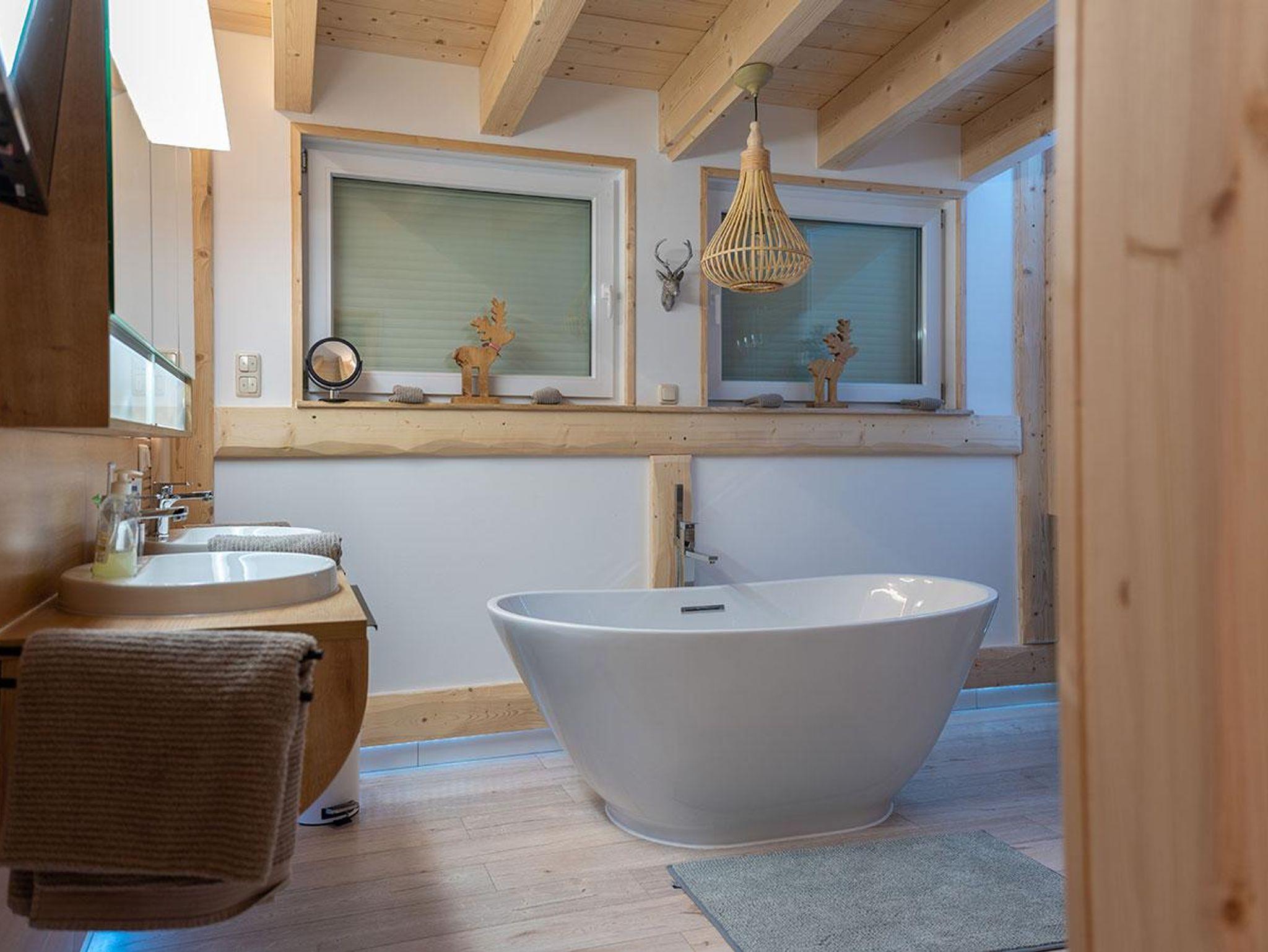 Das Dachgeschoss-Chalet Rubi bietet auf ca. 100 qm gemütlichen Wohnraum für bis zu 4 Personen. Zwei romantische Schlafzimmer mit Kingsize-Boxspringbetten und jeweils eigenem TV sorgen für erholsame Nächte. Das moderne Bad verfügt über eine Regendusche und eine freistehende Badewanne; zusätzlich gibt es ein Gäste-WC. WLAN und Smart TV sind selbstverständlich vorhanden.