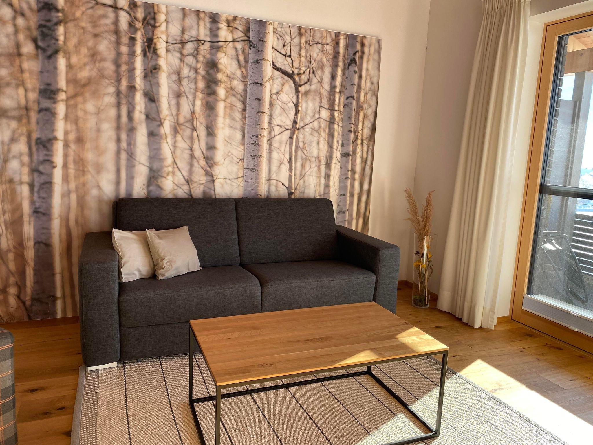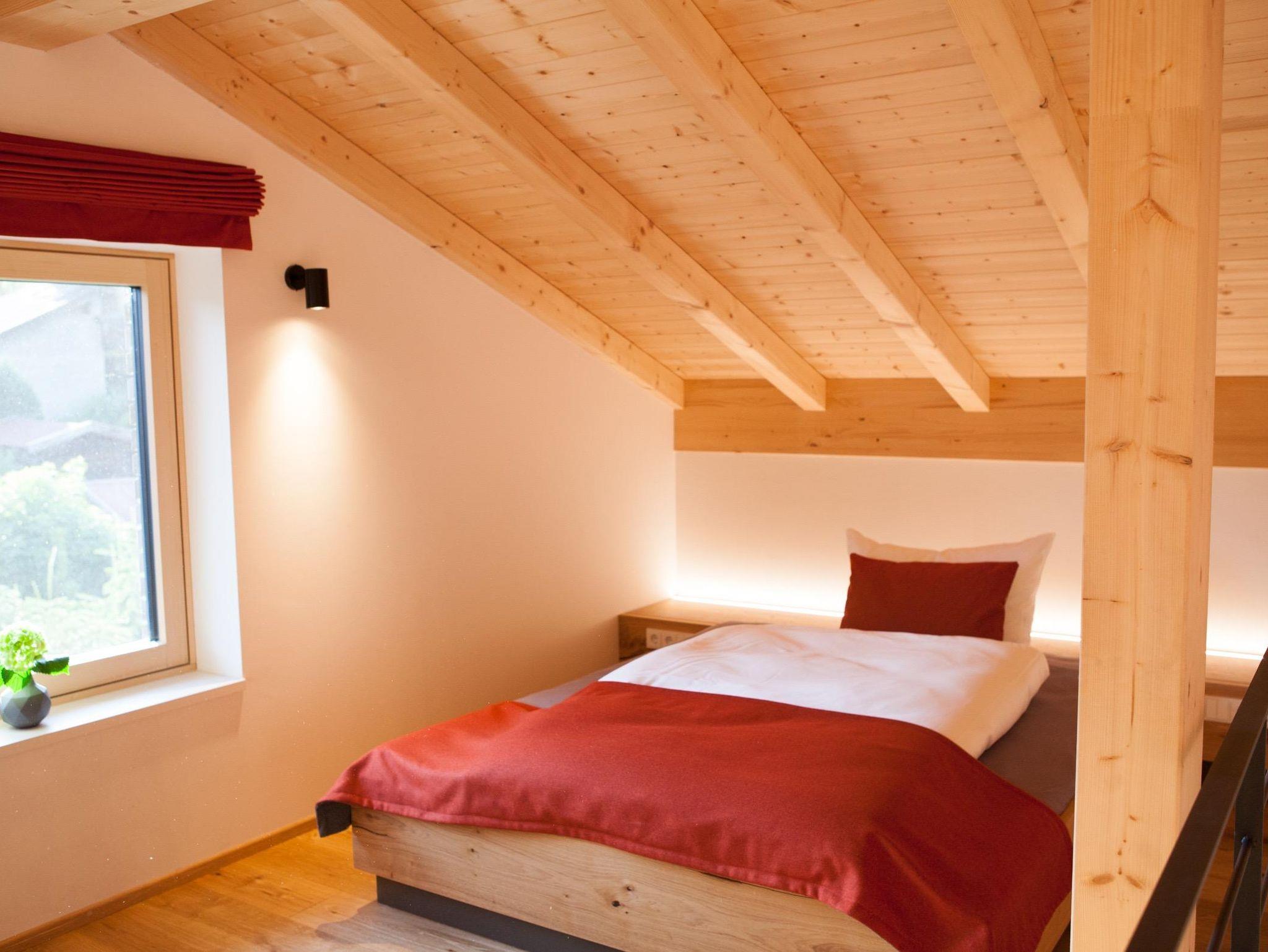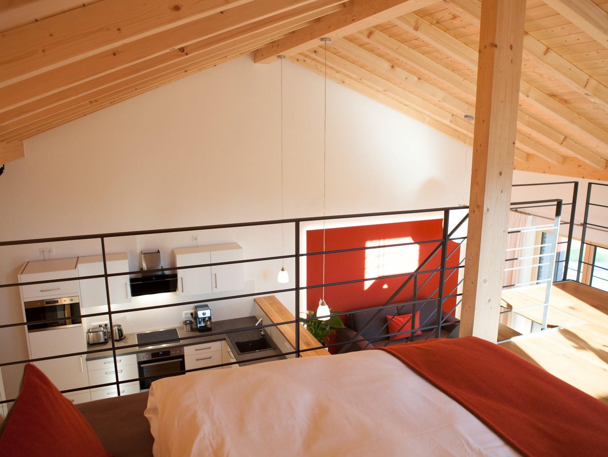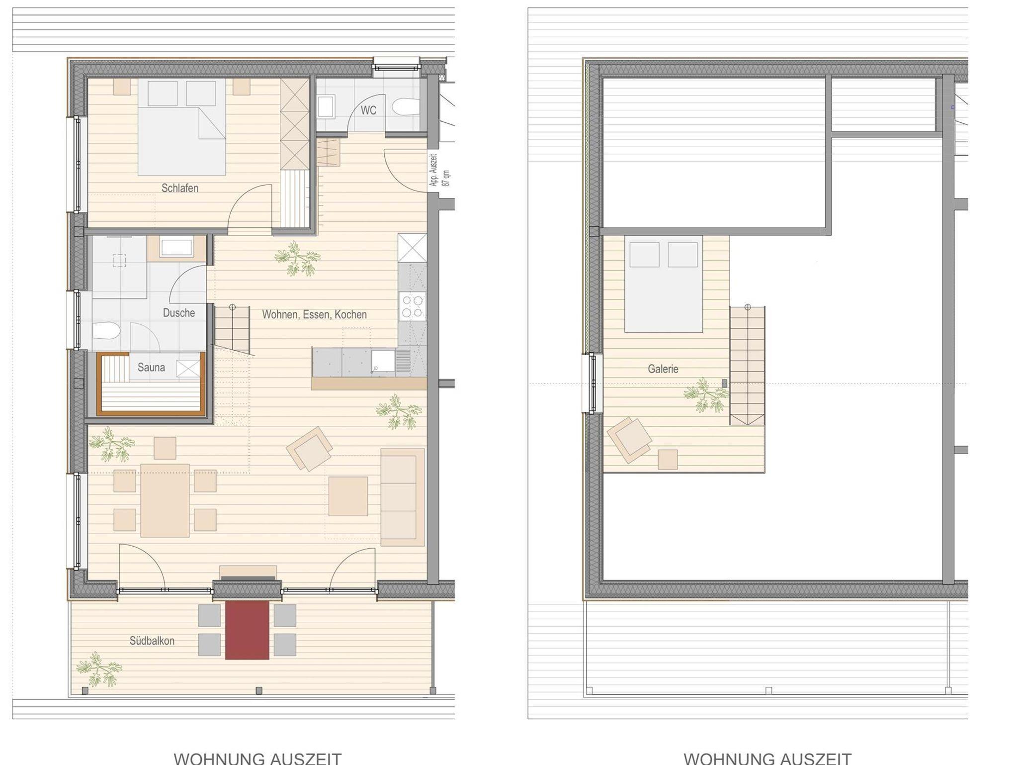 Unsere Wohnung „Auszeit“ befindet sich im Dachgeschoss und besticht mit einem traumhaften, offnen Dachstuhl und einem herrlichen Blick rein in die Berge. Verteilt auf zwei Ebenen befindet sich im unteren Bereich neben dem Schlafzimmer und dem Badezimmer mit Sauna auch die Küche mit angrenzendem, offenen Wohn- und Essbereich. Hier haben Sie Platz zum gemeinsamen kochen, essen und verweilen. Die Ausstattung ist hochwertig, stimmig und trägt dazu bei, sich rundum wohl zu fühlen. Die Galerie bietet mit einem Doppelbett Platz für weitere Gäste oder lädt zum entspannen ein.