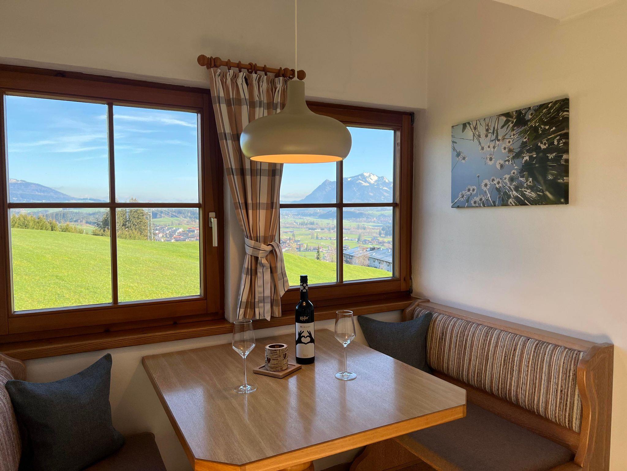 Liebevoll eingerichtete Ferienwohnung, Ost-Balkon mit schöner Bergsicht auf die Allgäuer Alpen und Blick nach Fischen, Kochnische mit Essecke gut ausgestattet, Dusche/WC, Sat-TV, W-LAN kostenlos im Haus vorhanden.