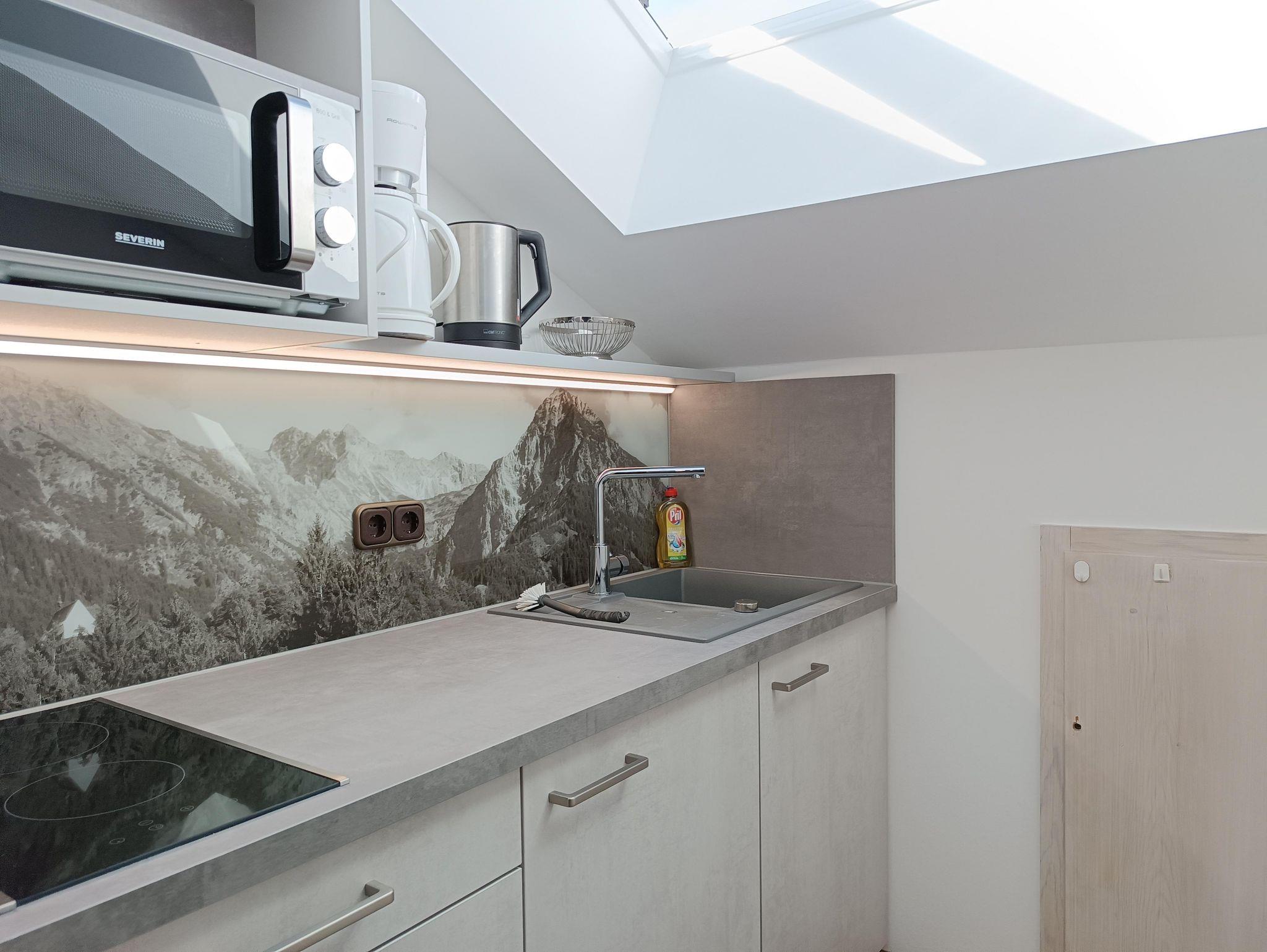 Gemütliche 1-Raum Ferienwohnung im DG, 40qm für 1-2 Personen, exklusive Lage in Fischen, traumhafter Bergblick, Südbalkon, sep. Küche, Bad mit Dusche, sep. WC, kostenloser PKW-Stellplatz am Haus, Aufzug im Haus, Ski-Raum, WLAN