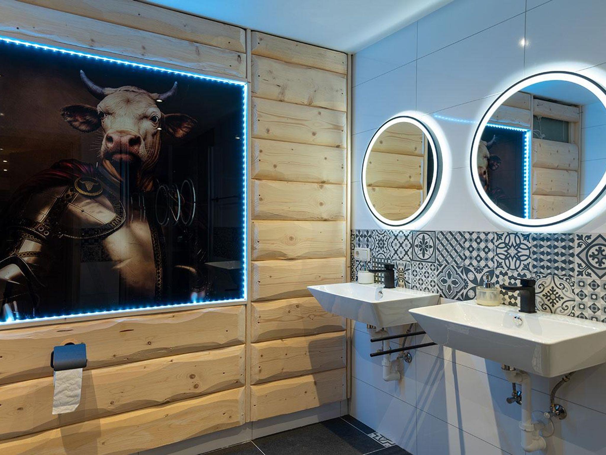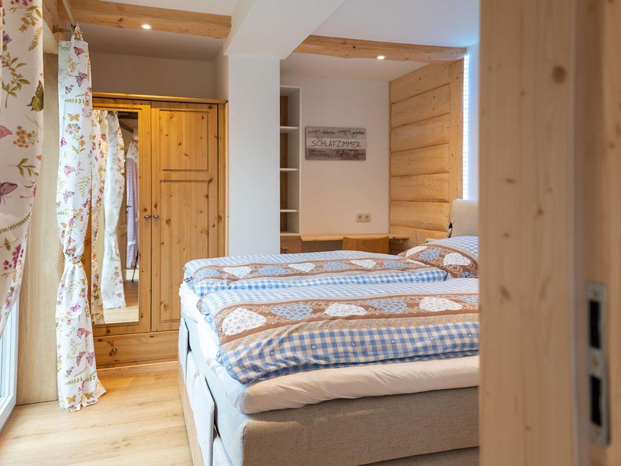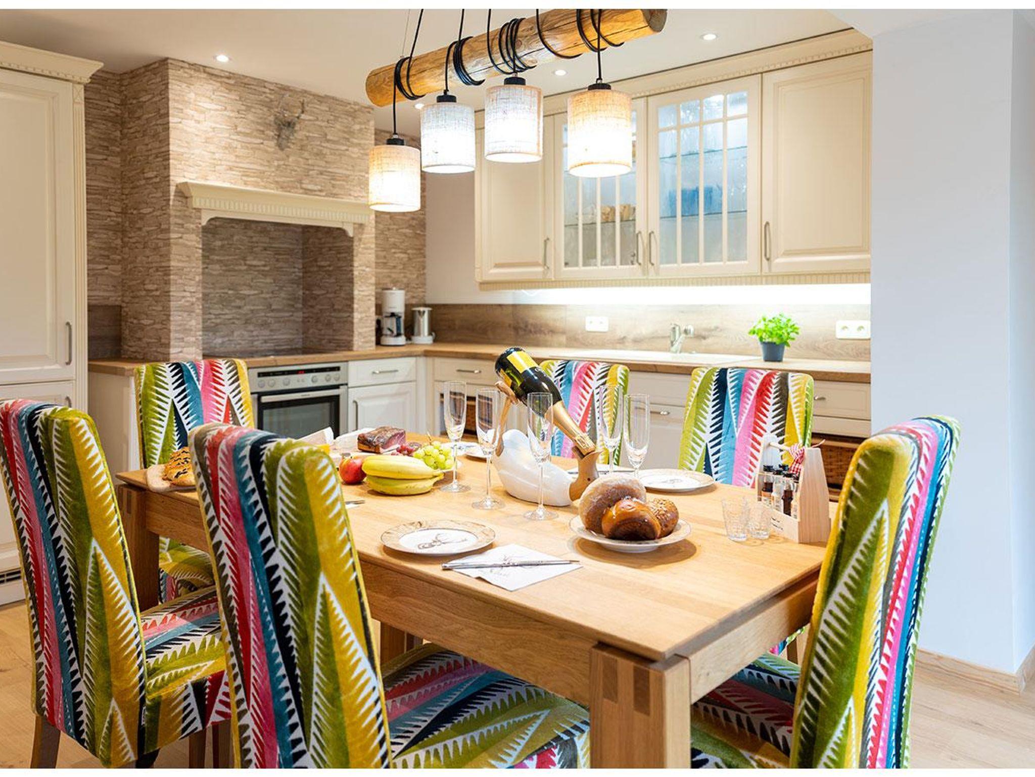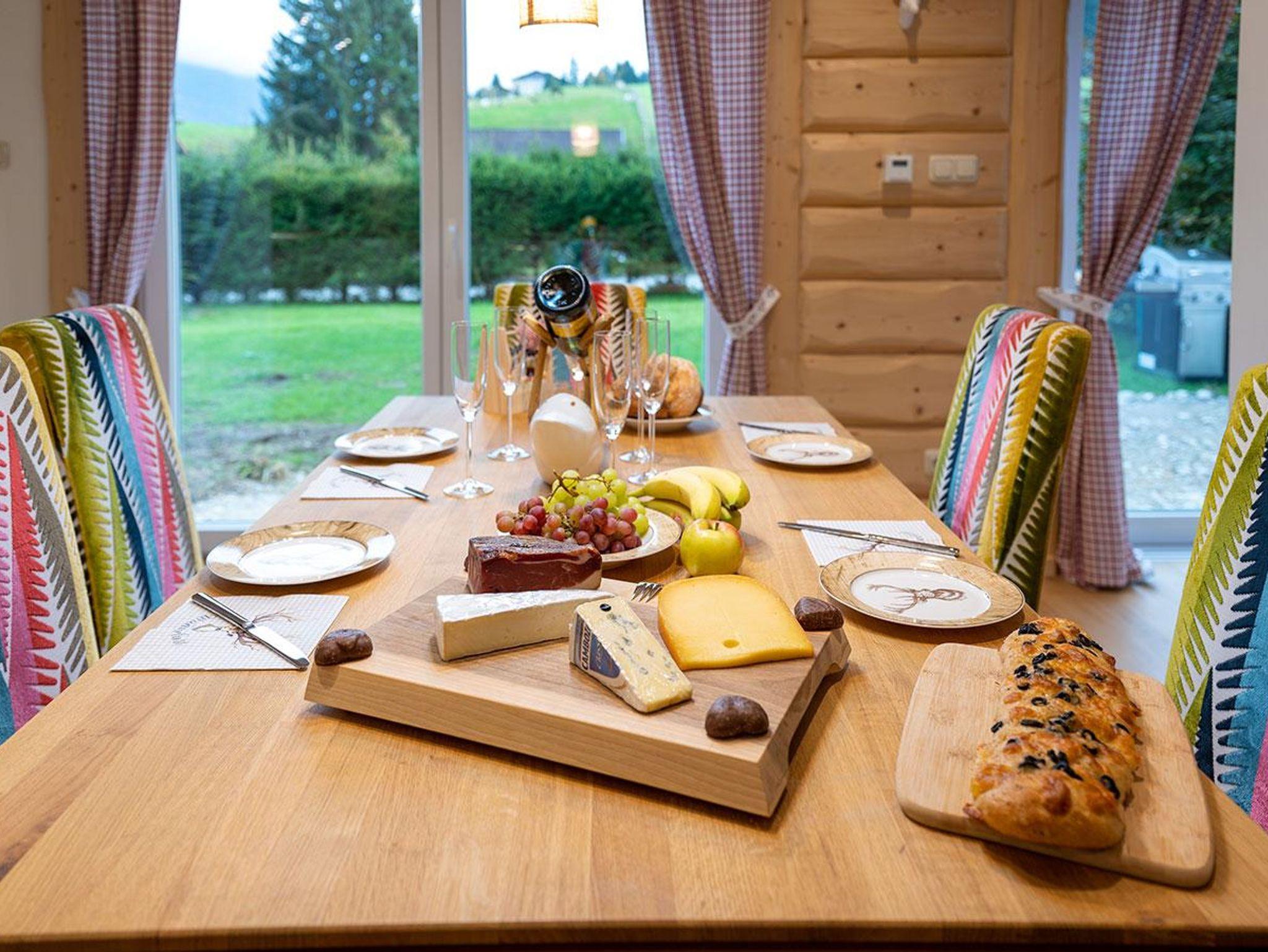 Das Chalet verfügt über drei Schlafzimmer mit großen Kingsize-Doppelbetten (180 cm Breite) und ein Einzelzimmer, jeweils mit eigenem Fernseher. Der helle, freundliche Flur führt ins großzügige Wohnzimmer mit modernem Ecksofa und bodentiefen Terrassenfenstern. Die offene, voll ausgestattete Küche mit großem Holztisch lädt zum gemeinsamen Kochen und Verweilen ein.