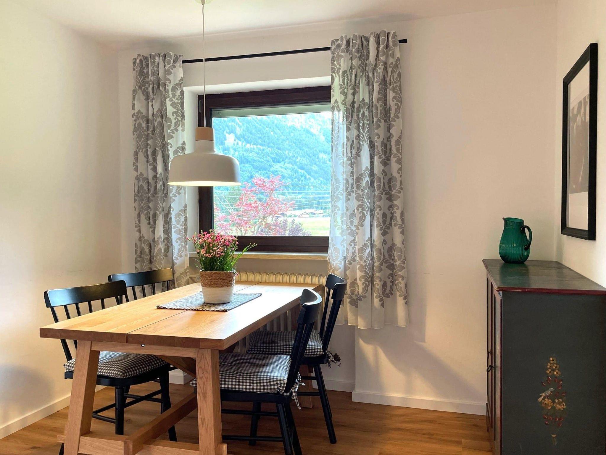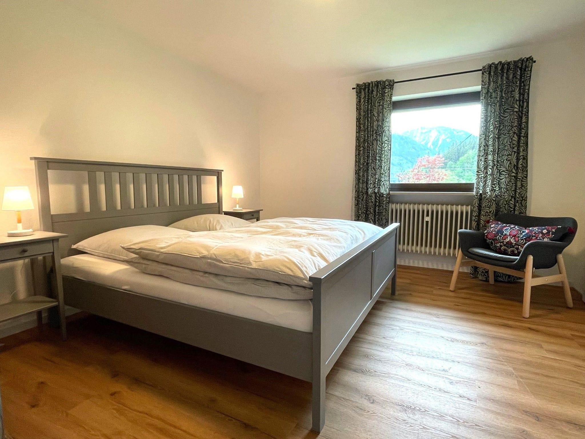 Helle, großzügige Ferienwohnung im Erdgeschoss mit sonniger Terrasse und herrlichem Bergblick. Separates Schlafzimmer mit Doppelbett, zusätzliche Schlafmöglichkeit im Wohnraum (Ausziehcouch 142 x 200). Moderne Küche mit Spülmaschine und Essplatz. Tageslicht-Badezimmer mit Dusche, separates WC. Großer Flur mit Garderobe.