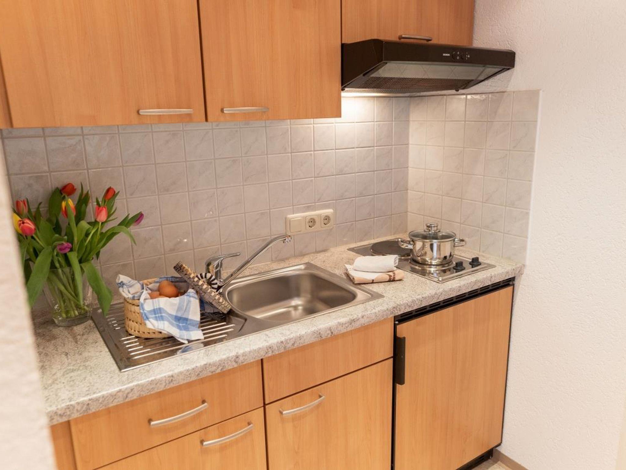2-Raum Ferienwohnung im 1. Obergeschoss, für 2 Personen, Ostbalkon, Dusche/WC, Nischenküche im Eingangsbereich, sep. Schlafzimmer mit Doppelbett, Wohnzimmer mit ausziehbarer Schlafcouch und gemütlicher Essgelegenheit, Zimmersafe, Flachbild TV, WLAN, Sauna im Haus.