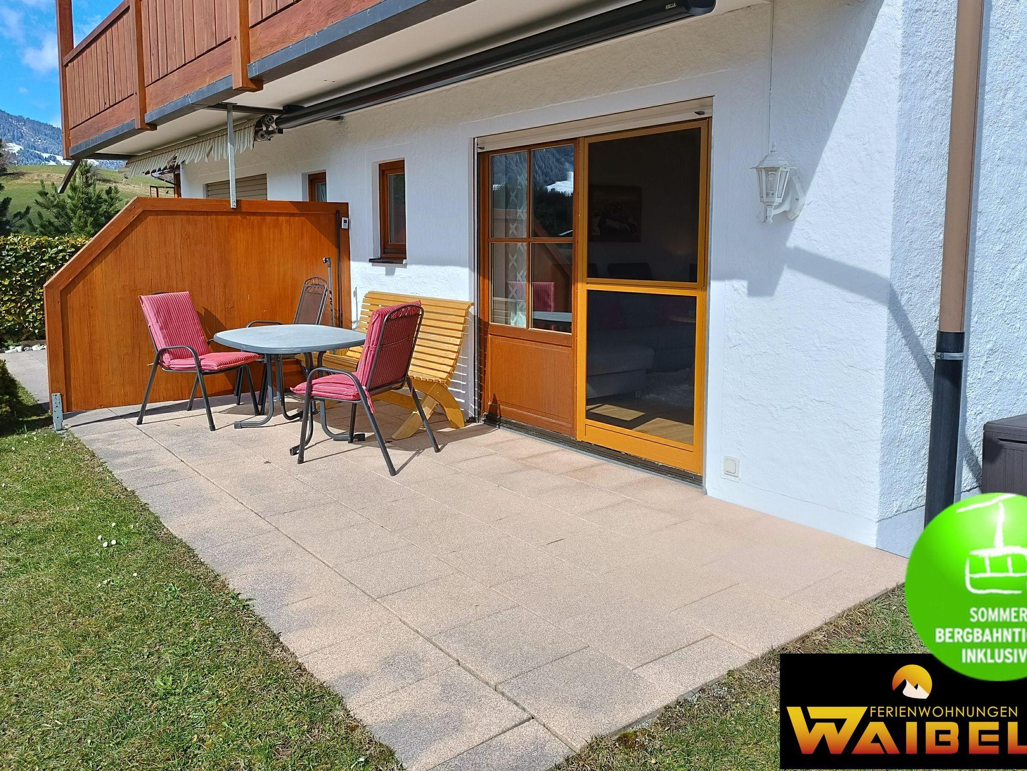 Moderne und sonnige 2-Raum Ferienwohnung, 50qm für 2-4 Personen, Küche, Bad mit ebenerdiger Dusche, Terrasse mit malerischem Bergblick, kostenloser PKW-Stellplatz am Haus, Waschkeller, WLAN, Oberstdorfer Bergbahnen von Mai-Oktober GRATIS