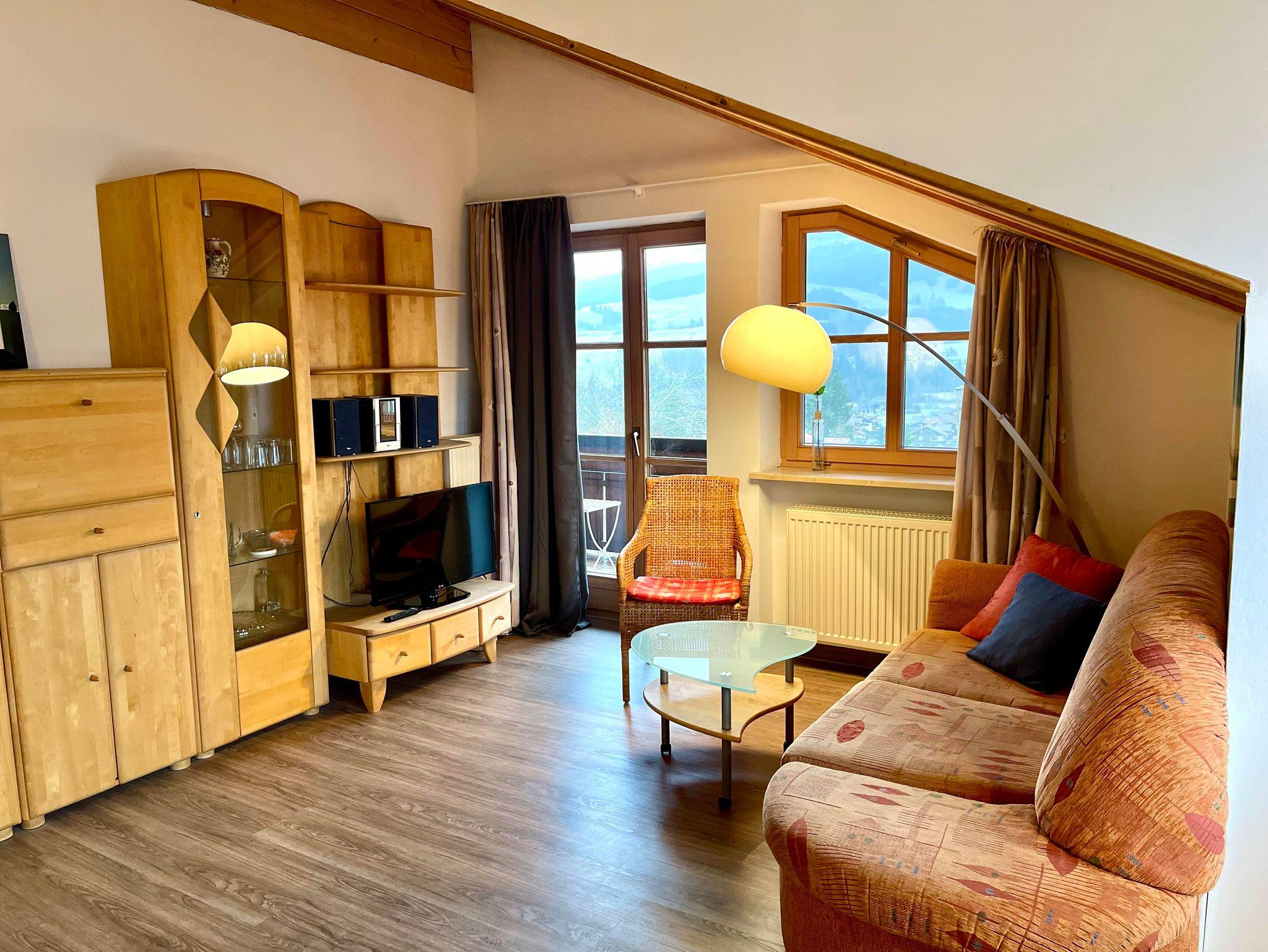 Großer Ost-Balkon mit traumhafter Sicht auf die Berge. Du/WC, Küchennische mit Spülmaschine/Mikrowelle. Kabel.-TV, Stereoanlage, W-LAN kostenlos. Sauna im Haus, Waschmaschine und Trockner
