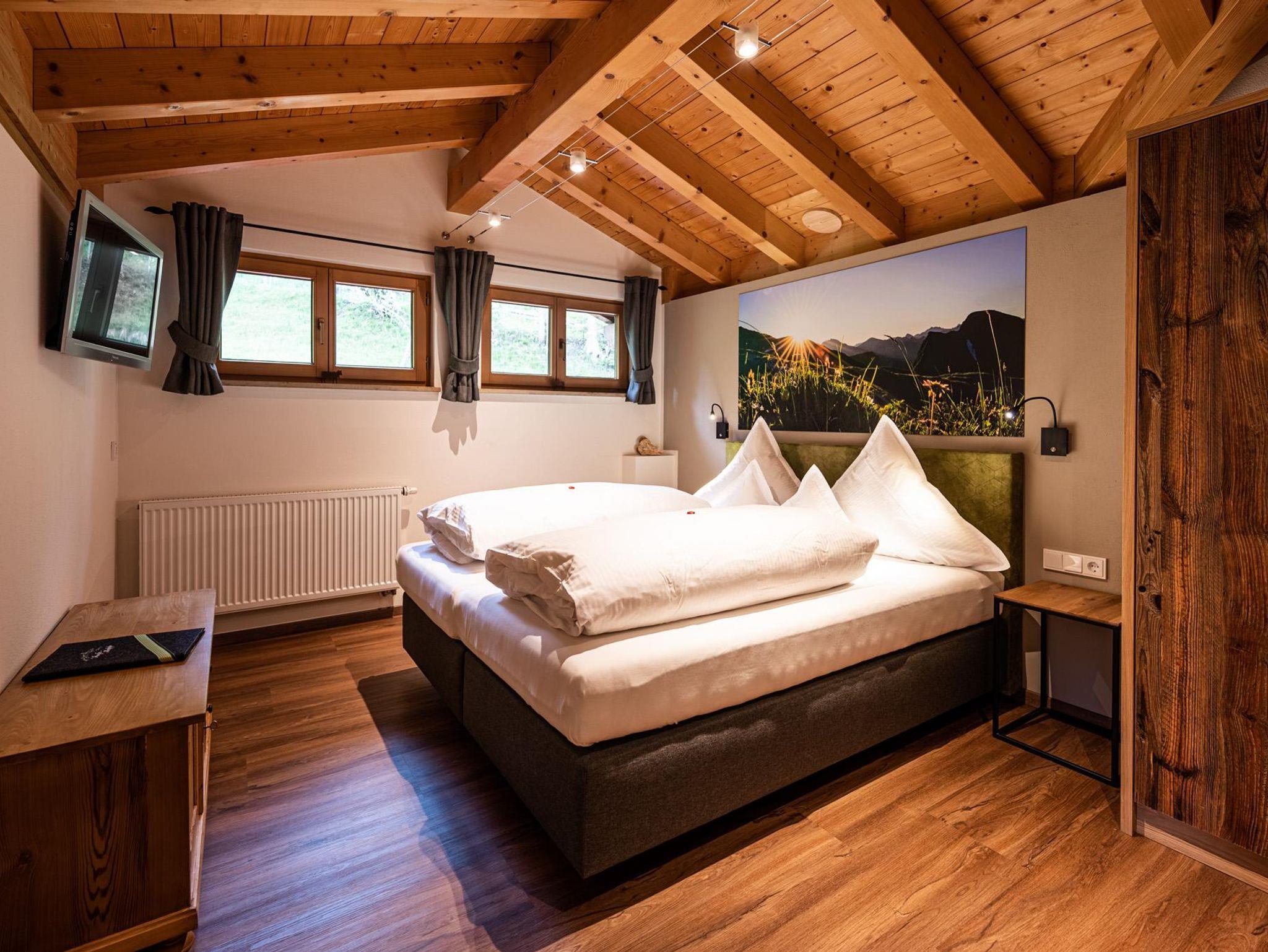 • Schalfzimmer 1 mit massgefertigten Schreinermöbeln aus sonnenverbranntem Holz, Bettrückwand aus ausgesägten Bergen mit LED-Beleuchtung, Sat-TV