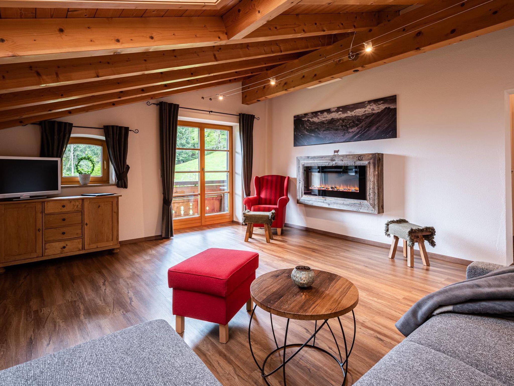 • Wohnzimmer mit gemütlichem Elektrokamin, 2 Ohrensessel, Eckcouch, Sat-TV
