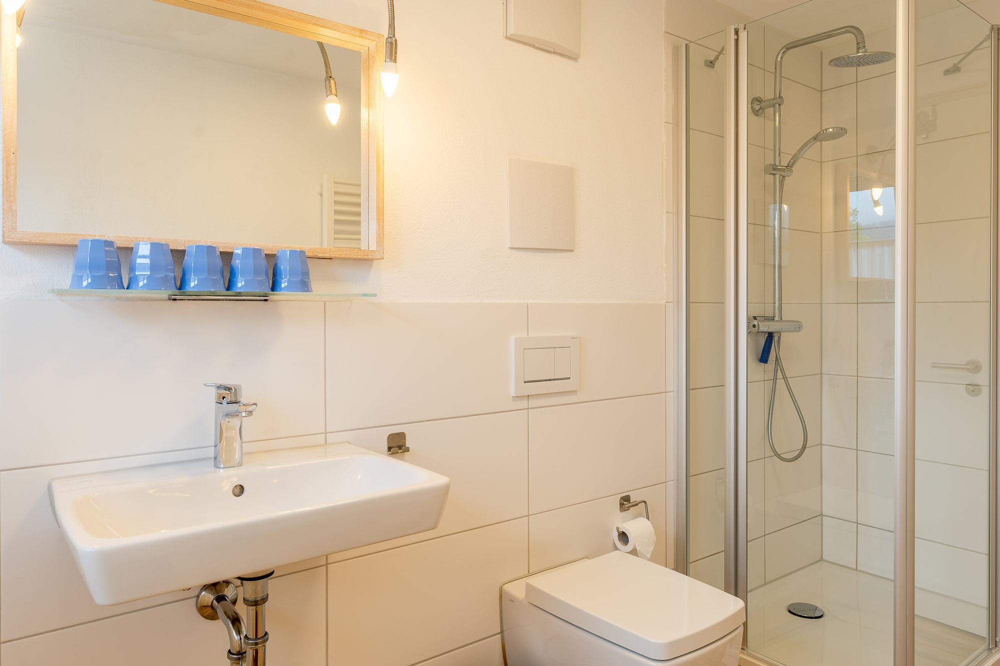 Das Tageslichtbad beinhaltet eine Dusche, ein Waschbecken und ein WC.