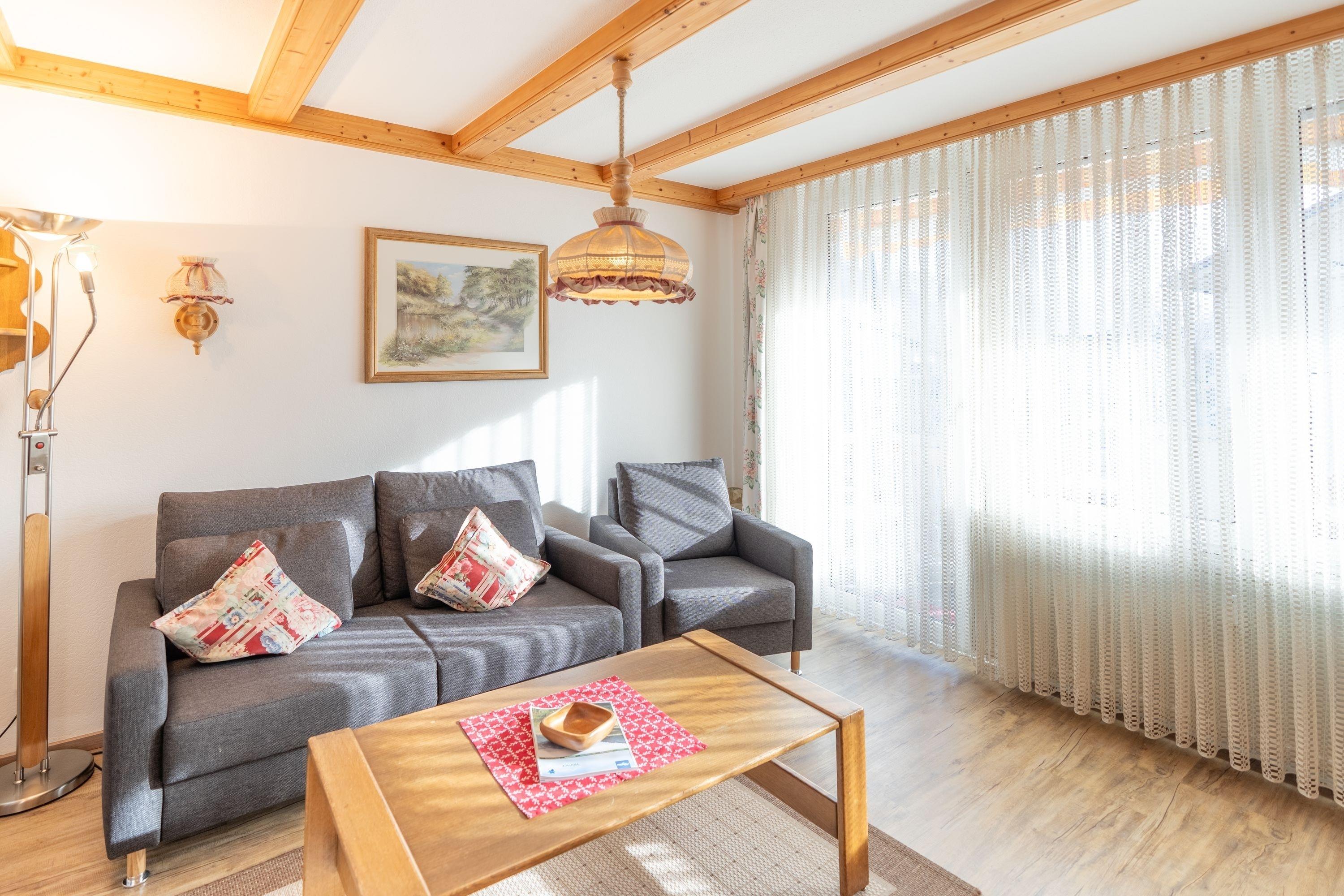 Das gemütliche Wohnzimmer verfügt über einem Sitzbereich, einem ausklappbarem Schrankbett (0,85m x 1,90m), Sat TV und Radio sowie einen Südbalkon von dem Sie einen tollen Ausblick auf das Nebelhorn und das Rubihorn genießen können.