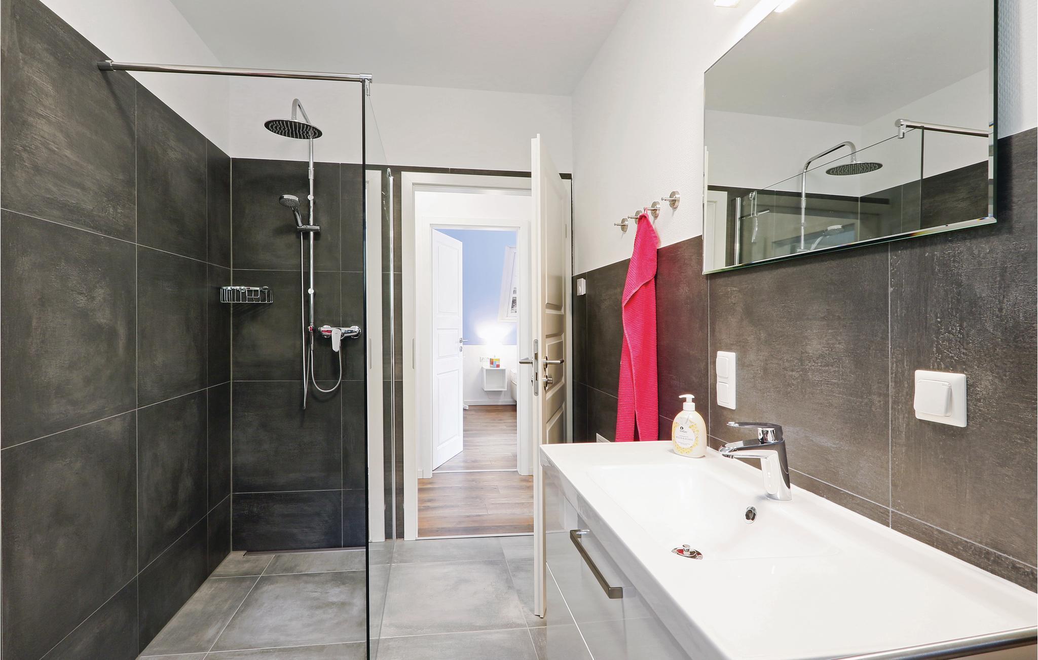 På første sal ligger S1 med en bekvem dobbeltseng, på det andet soveværelse er der to enkeltsenge, der kan skubbes sammen og en barneseng med tynd foldemadras. Det store moderne badeværelse med brusekabine ligger nær soveværelserne.