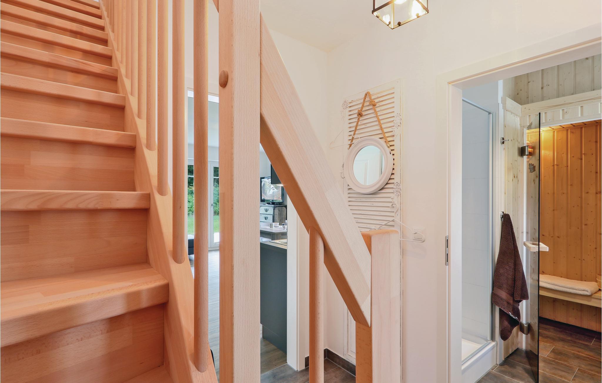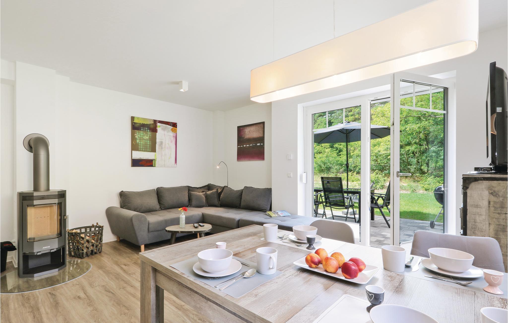I kanten af en skov finder I denne veludstyrede halvdel af et dobbelthus, der strækker sig over to etager og byder på moderne og indbydende indretning af høj kvalitet. Fra den kombinerede stue- og spisestue er der udgang til terrassen, der vender ud mod skoven og hvor I kan nyde rolige, solrige eftermiddage og aftener. På kølige dage er det dejligt at sidde i saunae og blive varm eller tænde op i brændeovnen.