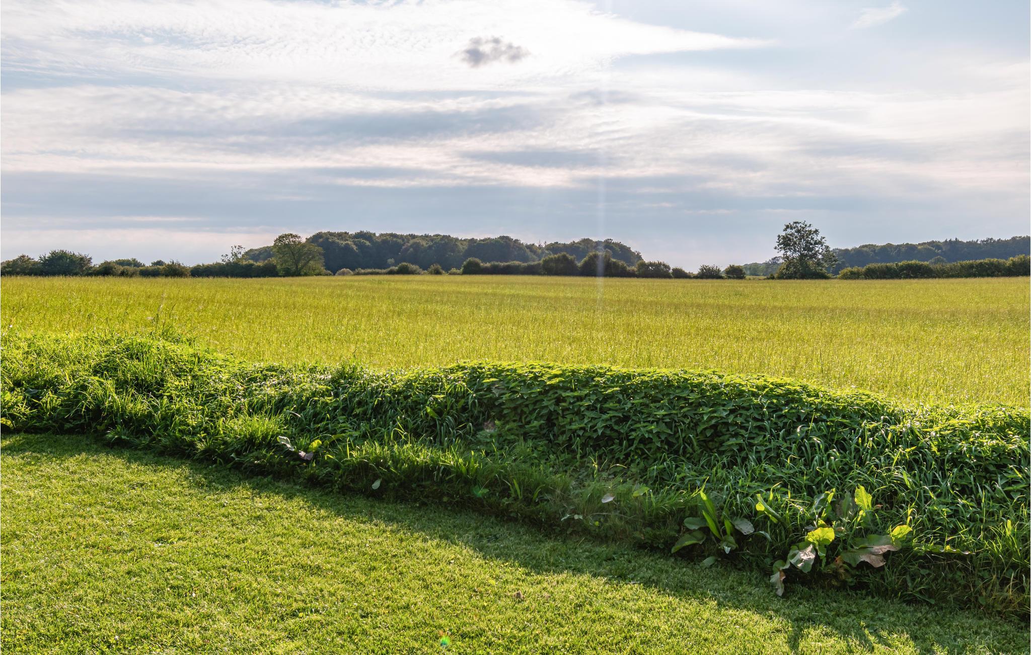 Udendørs fortsætter komforten. Læn jer tilbage på den store træterrasse, hvor I kan nyde solen, mens I er samlet om måltiderne. I kigger ud på dejlige omgivelser, for ud over græsplænen og træerne ligger grunden ud til marker og enge.