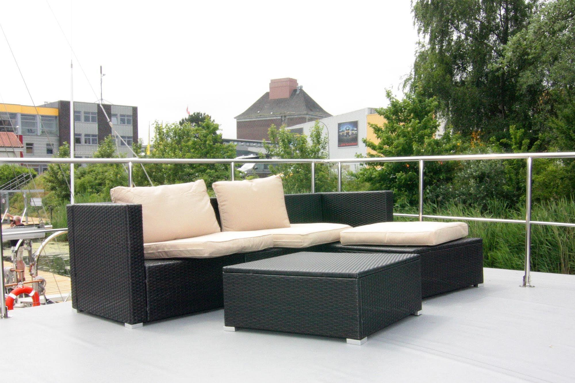 Et flydende feriehus med noget særligt: Denne moderne og smagfuldt indrettede husbåd ligger fortøjet i havnen i den historiske søfarts- og havneby Flensborg. Nyd panoramaudsigten over vandet og havnen, mens du nyder morgenmaden på terrassen. Tagterrassen er et fantastisk sted at slappe af i det strålende solskin. Selve husbåden imponerer med sit lyse interiør og sine generøse faciliteter. I nærheden finder du den livlige sejlhavn og en kult-currypølsebod kaldet Piratennest. Efter en slentretur gennem den smukke gamle bydel eller en havnerundfart på en passagerbåd kan du afslutte dagen komfortabelt på sofaen i din husbåd og nyde solnedgangen i horisonten. Nyd den fineste maritime havnestemning i rombyen Flensborg med en slentretur langs havnepromenaden eller gennem den gamle bydel, der er oversået med mange historiske bygninger og smukke kirker. I sommermånederne bringer Nordermarkt med sine gadecaféer og restauranter et middelhavspræg til fjordbyen. Du bør også altid have tid til en afslappende pause med udsigt over vandet og en lækker fiskesandwich efter en omfattende shoppingtur på Slesvig-Holstens længste shoppinggade. Højdepunkter inkluderet: Strøm Wi-Fi Aktiviteter i nærheden: En afstikker til Holnis-halvøen, cirka 15 kilometer væk, er bestemt umagen værd. Den strækker sig nordpå fra Glücksburg ud i Flensborg Fjord og repræsenterer den nordligste spids af den tyske Østersøkyst. Her finder du et naturreservat på cirka 400 hektar, som du kan udforske på velmarkerede vandrestier med enestående udsigt over Flensborg Fjord og ind i Danmark. Et sandt paradis for fuglekiggere, naturelskere og planteelskere. Også på halvøen, ud mod den ydre fjord, ligger den smukke, fine sandstrand Holnis "Drei" med sin cirka tre kilometer lange, naturlige promenade. Denne bade- og spastrand betragtes som den smukkeste strand ved Flensborg Fjord. Nyd den vidunderlige panoramaudsigt over Flensborg Fjord og Østersøen, helt til vores danske naboer. Øl-elskere bør ikke gå glip af et besøg på Flensborg Bryggeri, og en dagstur til LEGOLAND i Billund vil helt sikkert glæde de yngre gæster. Vigtig bemærkning: Linnedpakker er ikke inkluderet i lejeprisen. Disse kan bookes på forhånd som en mulighed, hvis det er nødvendigt!