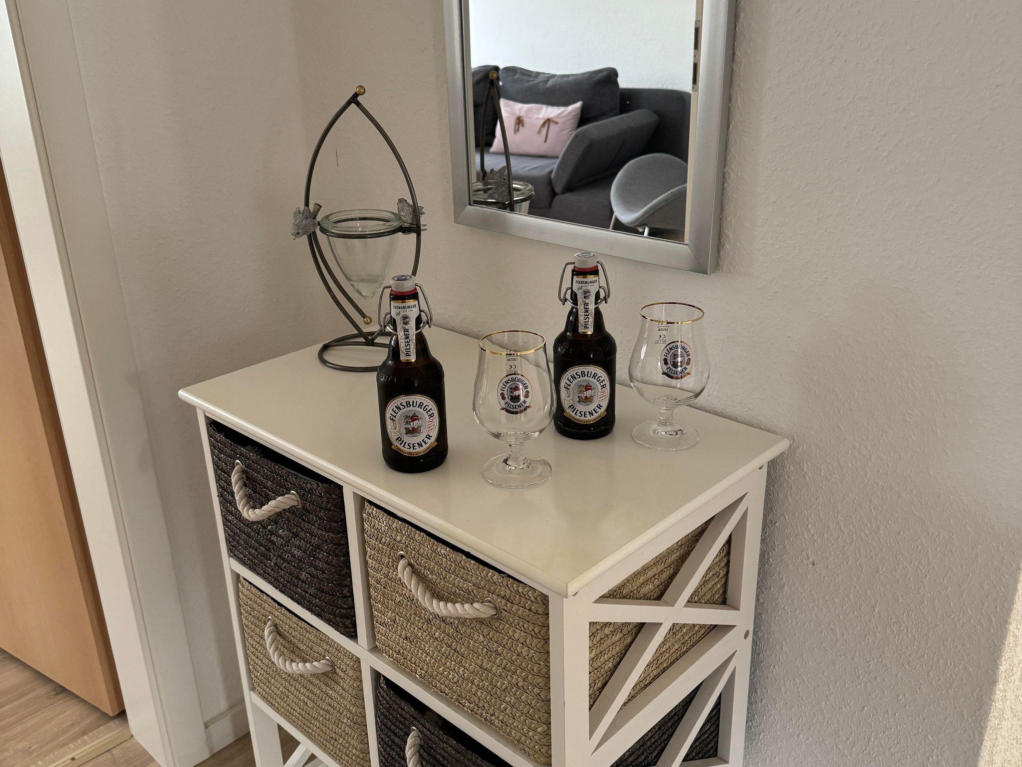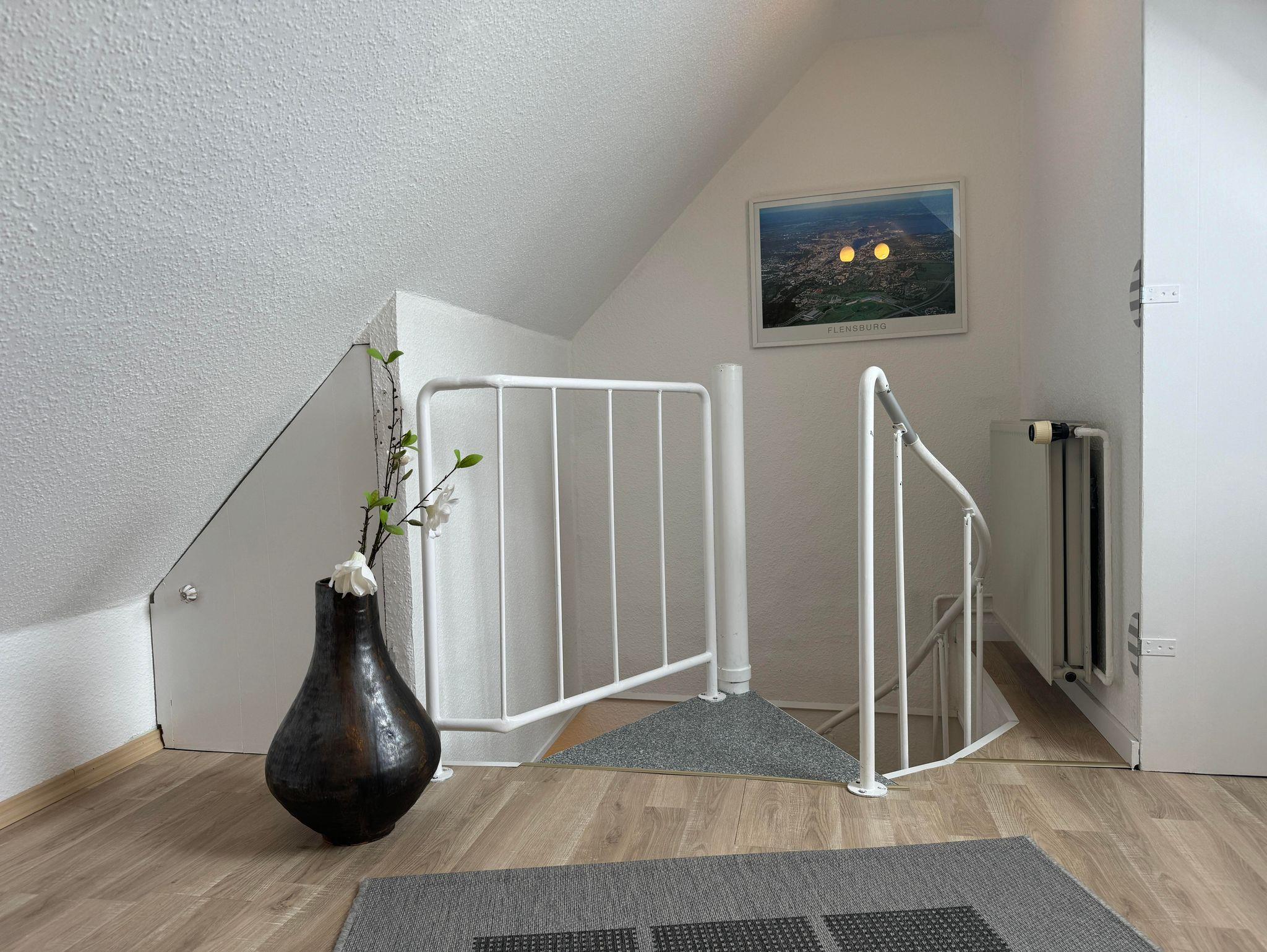 Moin Moin und herzlich Willkommen in der Fördewelle. Unsere Ferienwohnung liegt im Stadtteil Engelsby im Osten Flensburgs. Sie befindet sich im 1.Stock des Hauses und erstreckt sich über eine weitere Ebene ins Schlafzimmer, dass über eine schmale Wendeltreppe zu erreichen ist(s. Bild). Die Wohnung ist von uns liebevoll und modern eingerichtet, Wohnzimmer und Dachterrasse in Südwest Lage, sie ist für max 3 Personen ausgestattet. Die 3. Person schläft im Wohnzimmer auf der ausziehbaren Schlafcouch.