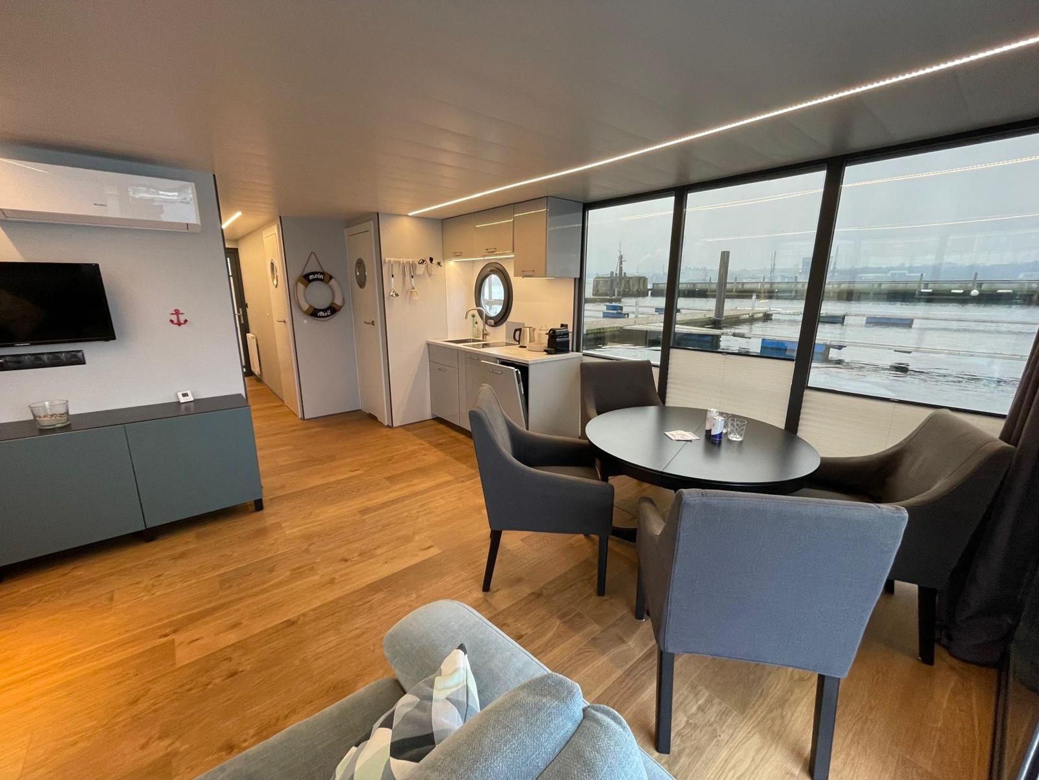 Dieses großzügige festliegende Hausboot bietet Ihnen auf 63 qm Bootsfläche den ganzen Komfort einer modernen und hochwertigen Ferienwohnung mit Sonnen- und Dachterrasse. Im gemütlichen Wohnraum mit Wohnküche lässt es sich entspannt auf der Couch verweilen oder Sie kommen am großzügigen Tisch zu einem leckeren Essen oder Spieleabend zusammen.