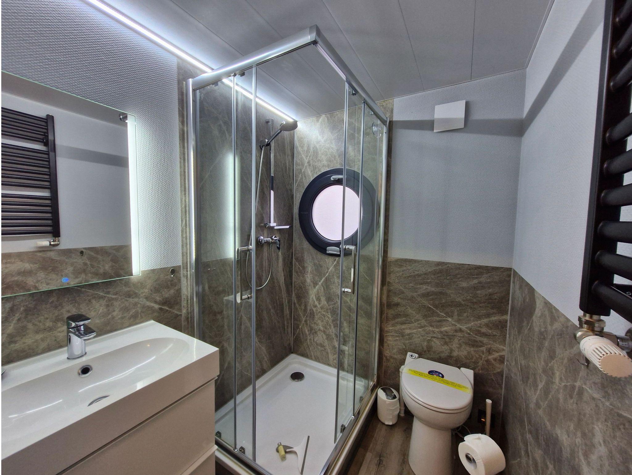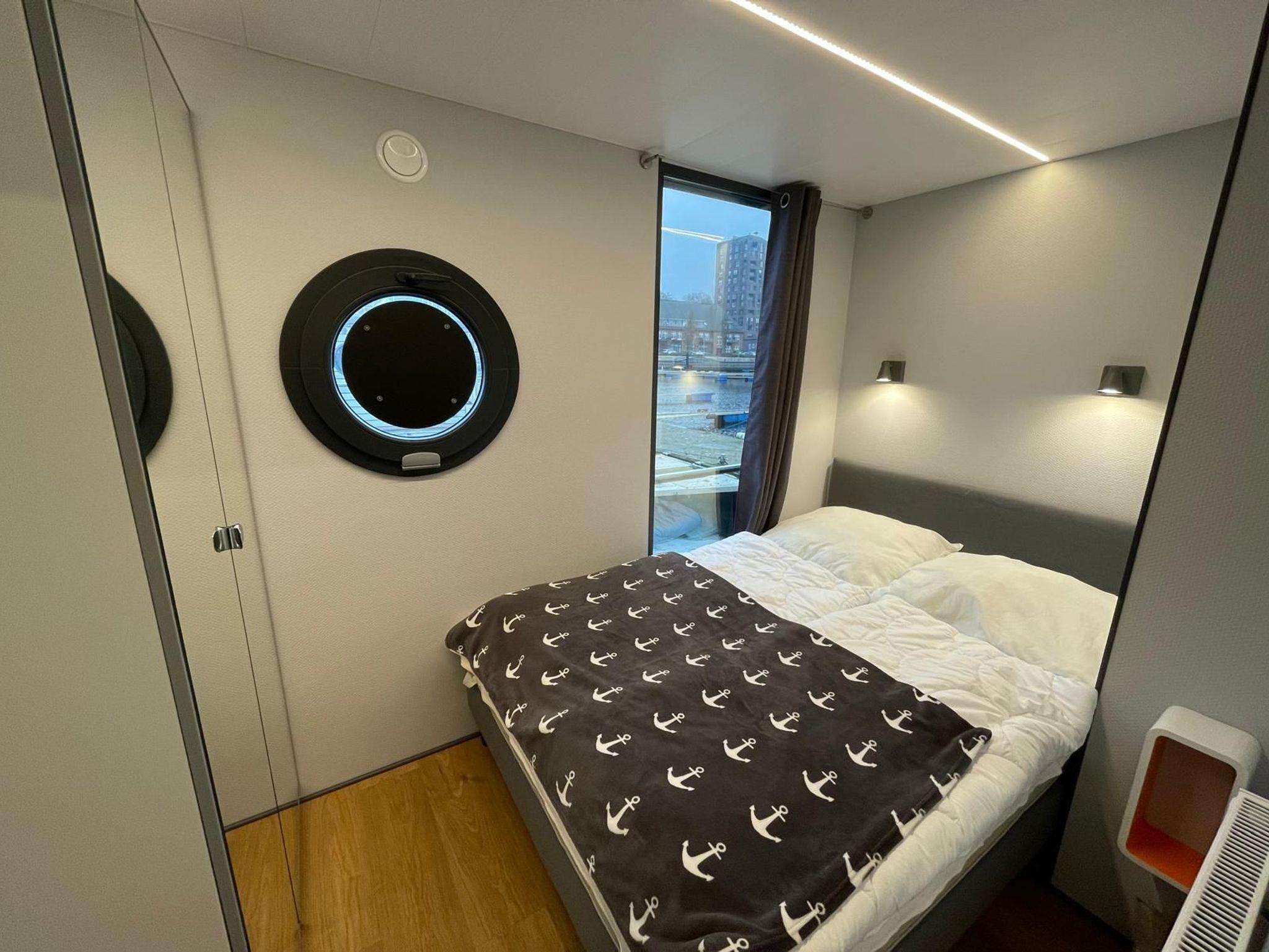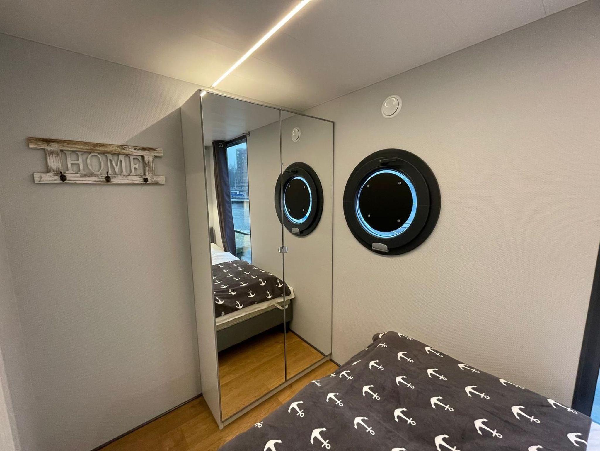 Im Inneren des Hausbootes finden Sie neben dem Wohnraum mit Fußbodenheizung für kalte Tage zwei Schlafräume mit je einem Doppelbett sowie ein modernes Duschbad. Genügend Stauraum finden Sie in den Schränken in den jeweiligen Räumen.