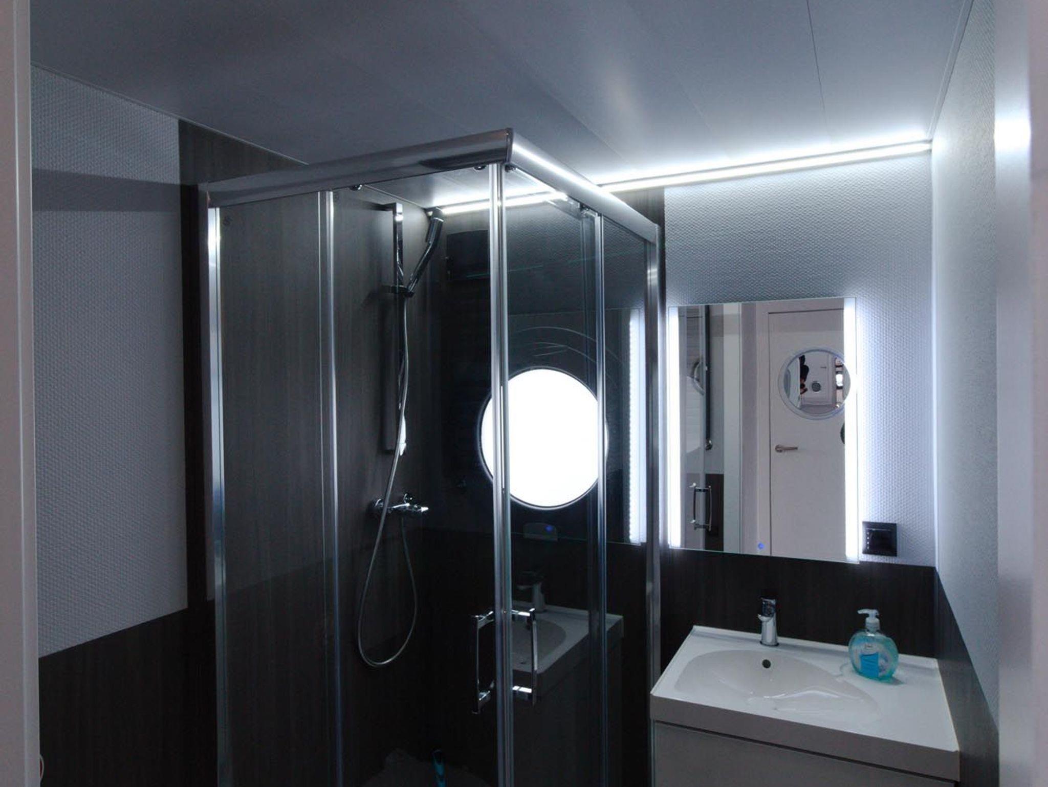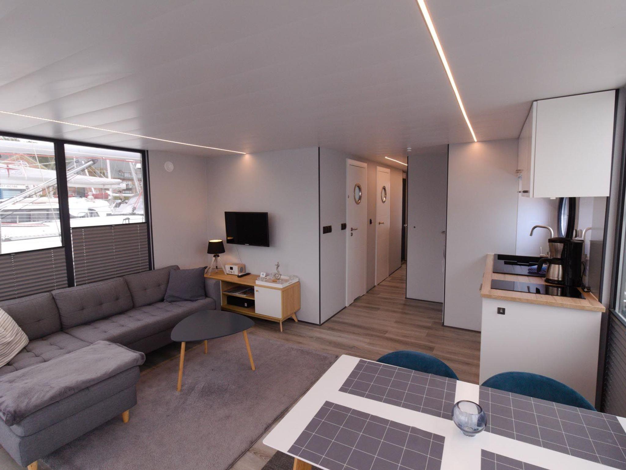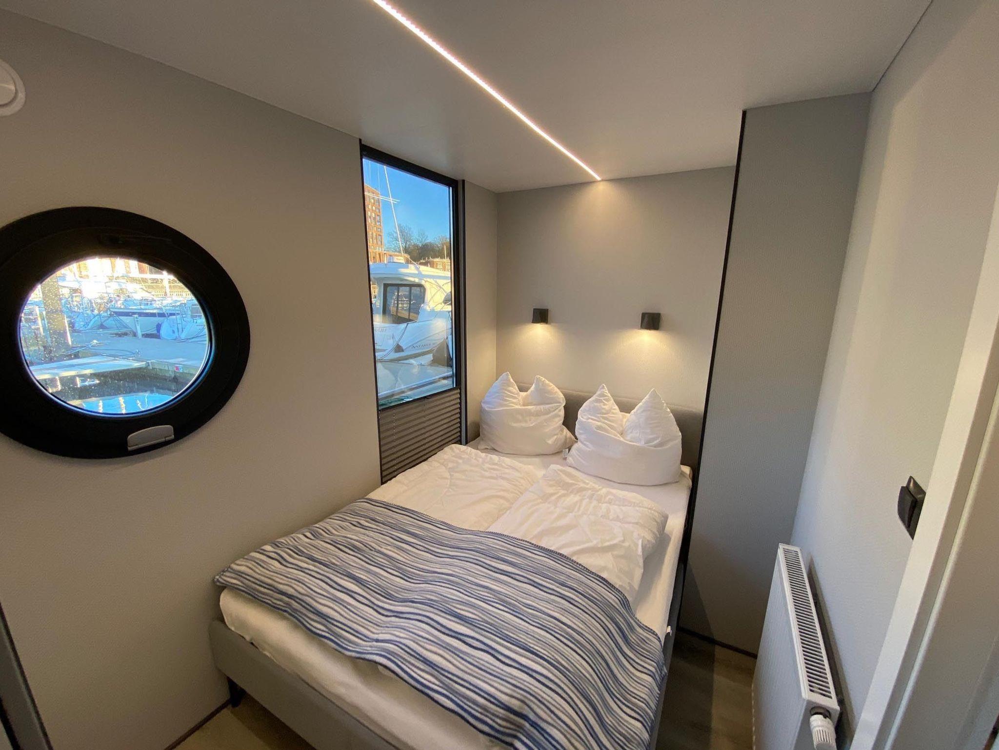 Im Inneren des Hausbootes finden Sie neben dem Wohnraum mit Fußbodenheizung für kalte Tage zwei Schlafräume mit je einem Doppelbett sowie ein modernes Duschbad. Genügend Stauraum finden Sie in den Schränken in den jeweiligen Räumen.