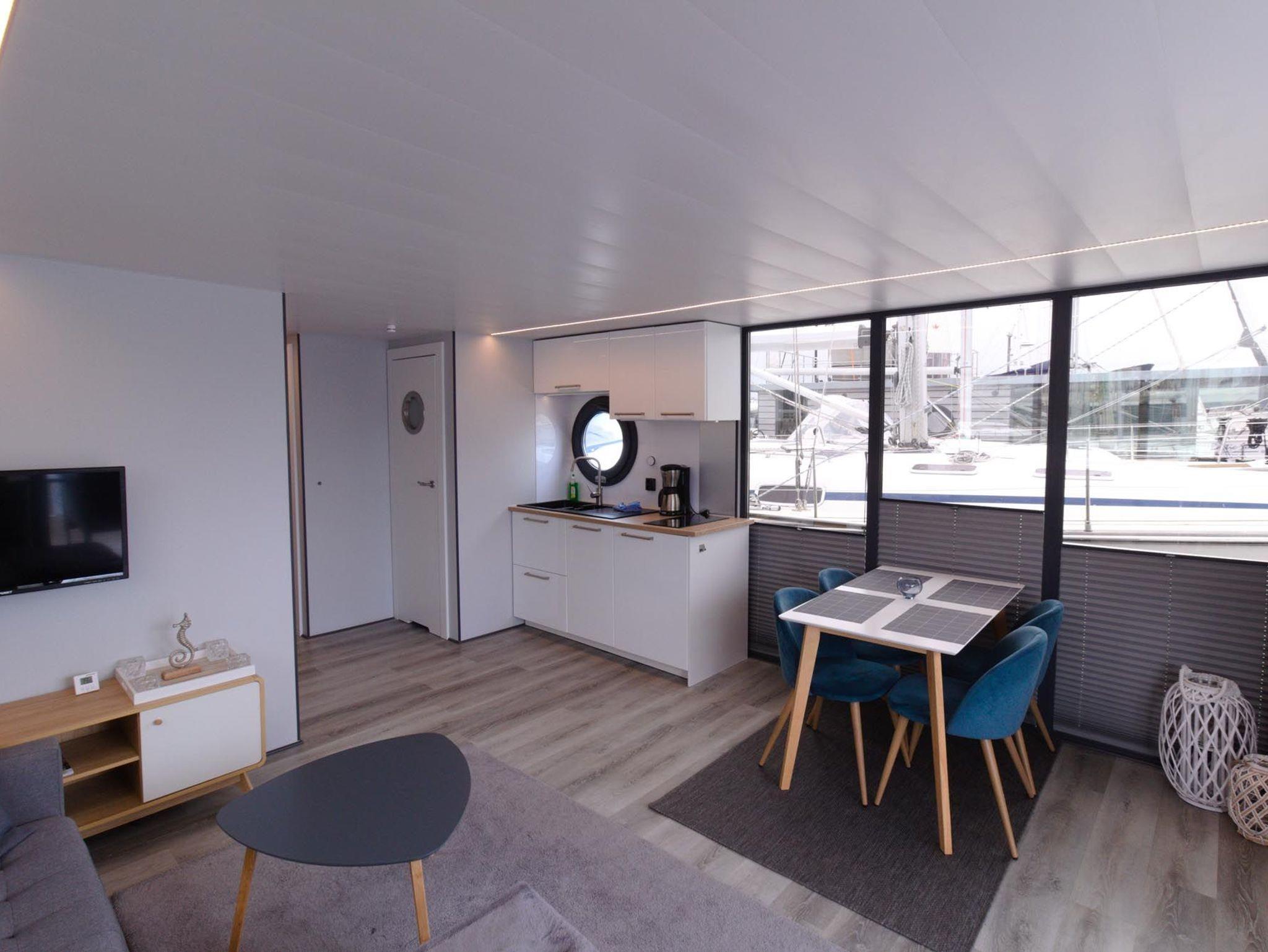 Dieses großzügige festliegende Hausboot bietet Ihnen auf 63 qm Bootsfläche den ganzen Komfort einer modernen und hochwertigen Ferienwohnung mit Sonnen- und Dachterrasse. Im gemütlichen Wohnraum mit Wohnküche lässt es sich entspannt auf der Couch verweilen oder Sie kommen am großzügigen Tisch zu einem leckeren Essen oder Spieleabend zusammen.