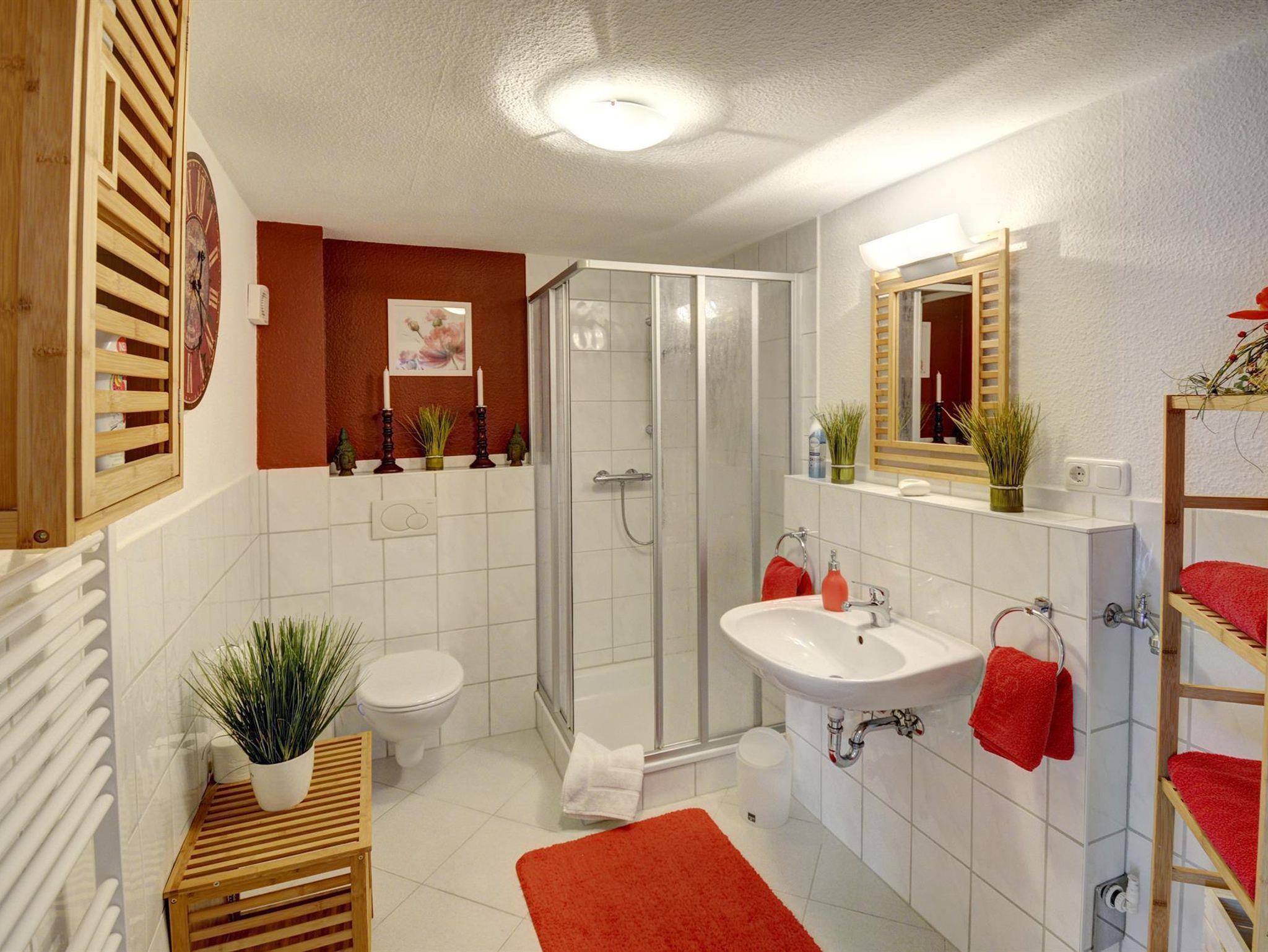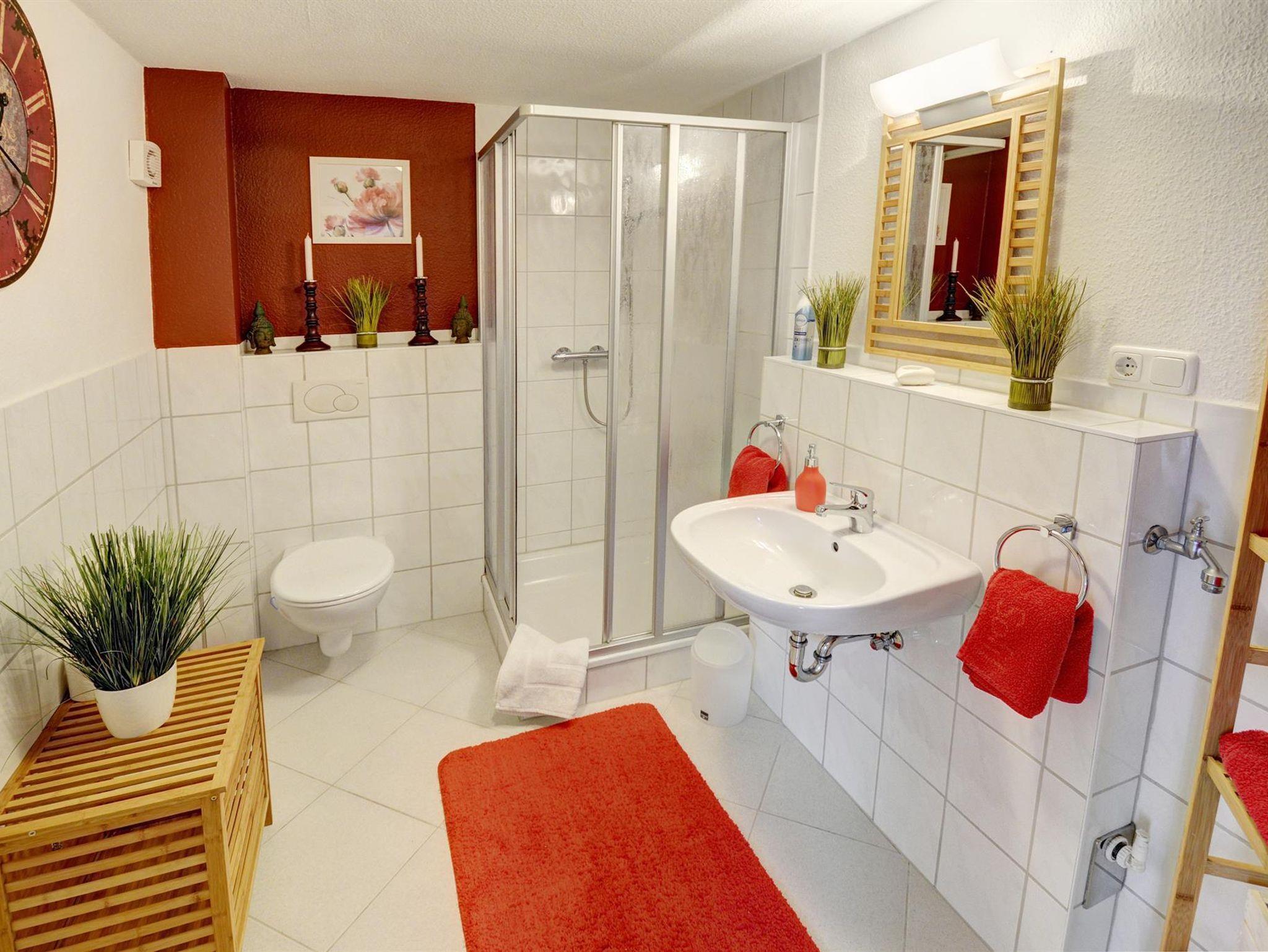 Im EG befindet sich ein schönes,geräumiges WZ mit TV, gemütlicher Sitzlandschaft,Essbereich,großer Fensterfront von wo Sie ins Grüne blicken.Die Terrasse,die man vom Wohnzimmer erreicht,ist perfekt zum relaxen.Die Küche verfügt über alles,was Sie für Ihre Auszeit benötigen.Das Bad in angenehmer Größe bietet eine Dusche.Vom Flur führt eine Raumspartreppe ins Obergeschoss,in welchem sich das Schlafzimmer mit 2 Einzelbetten befindet.