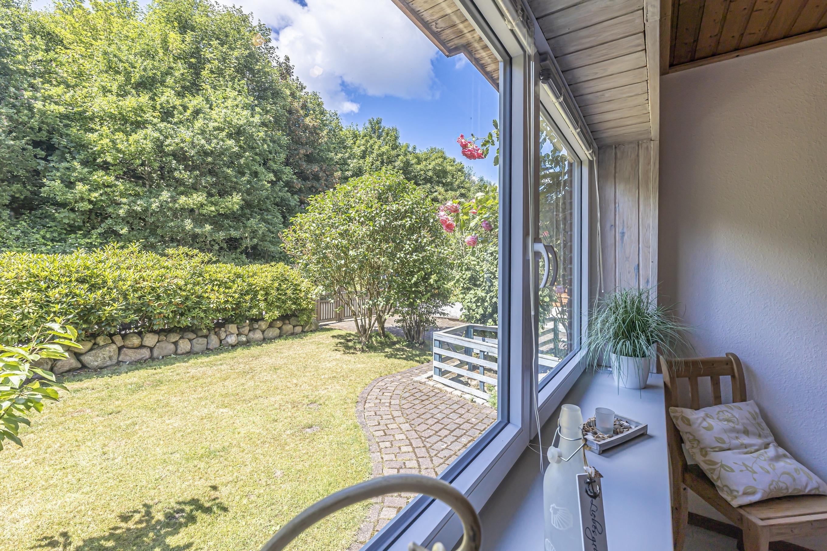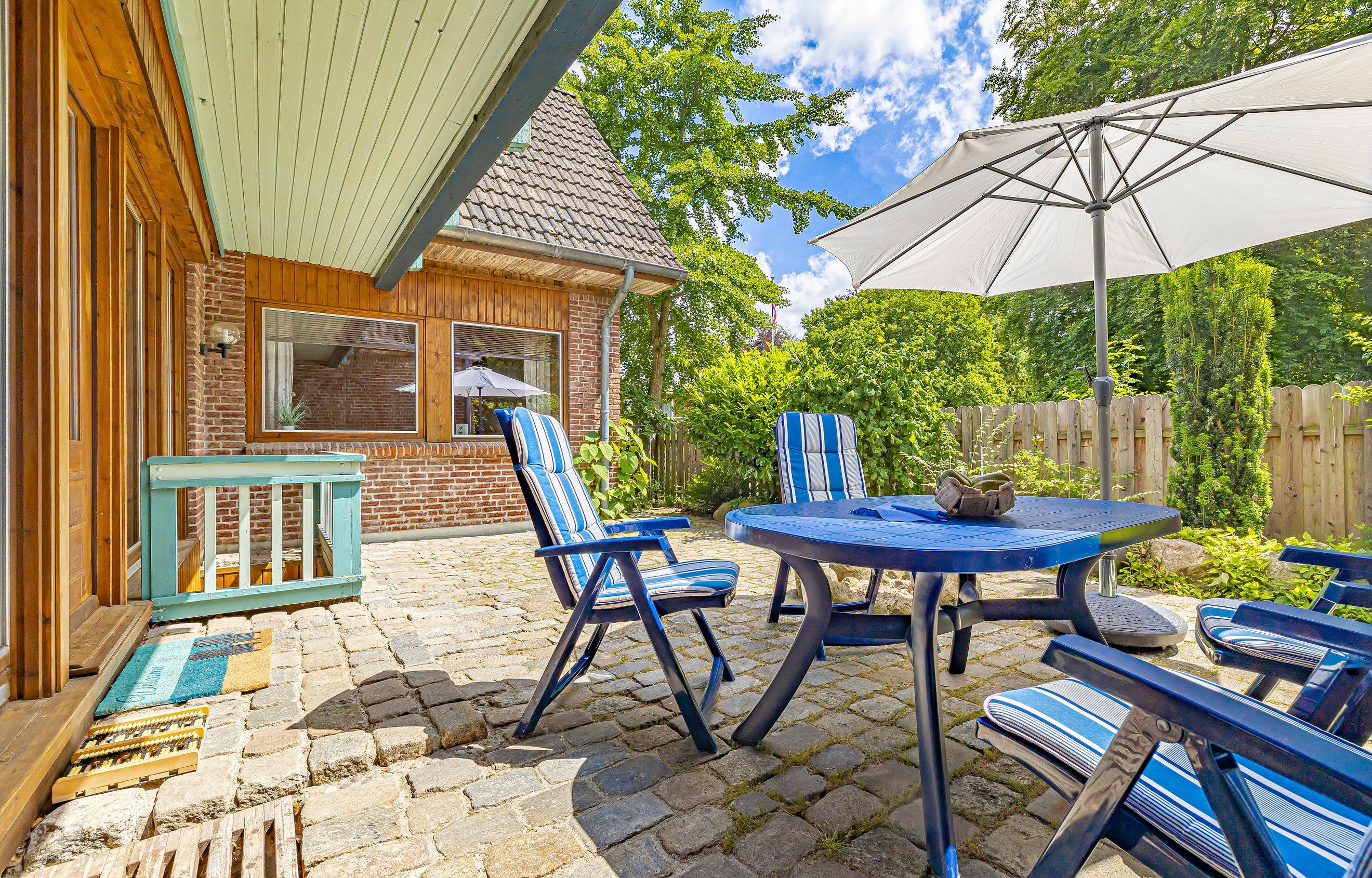 Die großzügige, möblierte Terrasse ist der perfekte Ort für ein gemütliches Frühstück im Freien oder entspannte Grillabende mit der Familie. Ein eingezäuntes Rasengrundstück bietet viel Platz zum Spielen und Toben für Kinder und Hunde. Gartenmöbel, ein Grill und ein Strandkorb stehen Ihnen zur Verfügung, um die frische Luft und die Natur zu genießen.