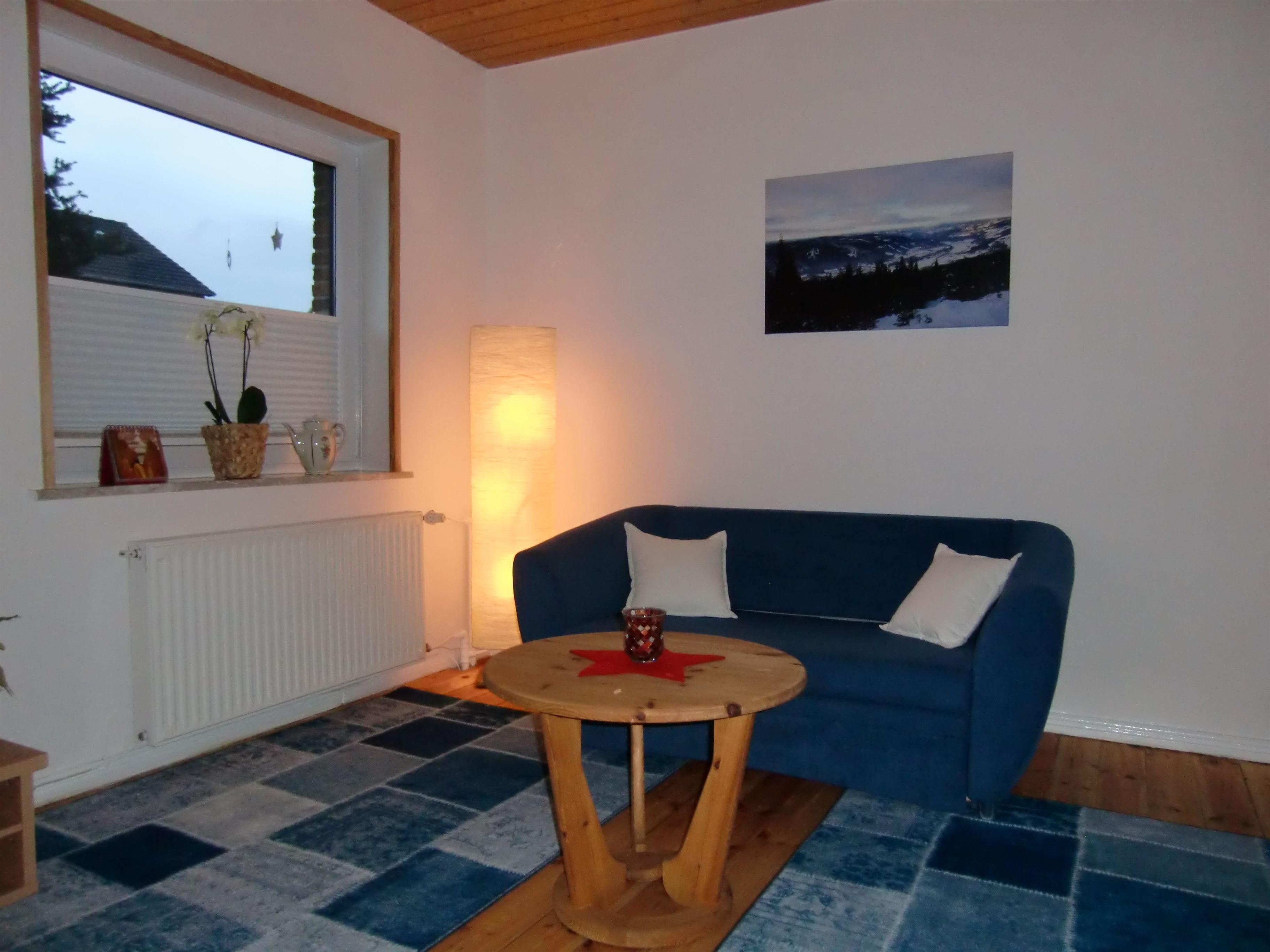 Im großem Wohnzimmer steht eine gemütliche Ecksitzgruppe mit einem Flachbildschirm, Kabel - TV und DVD - Player. WLAN vorhanden.