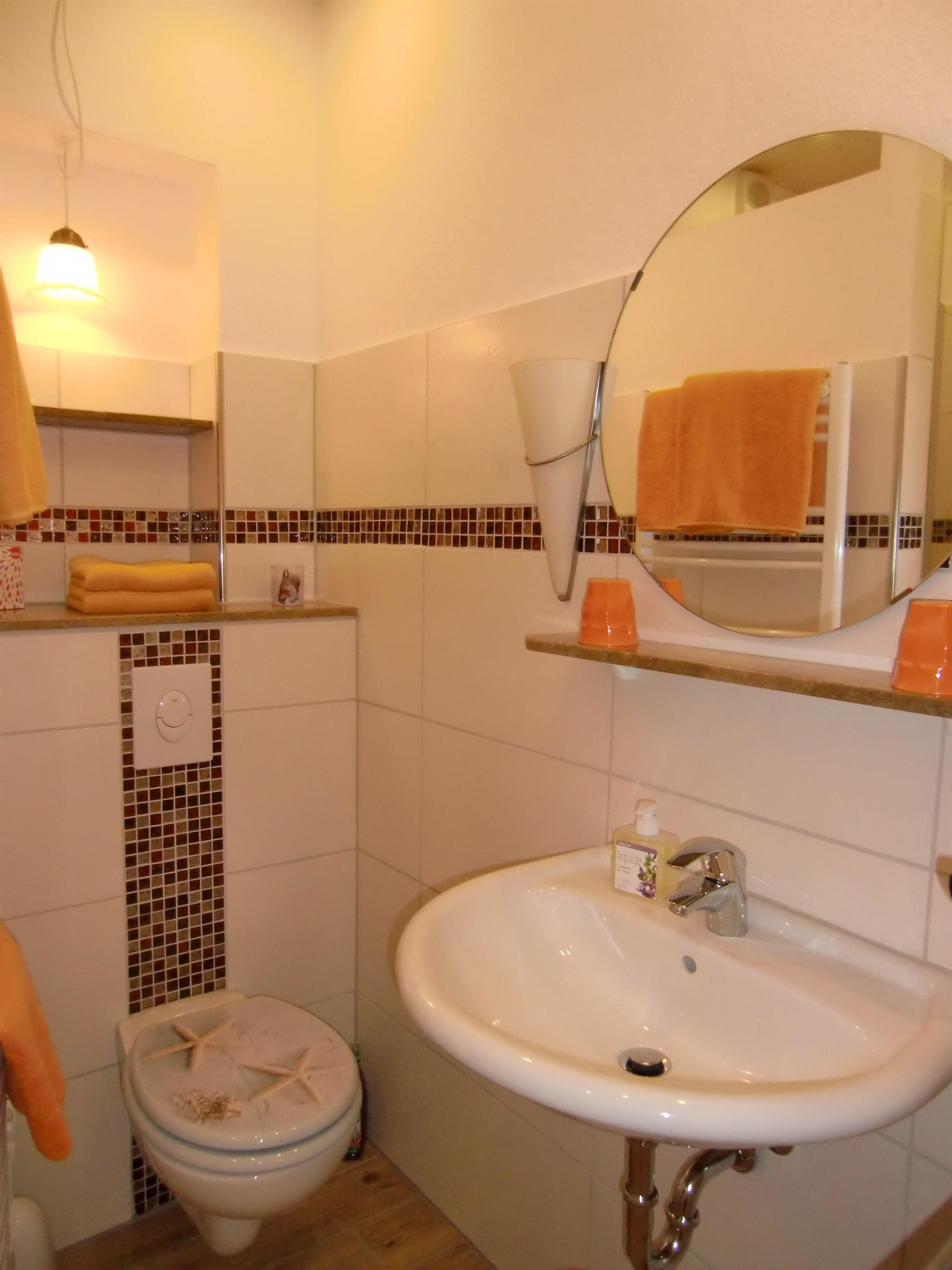 Das Duschbad besteht auch aus einer Massagebrause, einem Waschbecken, Fön, WC, Handtuchheizkörper und einer Fußbodenheizung. Im Gäste - WC befindet sich ein kleines Handwaschbecken. Der Eingangsbereich zeichnet sich durch einen langen Flur aus, von dem man das Kinderzimmer, das Wohnzimmer, das Gäste - WC, das Duschbad und die Küche erreichen kann.