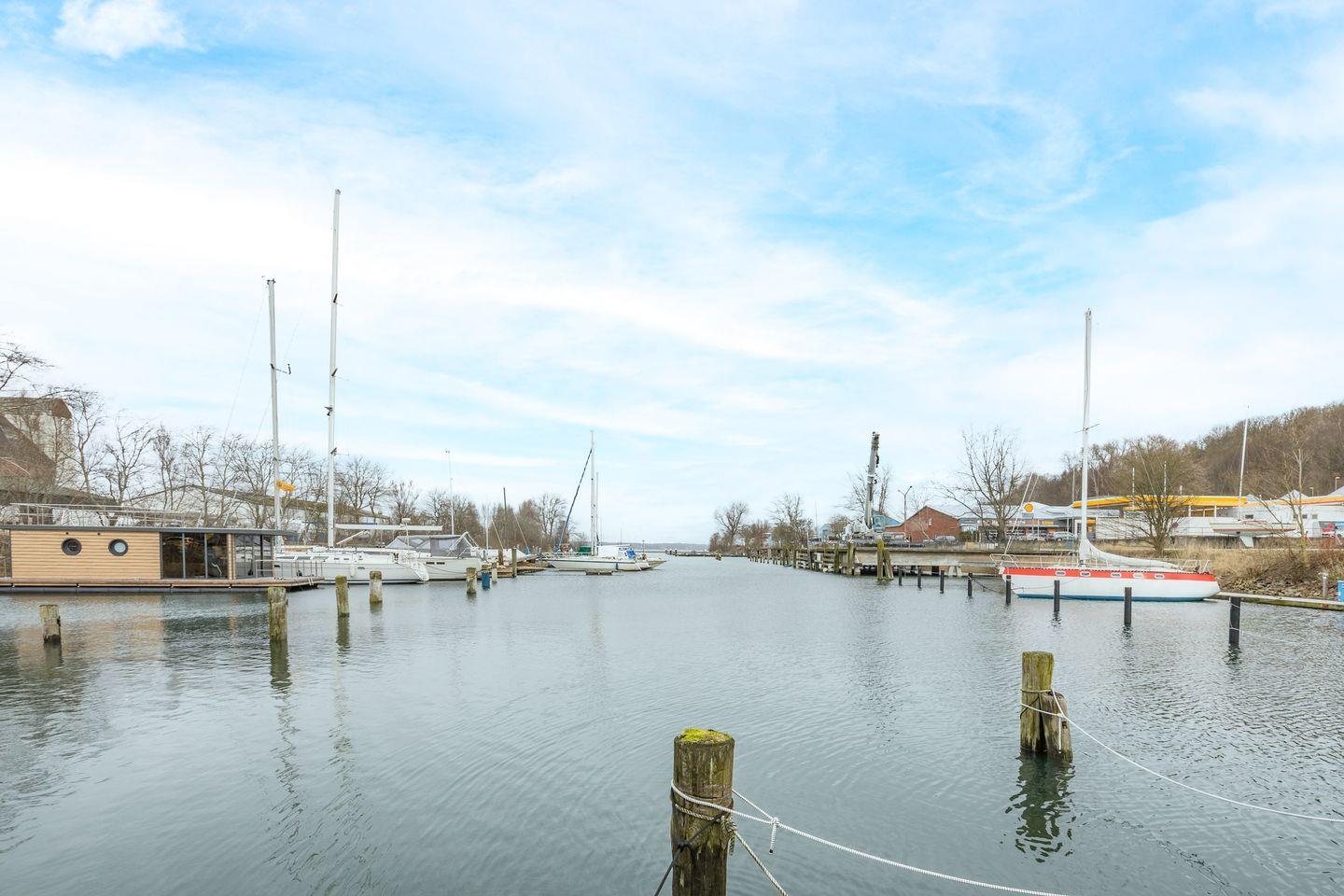 Das Hausboot Leni liegt fest verankert in einem Nebenhafen von Flensburg, ca. 800 m von der Altstadt entfernt. In der Nähe finden Sie den gut besuchten Segelhafen oder die kultige Currywurstbude, das Piratennest. Restaurants und Einkaufsmöglichkeiten sind ebenfalls fußläufig erreichbar.