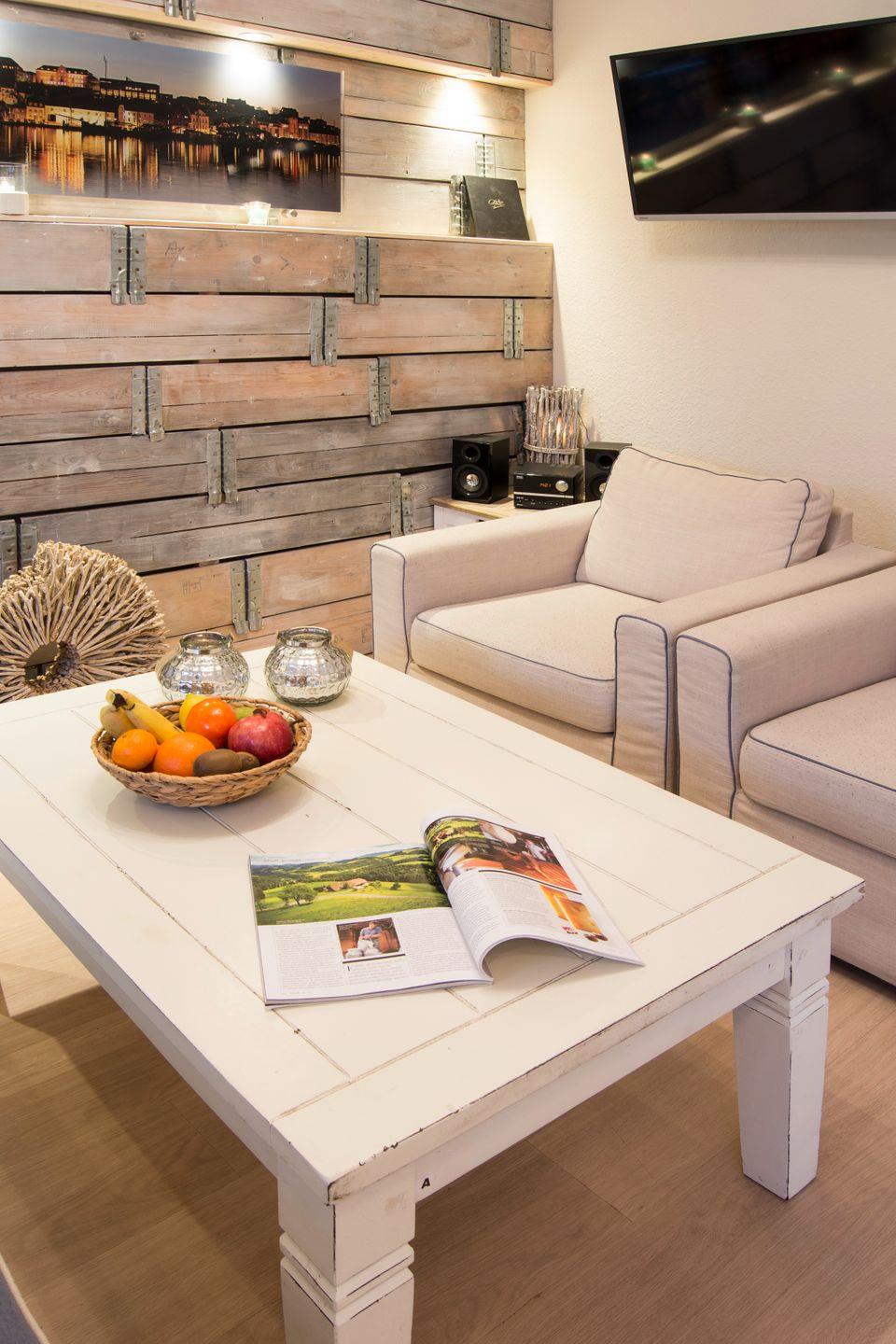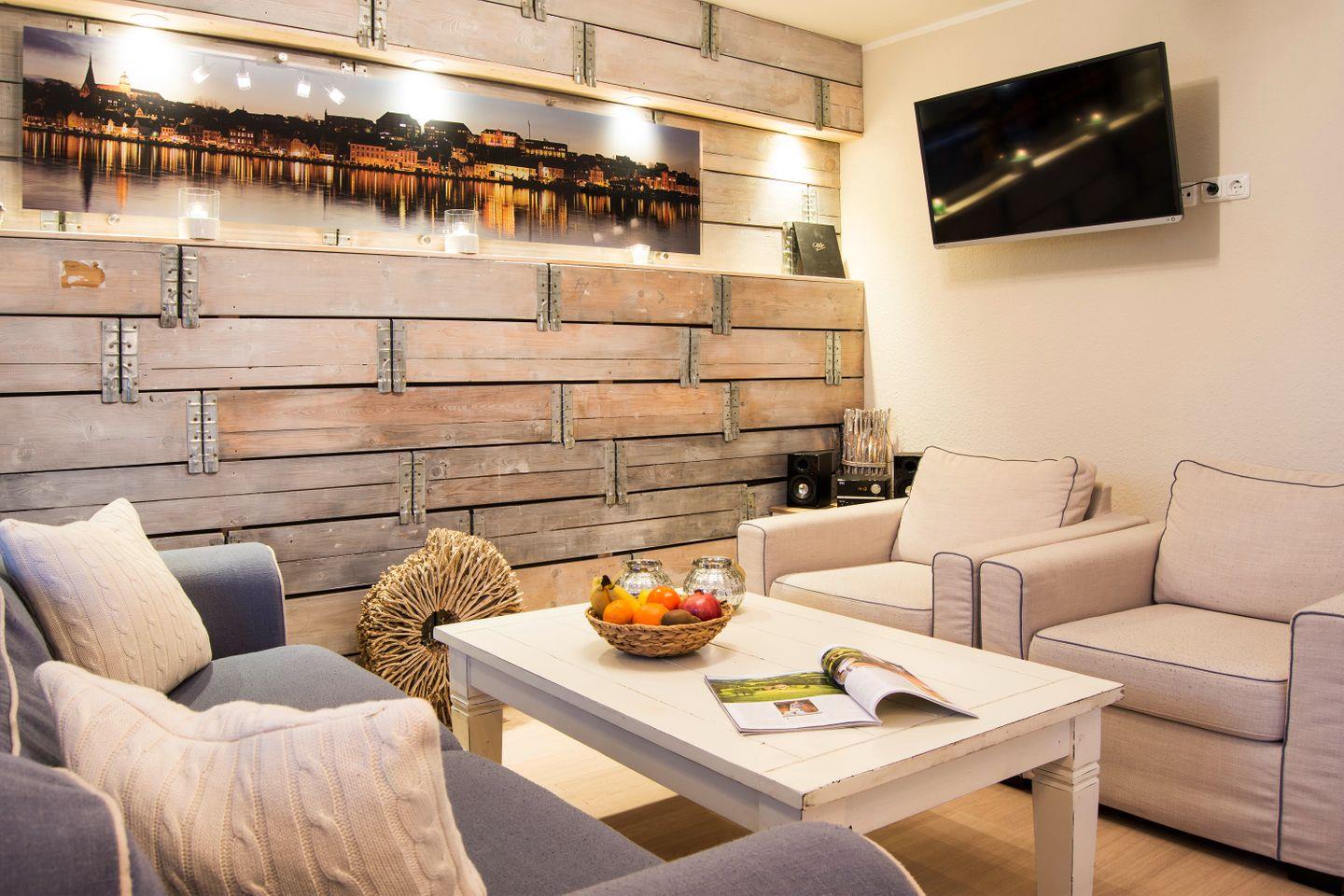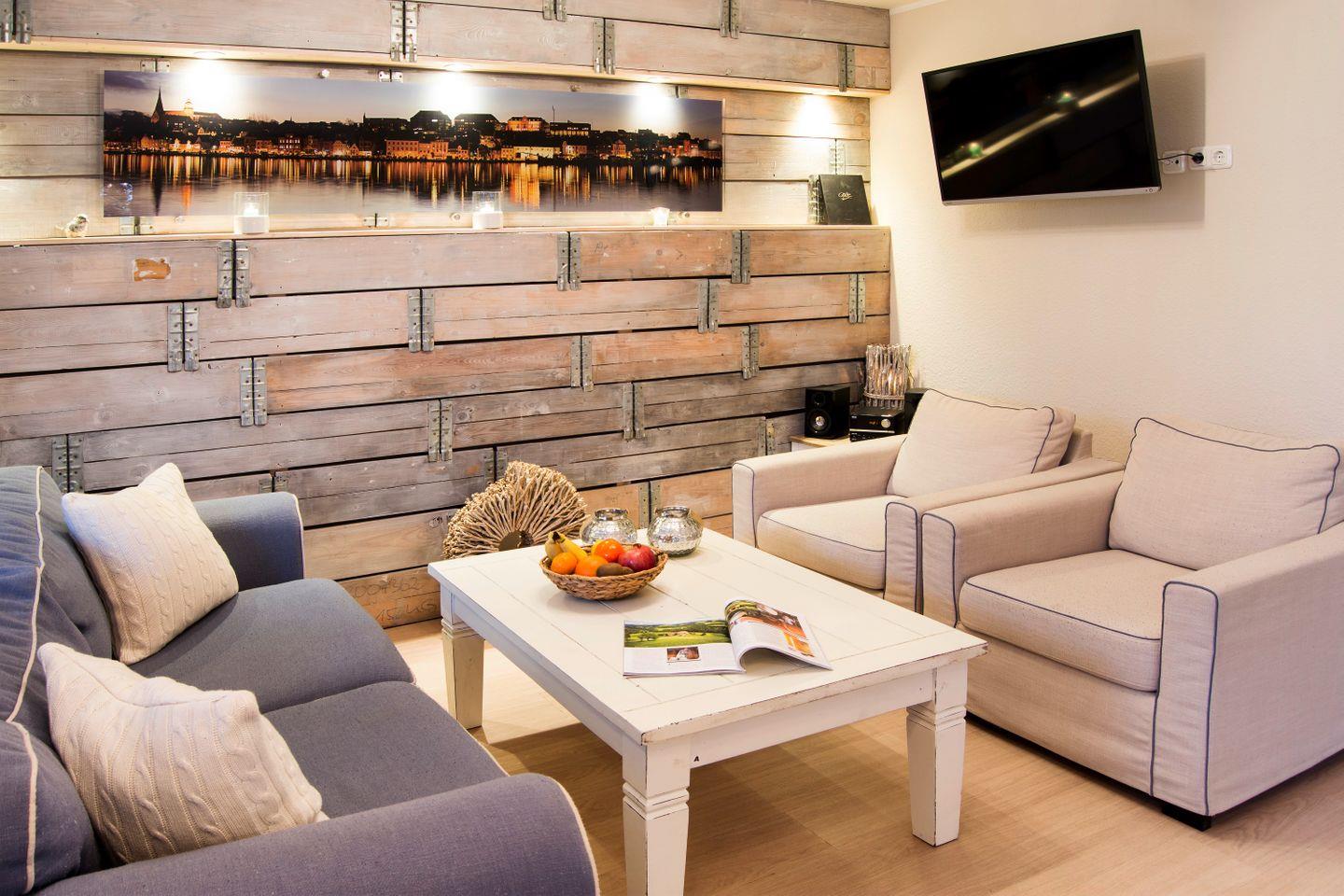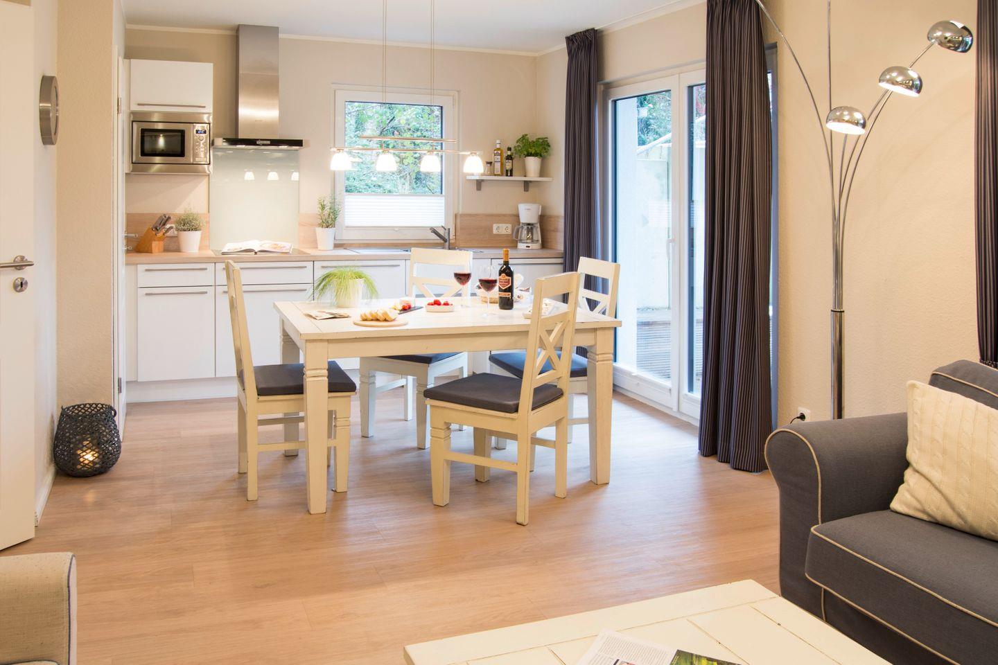 Das Ferienwohnung "Möwennest" im Erdgeschoss bietet Platz für insgesamt 4 Personen, von denen 2 im Schlafzimmer mit Doppelbett und 2 weitere auf einer hochwertigen Funktionscouch im Wohnzimmer schlafen können. Der kombinierte Wohn- und Essbereich mit einer modernen, offenen Einbauküche, hat einen Zugang zur Terrasse. Die komplette Wohnung verfügt über eine Fußbodenheizung.