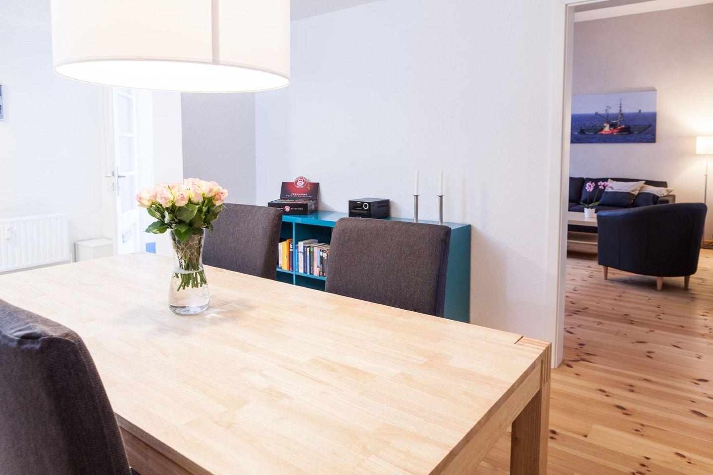 Die inmitten der Altstadt gelegene, gemütliche und im skandinavischen Stil eingerichtete Ferienwohnung erstreckt sich über 67m² und bietet Platz für 2-4 Personen. Nach Betreten der Wohnung erschließt sich Ihnen ein offener Essbereich mit einer voll ausgestatteten Küche samt Wasch- und Geschirrspülmaschine und Mikrowelle. Der Holzboden sorgt für eine gemütliche Atmosphäre. Darüber hinaus verfügt die Wohnung über ein Wohnzimmer, das mit einer Couch (mit Schlaffunktion), einem Sessel und einem TV-Bereich zu gemütlichen Abendstunden einlädt. Das Schlafzimmer ist mit großem Doppelbett, Kleiderschrank und Schreibtisch ausgestattet. Das Bad verfügt über eine Dusche. Ein Stellplatz ist vorhanden. Die Ferienwohnung "Beim Museumshafen“ ist durch ihre zentrale Lage ein idealer Ausgangspunkt für die Erkundung Flensburgs – auch zu Fuß. Der kleine Museumshafen ist nur zwei Gehminuten entfernt und lädt zu Spaziergängen an der Hafenpromenade ein. Hier finden Sie eine Vielzahl an Lokalitäten und freien Sitzgelegenheiten, bei denen Sie die Sonnenstunden genießen können. Auch die Flensburger Fußgängerzone mit etlichen Geschäften, Restaurants und Cafés ist in wenigen Minuten zu Fuß zu erreichen. Die Norderstraße zeichnet sich durch einen ganz besonderen Charme aus. In direkter Nachbarschaft können Sie das Panorama der lebendigen kleinen Straße mit den bekannten hängenden Schuhen und den zahlreichen Cafés, Bistros und Butiken genießen. Bäckereien, Eisdielen und Pizzerien laden zum Verweilen ein. Es gibt einen kleinen Bio- und Unverpacktladen und weitere Einkaufsmöglichkeiten erwarten Sie ebenfalls in fußläufiger Entfernung. Der nächstgelegene Stadtstrand – das Ostseebad – liegt etwa 10 Minuten mit dem Fahrrad entfernt. Strand, Förde, Wald und Spielplätze bieten hier attraktive Angebote und Erholungsmöglichkeiten für Jedermann. Falls Sie das Auto stehen lassen möchten, erreichen Sie in kürzester Zeit den zentralen Busbahnhof, von welchem Sie mit den öffentlichen Verkehrsmitteln nahezu jedes Ziel ansteuern können.