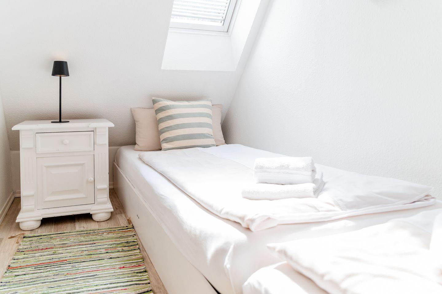 Die Treppe hinaufgehend befinden sich zwei Schlafzimmer. Im großzügigen, lichtdurchfluteten Schlafzimmer erwartet Euch ein neues, komfortables Boxspringbett (1,80 x 2,00 m), das für tiefen, erholsamen Schlaf sorgt – perfekt zum Abschalten nach einem erlebnisreichen Tag. – ebenfalls mit traumhaftem Blick auf den Flensburger Hafen. Zusätzlich bietet Euch das separate Schlafzimmer mit zwei Einzelbetten eine flexible Schlafmöglichkeit – ideal für Familien mit (größeren) Kindern.