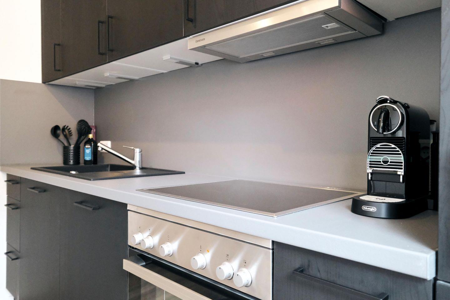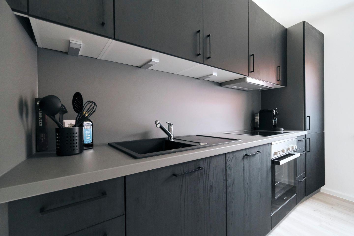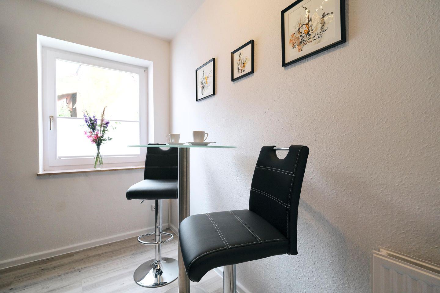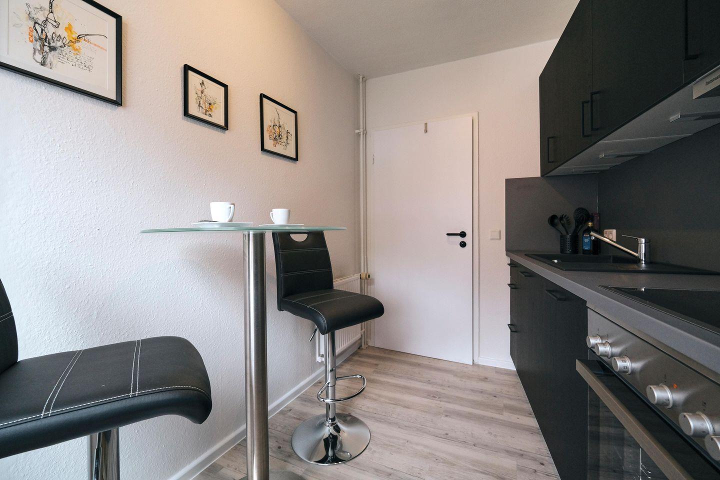 Das Badezimmer ist mit einer Dusche ausgestattet und wurde kürzlich erst neu renoviert. Die schicke, gut ausgestattete, schwarze Küche lädt zum gemeinsamen Kochen ein.