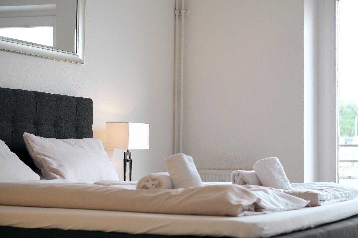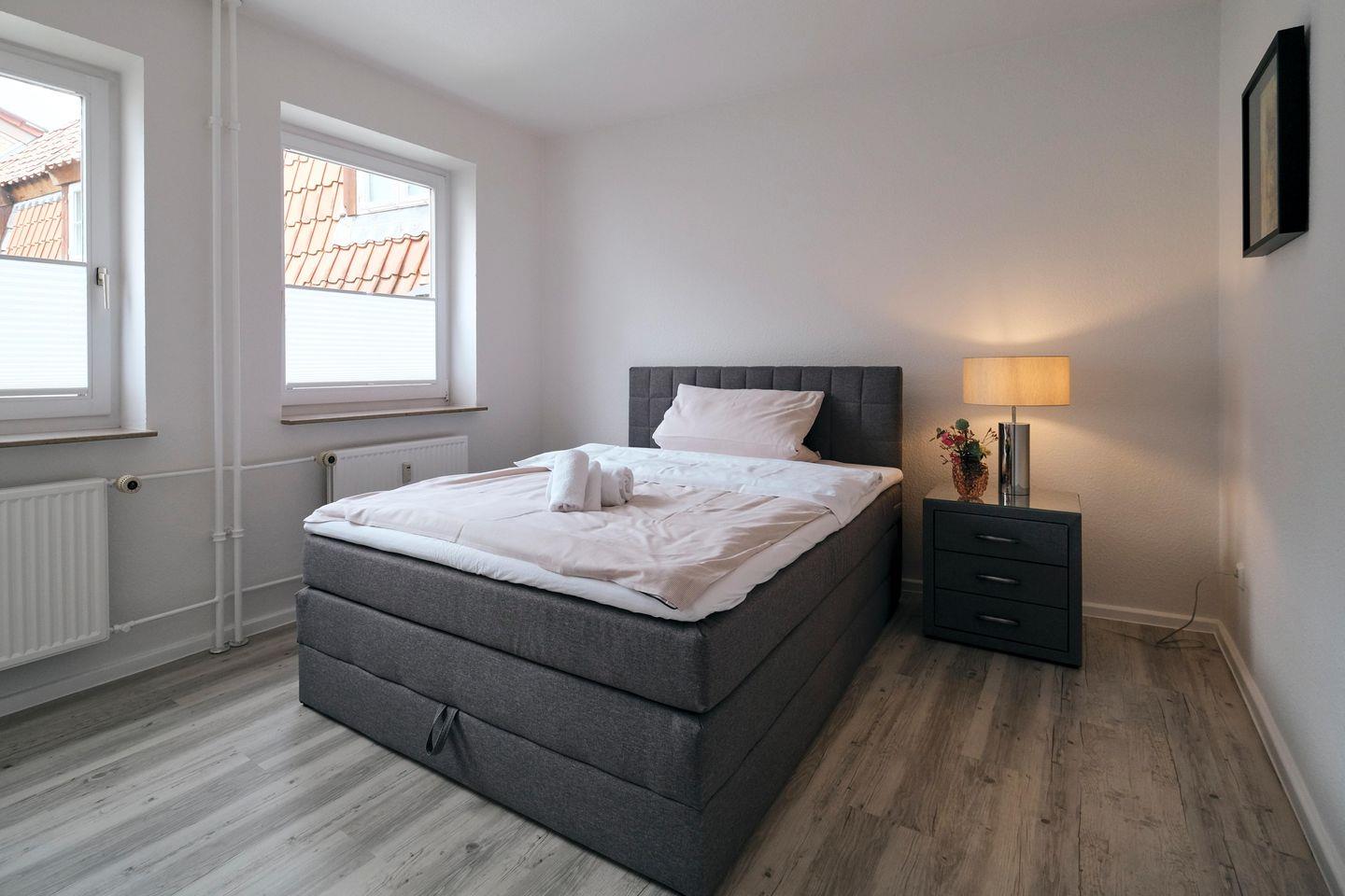 Es sind 2 Schlafzimmer vorhanden, mit jeweils einem Boxspringbett (1,80 x 2,00 Meter und 1,40 x 2,00 Meter) und verdunkelten Gardinen.