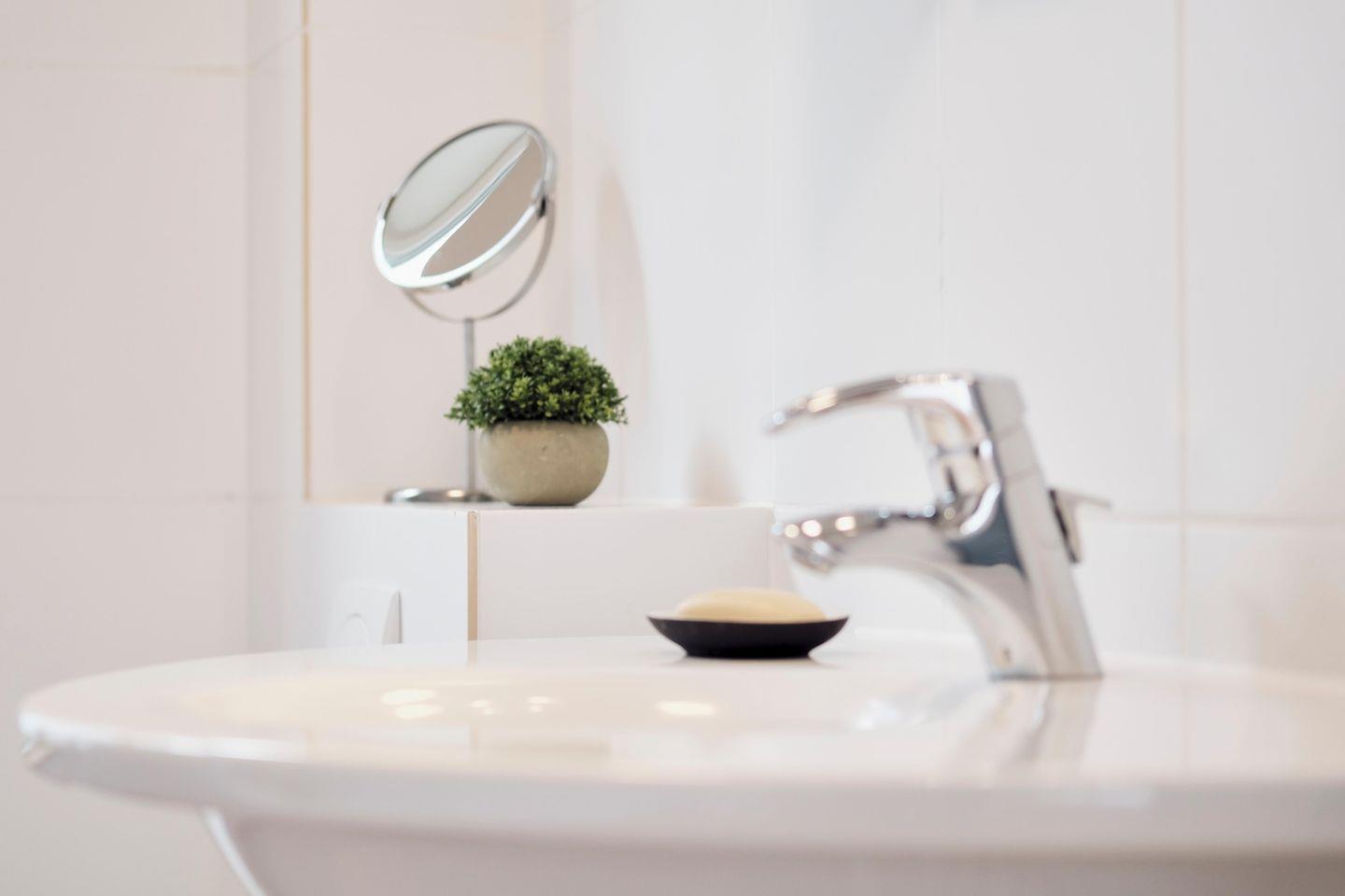 Das modernisierte Badezimmer hat eine Badewanne zum Entspannen sowie eine Handtuchheizung und Tageslichtfenster.