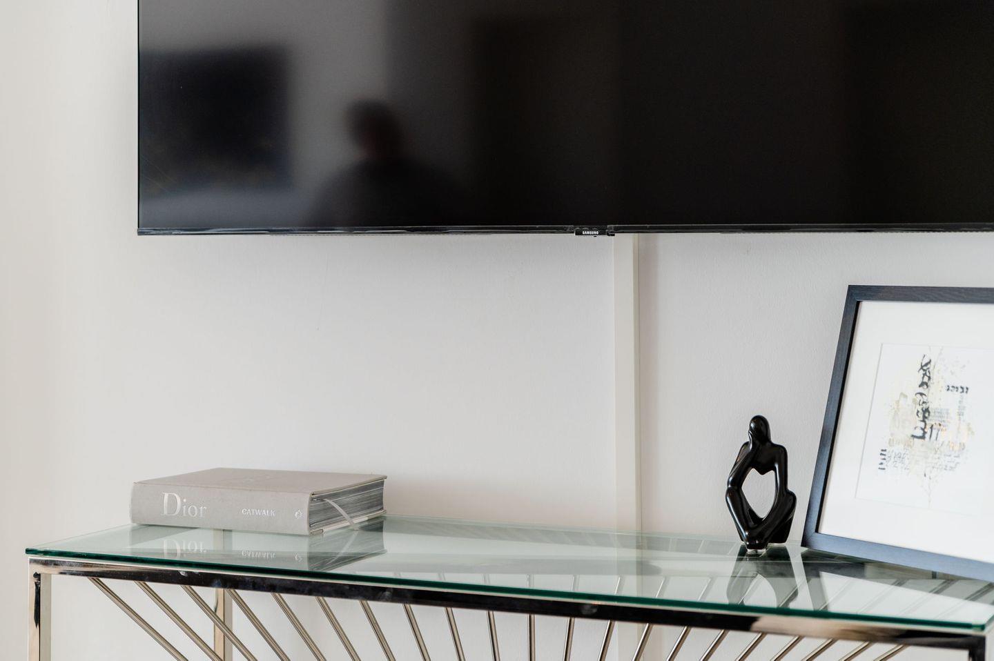Die Wohnung ist stilvoll eingerichtet und verfügt über ein helles Wohnzimmer mit einem bequemen Sofa, einem Fernseher und einem Essbereich. Die offene Küche ist modern ausgestattet und bietet alles, was Sie für die Zubereitung Ihrer Mahlzeiten benötigen, einschließlich Herd, Kühlschrank, Mikrowelle und Geschirr.