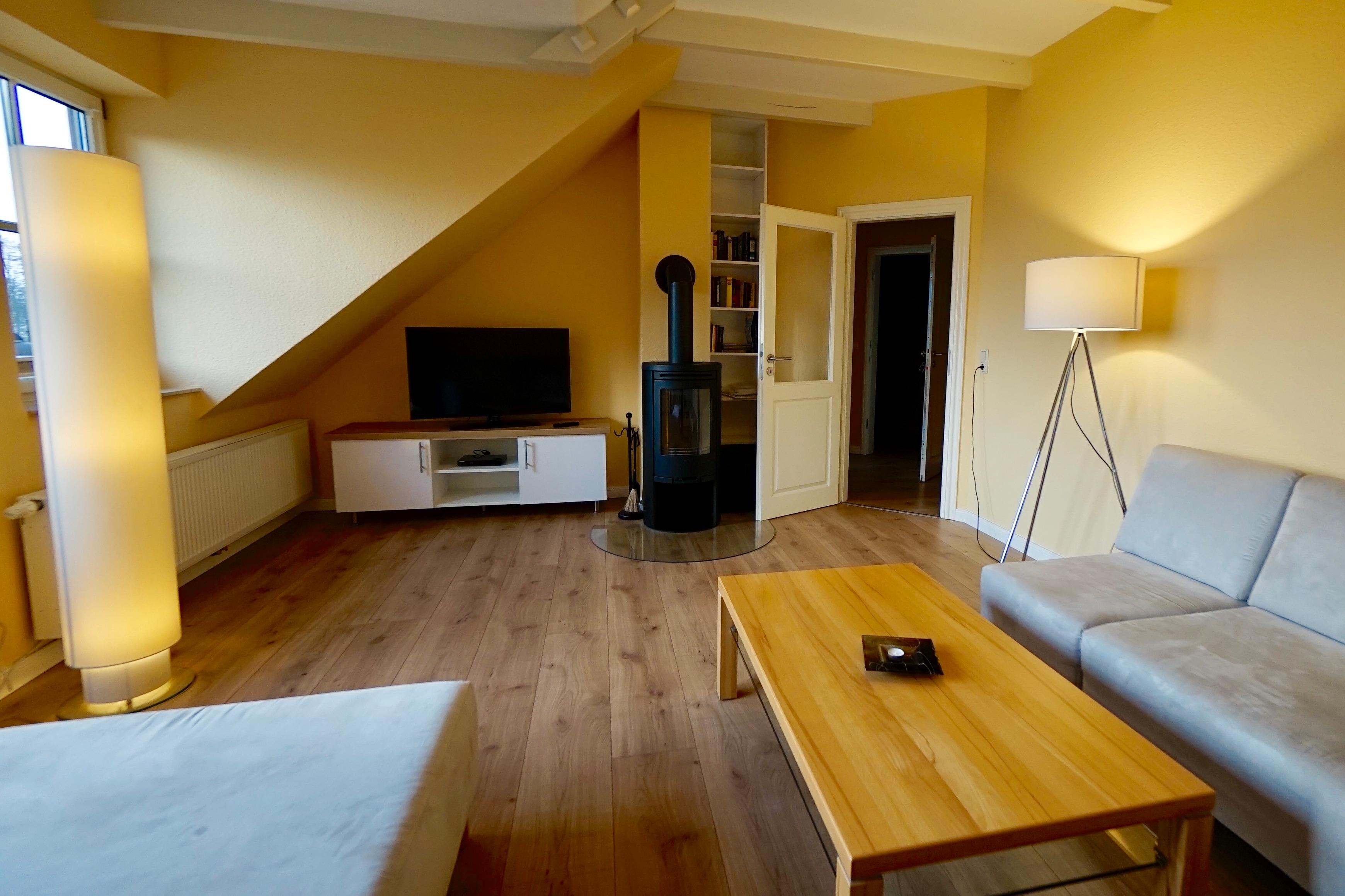Die hochwertige Küche ist separat vom Wohnraum und verfügt über einen schönen Esstisch, der auch zum Spielen genutzt werden kann. Ein Fernseher und ein CD-Radio sorgen für Unterhaltung. Im hellen und modernen Wohnzimmer lädt ein Kamin zum Verweilen ein, während eine große Couch viel Platz bietet. Im Schlafzimmer erwartet Sie ein komfortables Boxspringbett, und das moderne Duschbad rundet das Angebot ab. Im Wohnzimmer hat eine Couch eine Schlaffunktion - Sie können also Schnarcher umquartieren...