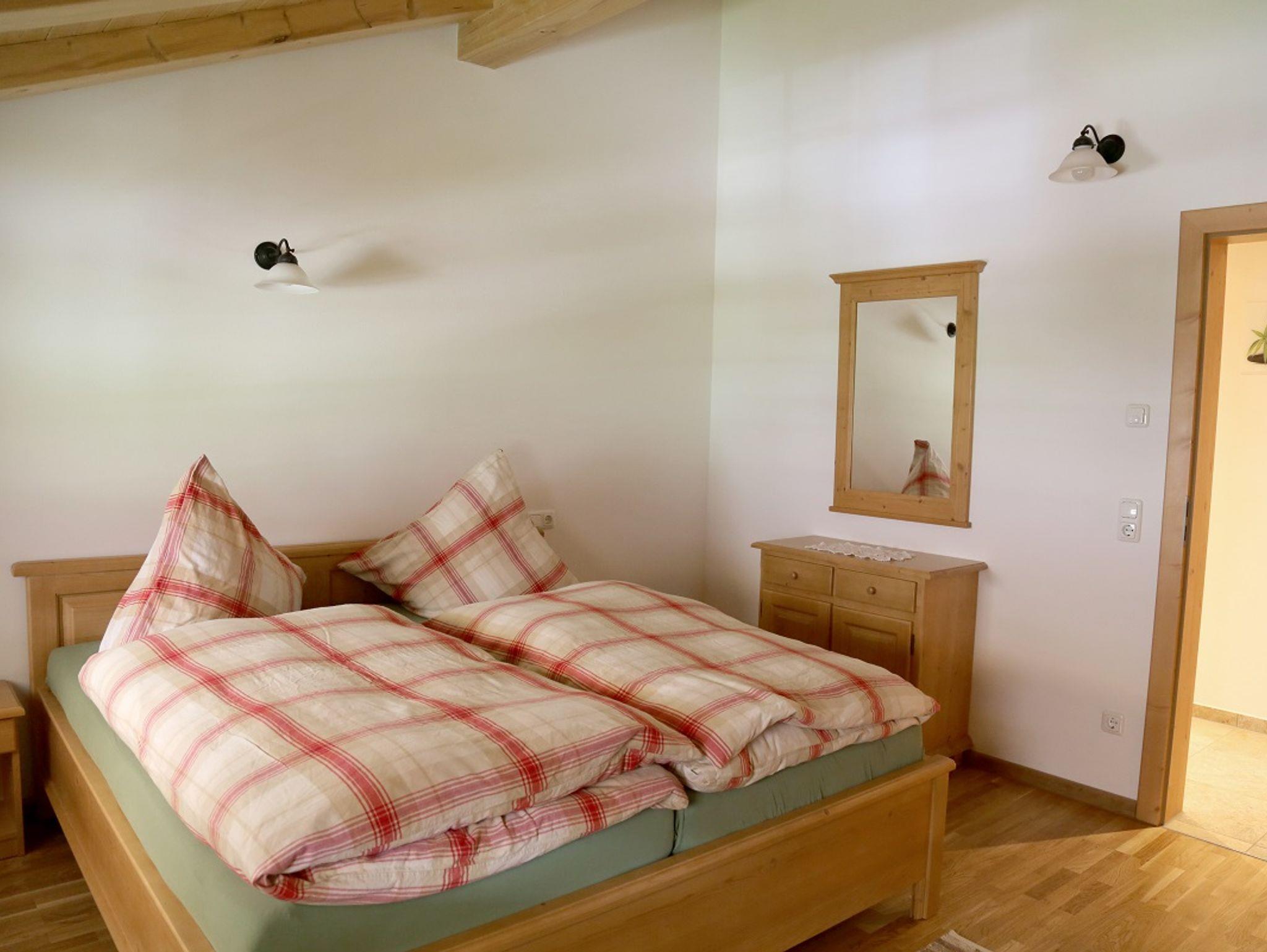 Die 2018 errichtete Ferienwohnung im Landhausstil befindet im 2. Stock unseres Bauernhofes, jedoch mit eigenem Eingang. Die Räume sind großzügig und hell, besonders der sichtbare Dachstuhl und der Parkettboden in der Wohnküche und in den 2 Schlafzimmern verleihen der Wohnung viel Gemütlichkeit. Die sehr gut ausgestattete Wohnküche ist mit einer Kaffeemaschine, Wasserkocher, 4 Ceranplatten, Backofen, Microwelle, reichlich Geschirr, Spülmaschine, Stabmixer, Eierkocher, Toaster und Kühlschrank mit Tiefkühlfach bestückt. Außerdem steht Ihnen ein TV, WLAN, Badezimmer mit DU/WC, Fön, Handtücher und Bettwäsche zur Verfügung. Der Balkon mit Balkonmöbel hat eine Ostausrichtung. - wenn 2 Personen beide Schlafzimmer benützen berechnen wir 10,00 € Zuschlag.