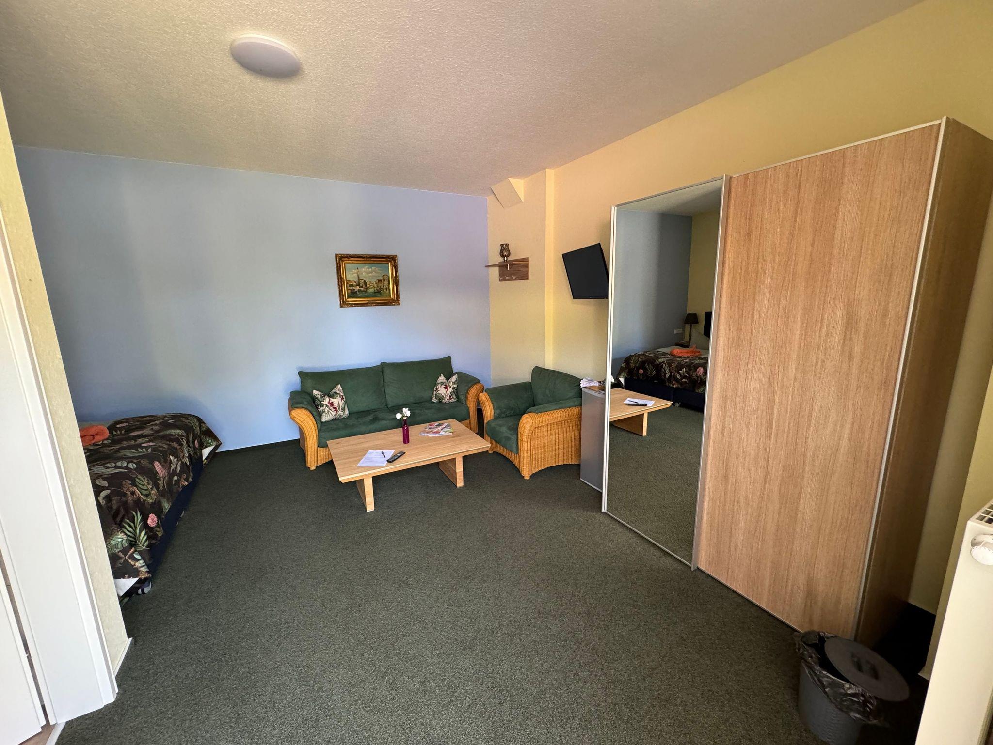 1 großzügiges Zimmer (Nr. 7) für 2 Personen mit gemütlicher Sofaecke. Aufbettung möglich.
