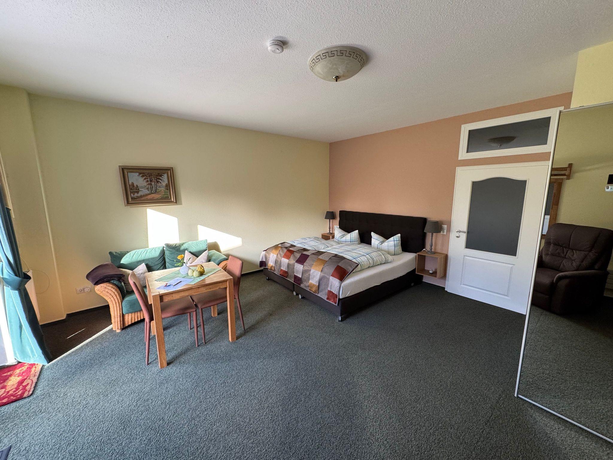 1 großzügiges Zimmer (Nr. 7) für 2 Personen mit gemütlicher Sofaecke. Aufbettung möglich.
