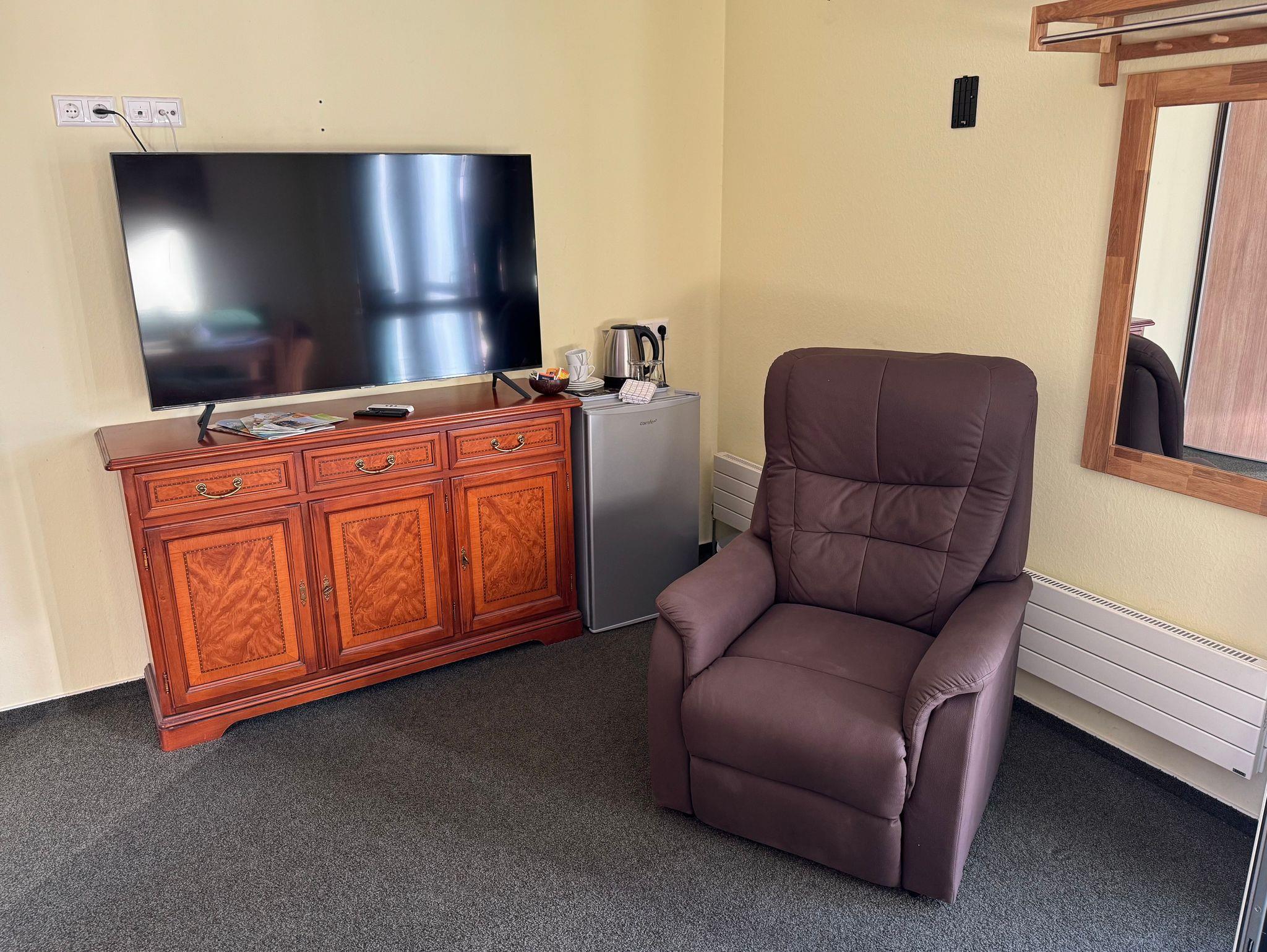 Gemütliches Zimmer (29 m²) inkl. geräumigem Bad mit Dusche; für 2 Personen mit kleiner Sofaecke und Sessel mit Aufstehhilfe. Ein Kühschrank und Wasserkocher sind vorhanden, WLAN ist inkl.