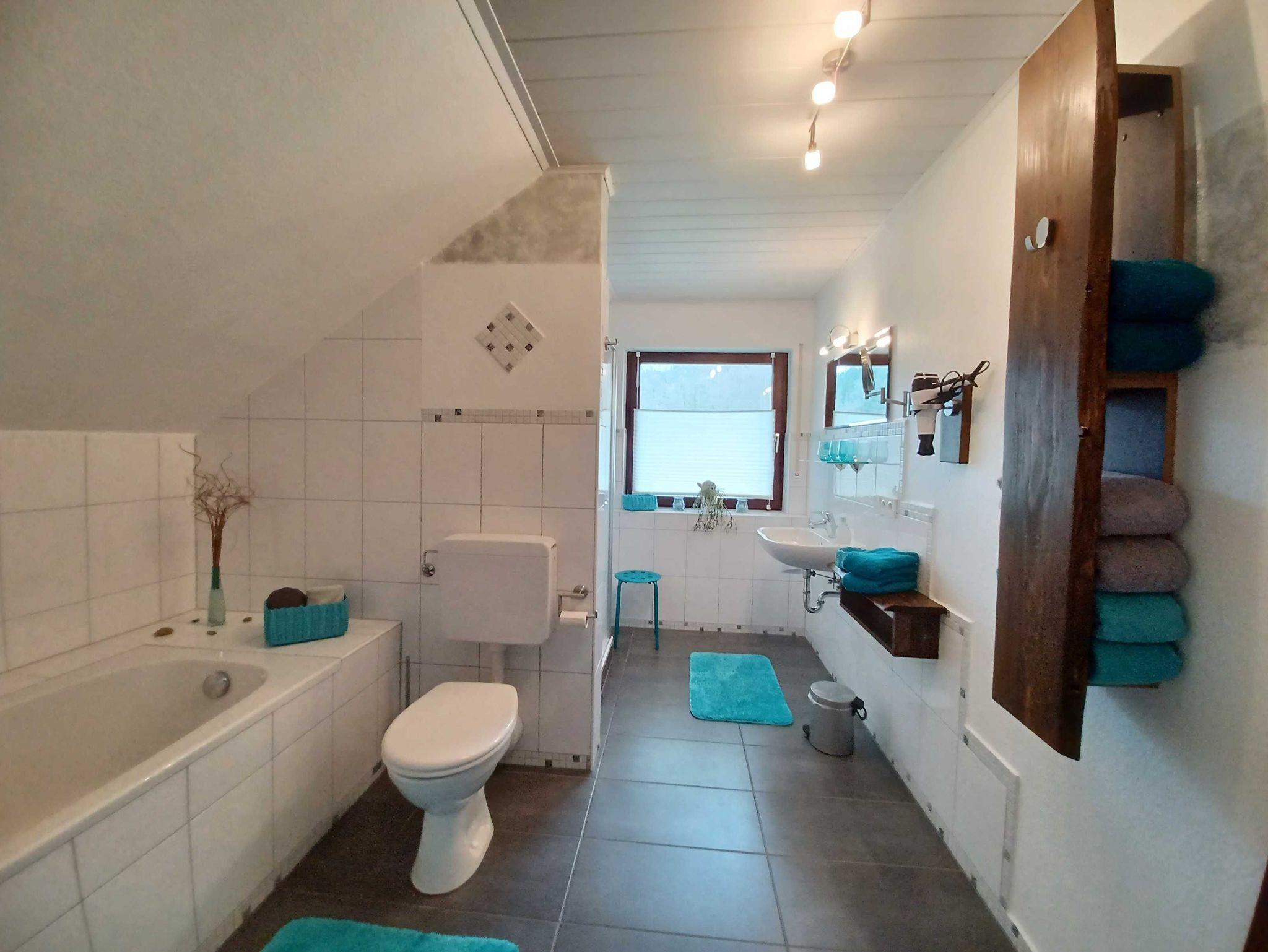 Das geräumige Badezimmer mit Dusche und Badewanne ist eine wahre Wohlfühloase.