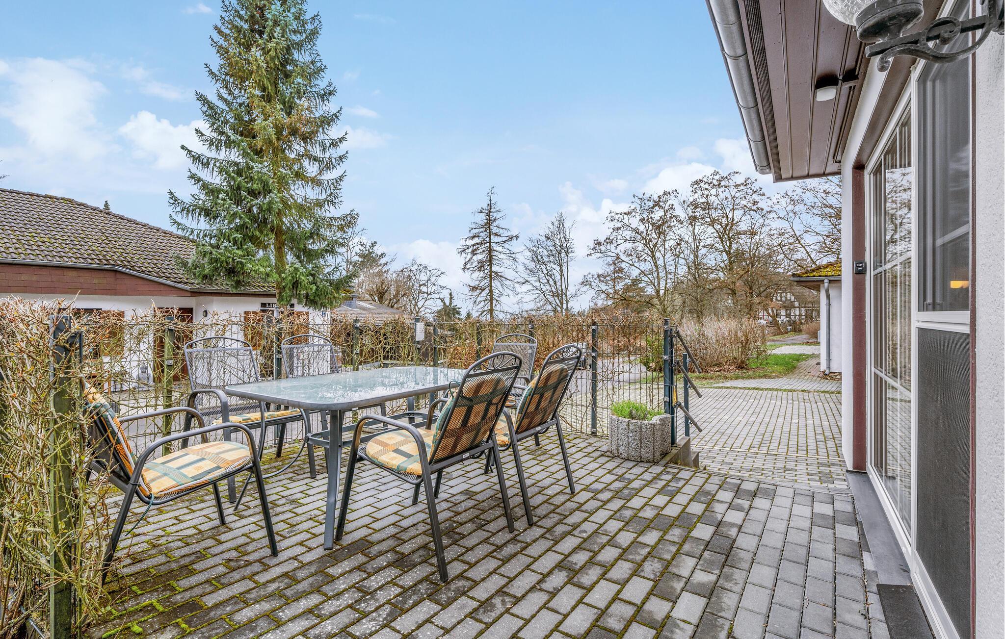 Ejendommen er omgivet af græsplæner. Huset har en terrasse med havemøbler, og husets indgangsparti er udstyret med en veranda.