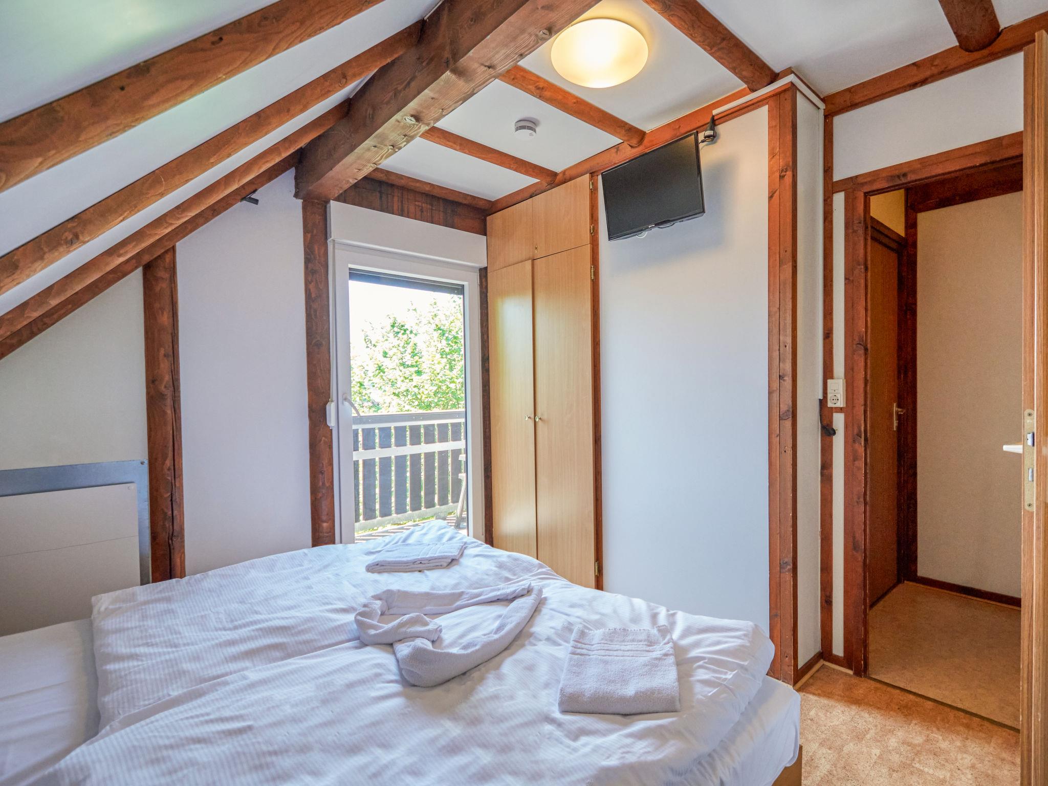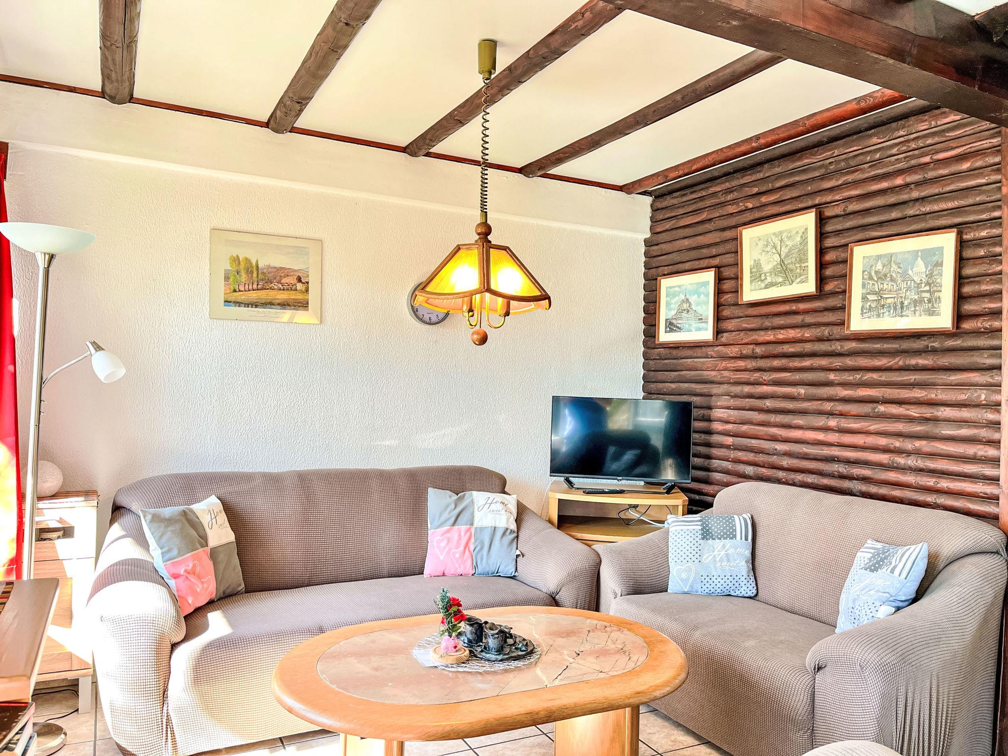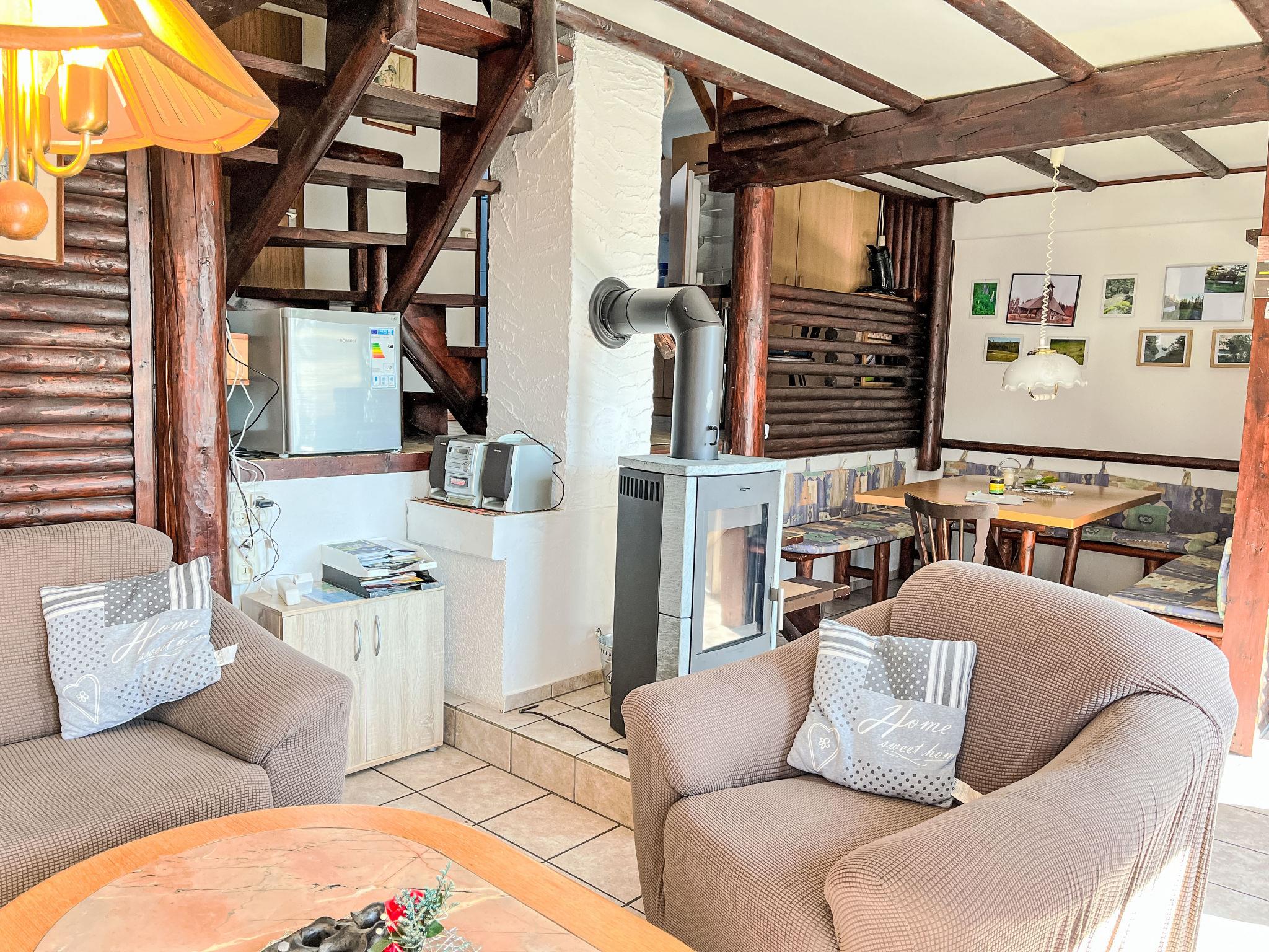 "Am Sternberg 105", 3-room house 65 m2 on 2 levels, on the ground floor. Cosy and wooden furniture furnishings: living/dining room 25 m2 with Scandinavian wood stove and cable TV (flat screen), wood-burning stove. Exit to the terrace, to the patio. 1 room 12 m2 with 1 double bed (180 cm, length 200 cm), hand-basin and separate WC. Small, open kitchen 8 m2 (4 hot plates, oven, dishwasher, kettle, microwave, freezer, electric coffee machine, Capsules for coffee machine (Senseo)). Shower/WC. Upper floor: (spiral staircase), 1 room 11 m2, with sloping ceilings with 1 double bed (180 cm, length 200 cm), cable TV (flat screen). Exit to the balcony. Electric heating. Small balcony 5 m2, large terrace 20 m2 partly roofed, patio, lawn 200 m2. Terrace furniture, balcony furniture, barbecue (portable), deck chairs (3). Facilities: hair dryer, logs (extra). Internet (WiFi, free). Please note: non-smoking house. Smoke alarm, fire extinguisher. On the ground floor, the rooms are connected by stairs(mezzanine).