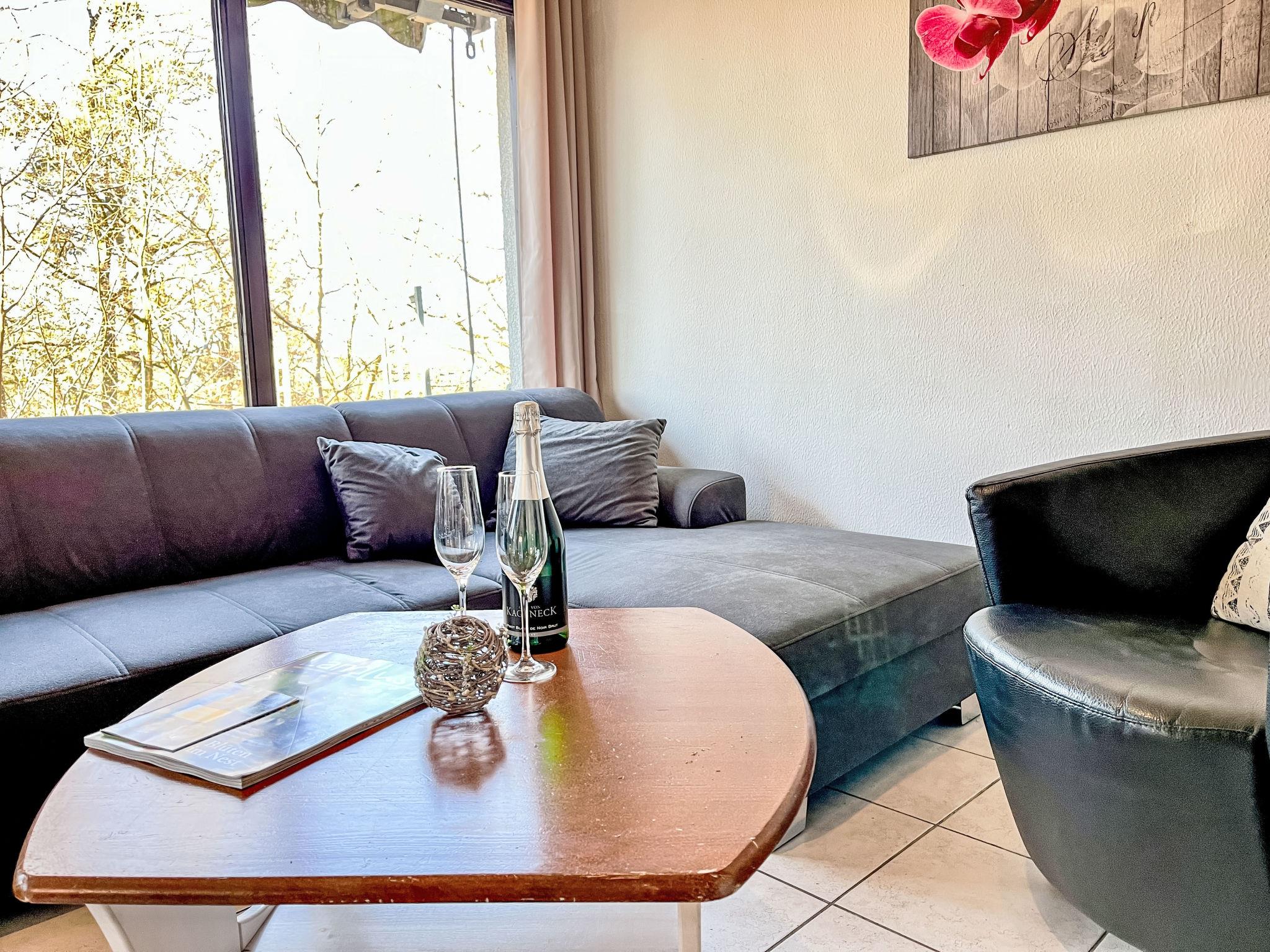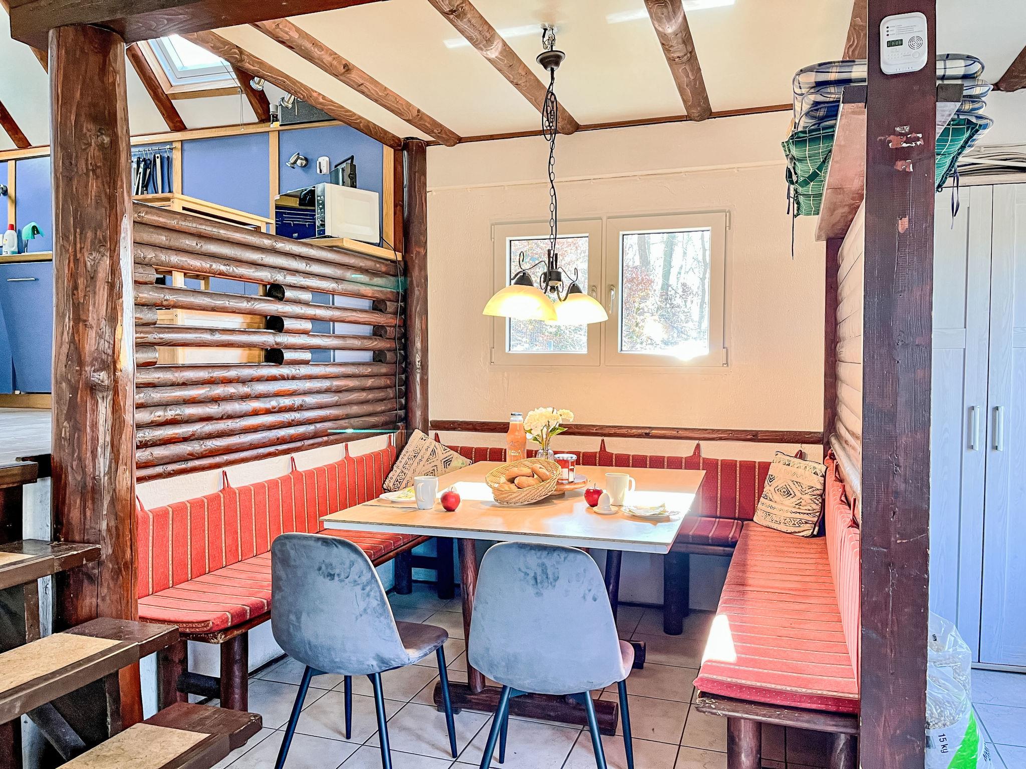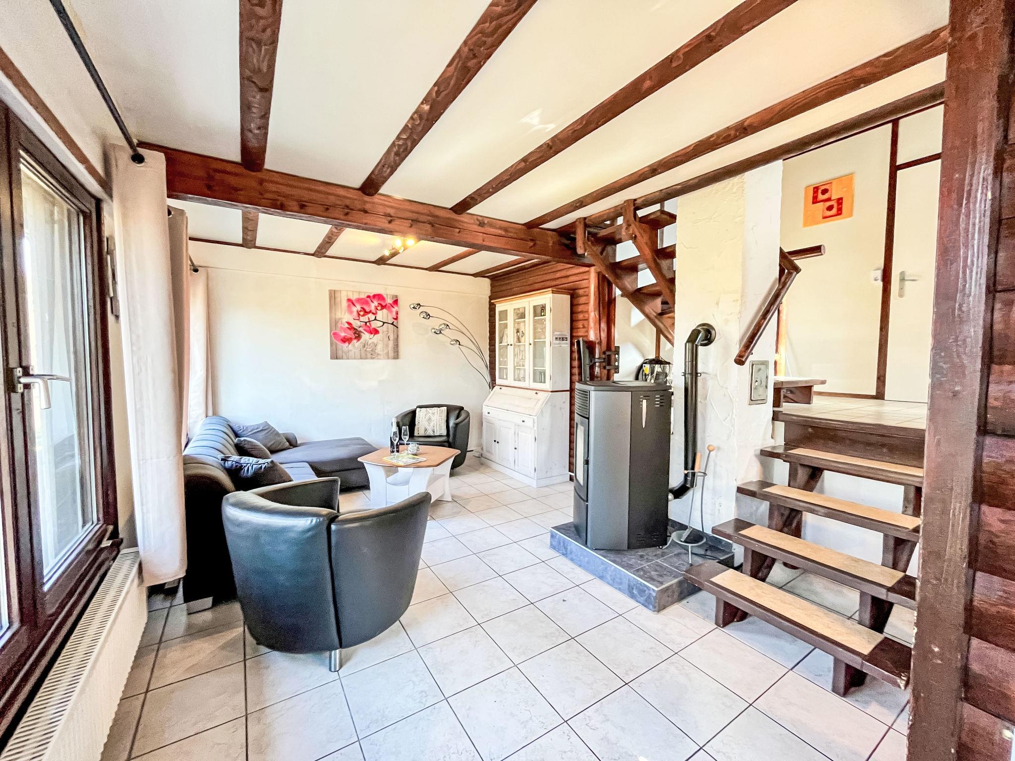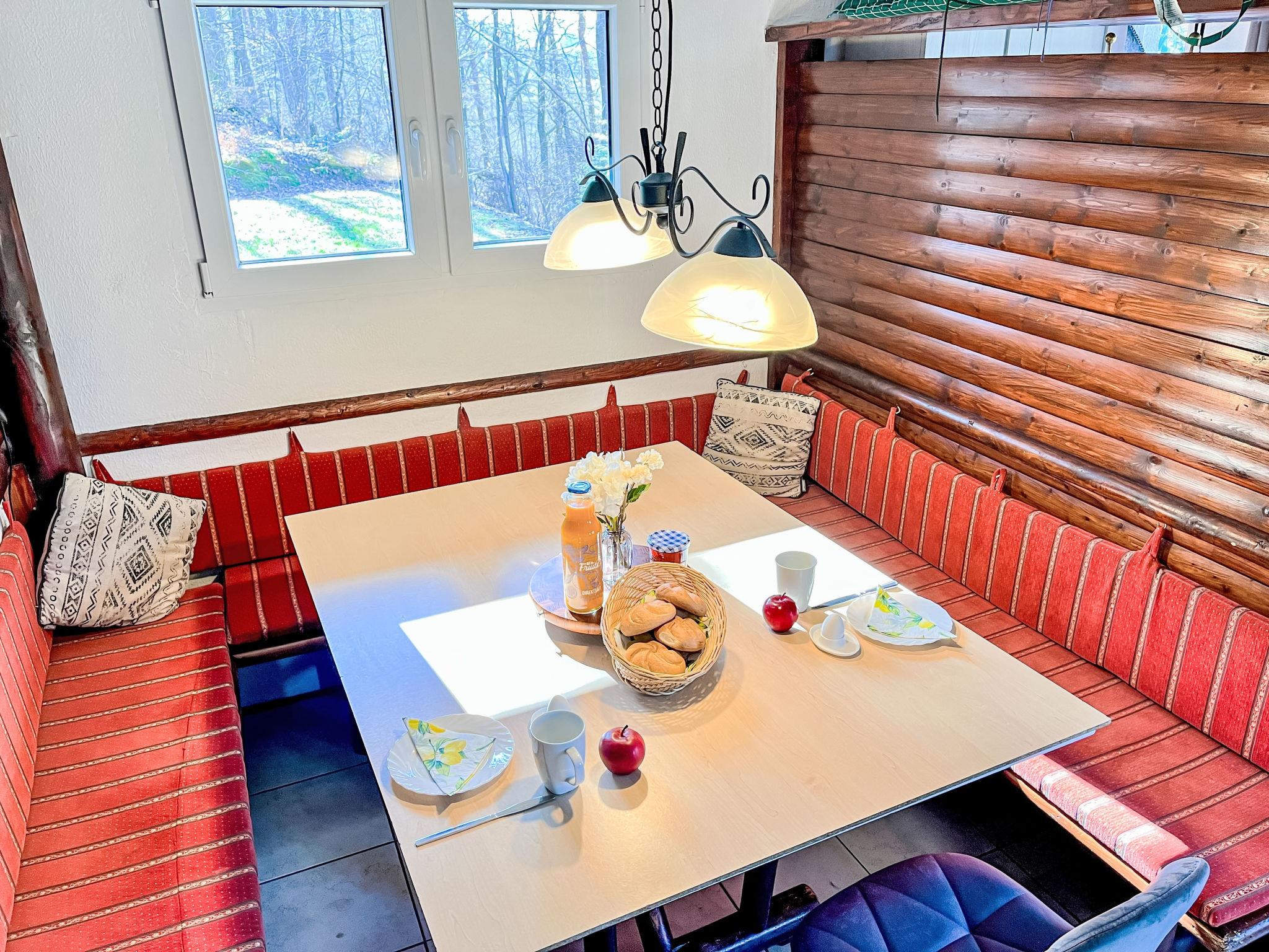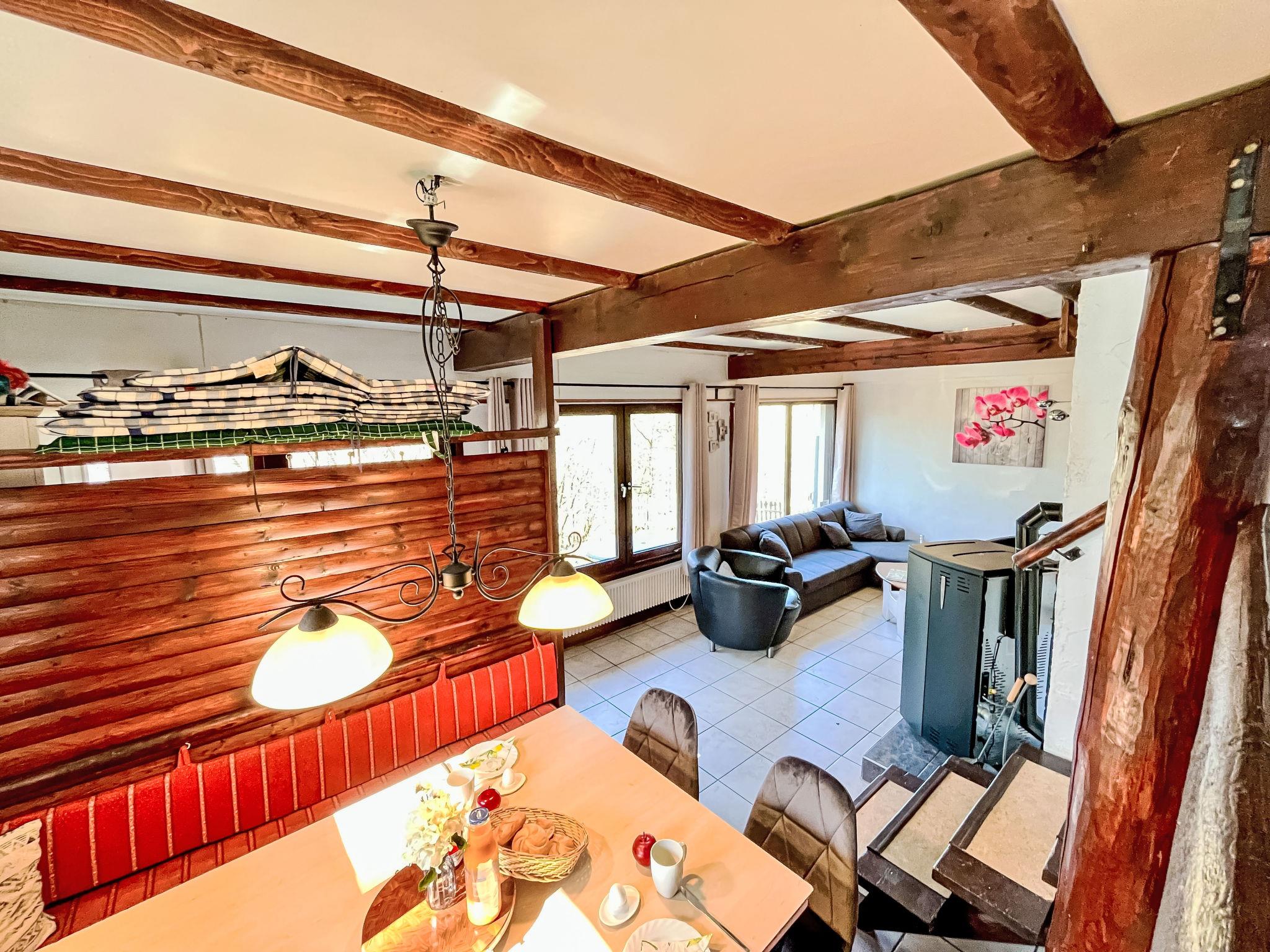 "Tischlein, deck dich", 4-room house 75 m2 on 3 levels. Partly renovated in 2021, cosy and wooden furniture furnishings: open living/dining room with dining nook, digital TV, flat screen, radio and wood-burning stove. Exit to the terrace. Upper floor: 1 room with sloping ceilings with rooflight with 1 double bed (2 x 90 cm, length 190 cm), TV. With sloping ceilings, open kitchen (oven, dishwasher, 4 ceramic glass hob hotplates, microwave, electric coffee machine). Shower/WC, sep. WC. 2nd upper floor: 1 room with sloping ceilings with 1 double bed (2 x 90 cm, length 190 cm). Exit to the balcony. 1 room with sloping ceilings with 2 beds (90 cm, length 190 cm), TV. Exit to the balcony. Electric heating, air-conditioning. Carpet. Balcony, terrace, lawn 100 m2. Terrace furniture. Facilities: logs (extra). Internet (WiFi, free). Parking at 50 m. Please note: non-smoking house. Maximum 2 small pets/ dogs allowed. Smoke alarm, fire extinguisher. Trampolin for shared use. The fireplace is a pellet stove.