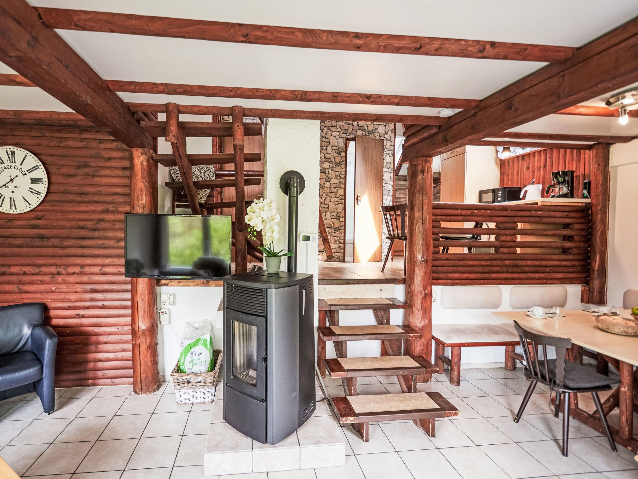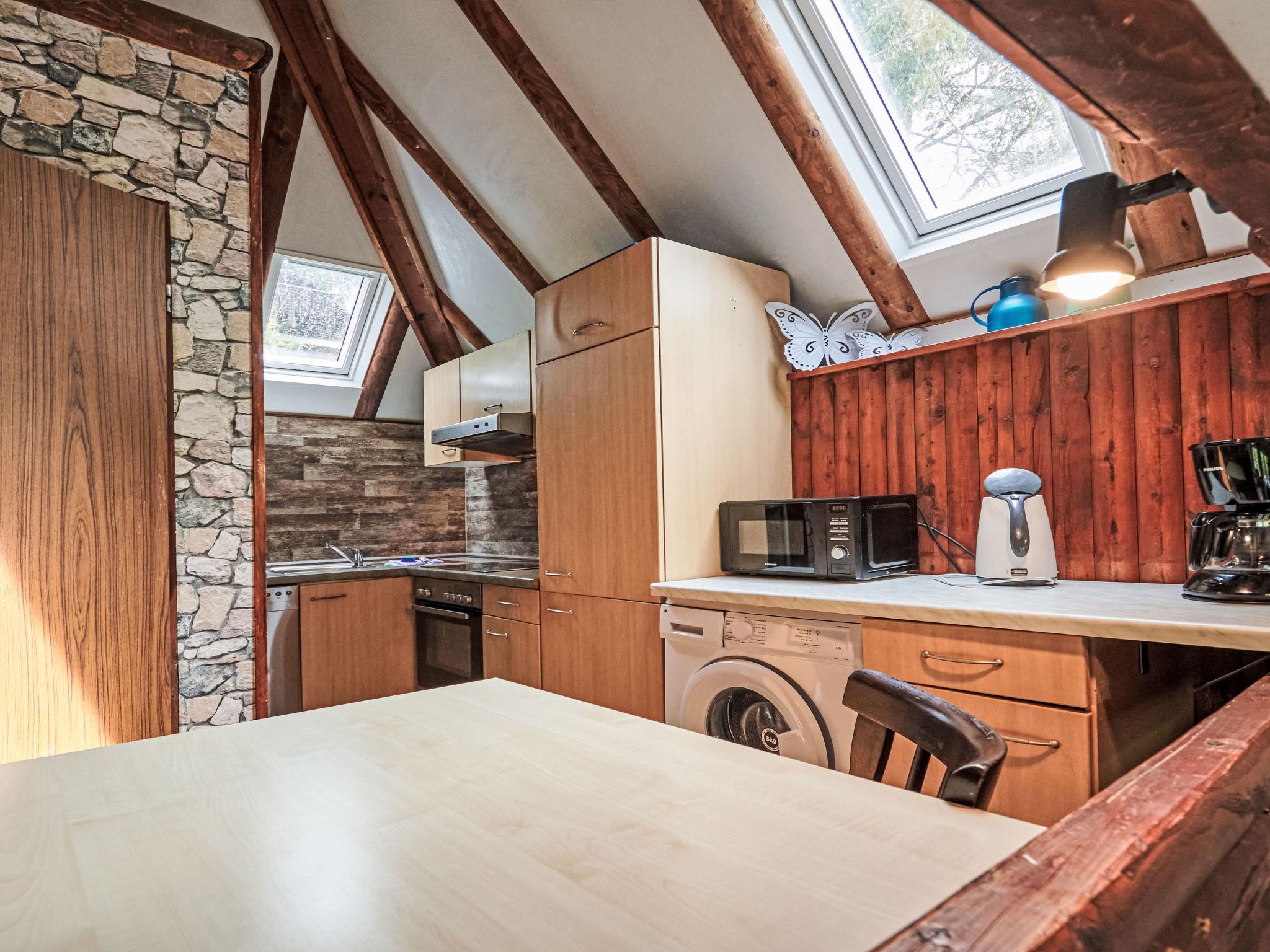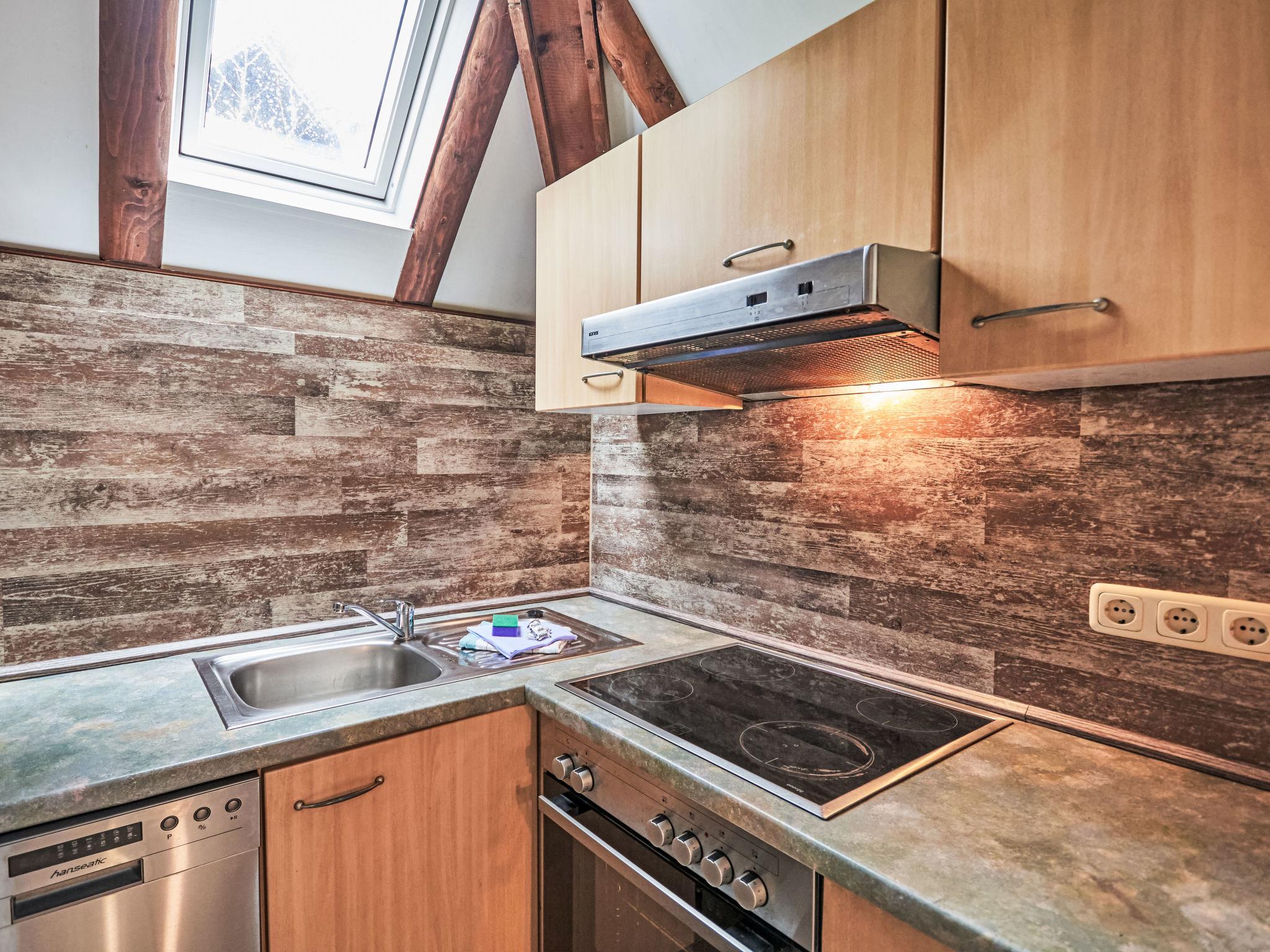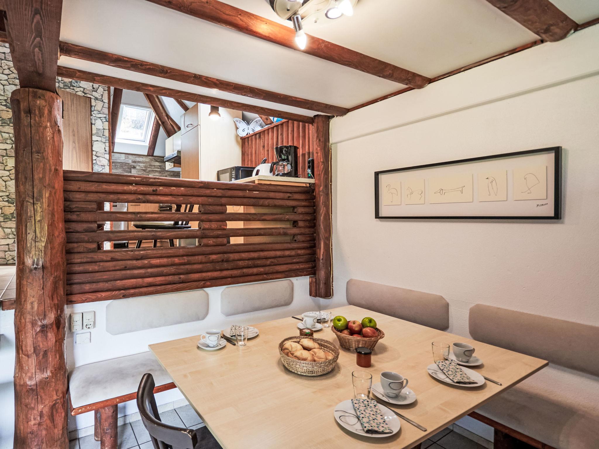 "Klein und Fein", 2-room apartment 50 m2. Rustic and wooden furniture furnishings: open living/dining room with dining nook, digital TV, radio and wood-burning stove. 1 room with rooflight with 2 beds. With sloping ceilings, open kitchen (oven, 4 ceramic glass hob hotplates, microwave, electric coffee machine) with small dining table. Shower/WC. Terrace, lawn 60 m2. Terrace furniture. Facilities: washing machine, logs (extra). Internet (WiFi, free). Parking at 5 m. Please note: maximum 1 small pet/ dog allowed. Smoke alarm, fire extinguisher. The wood stove is a pellet stove. The 3rd floor is closed and not inhabited! Bookings accepted for holiday purposes only.