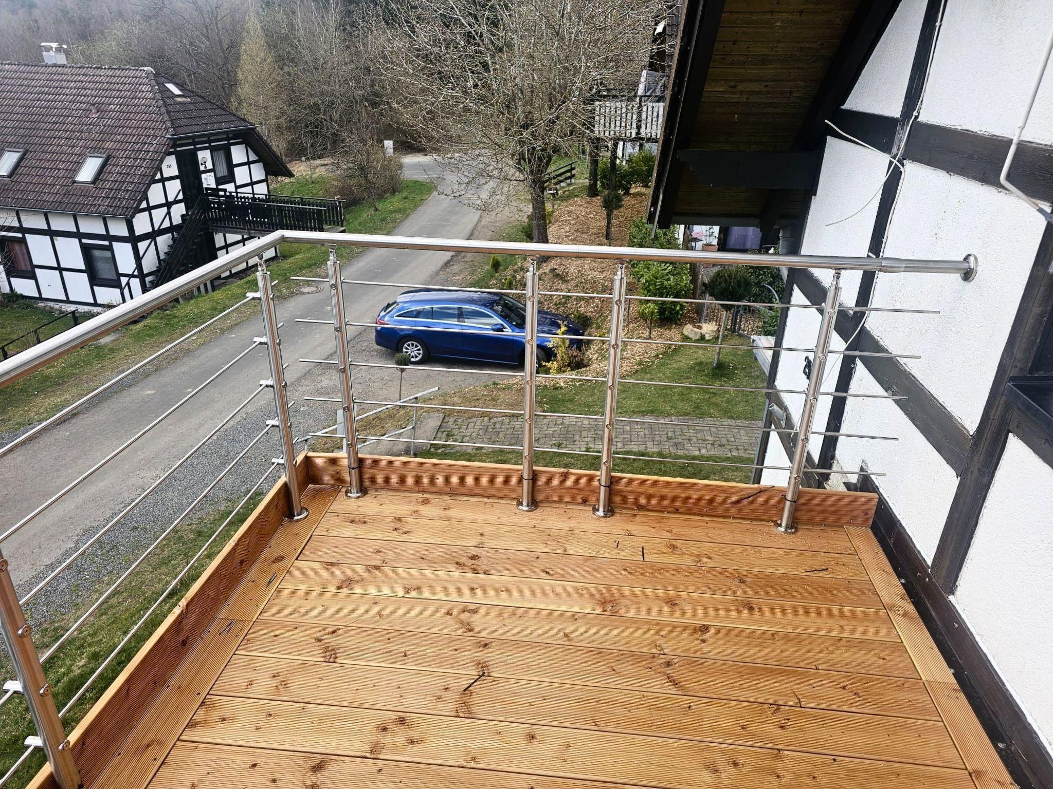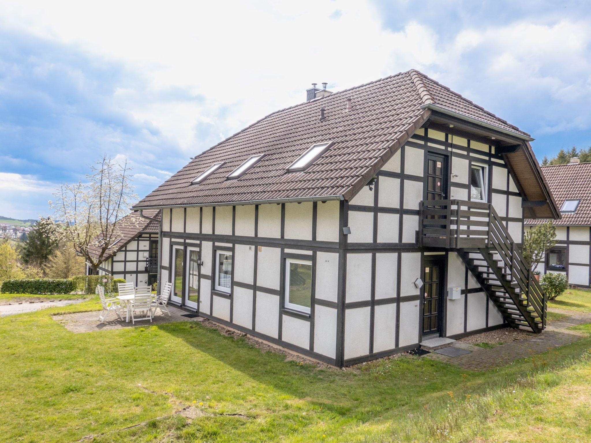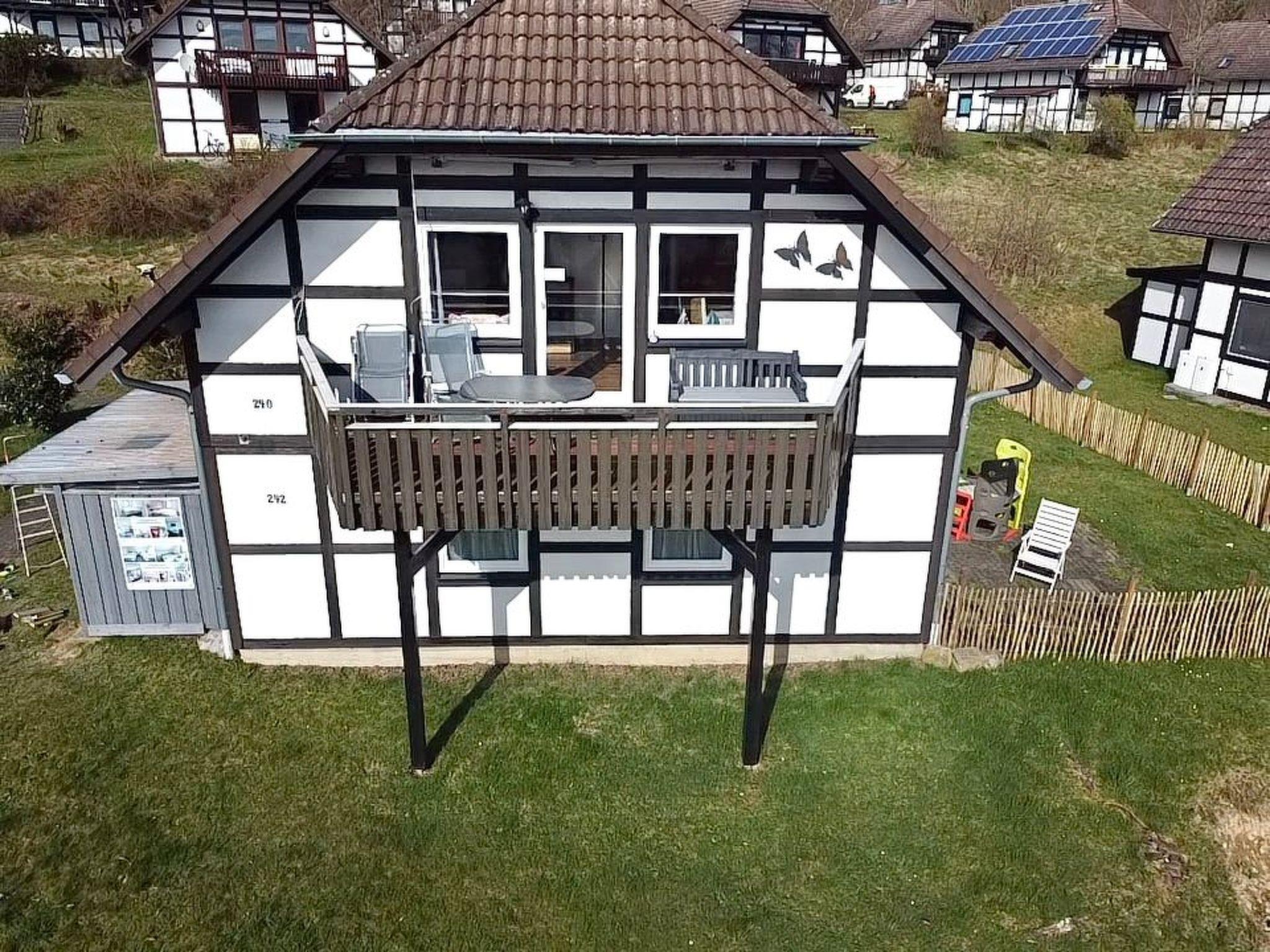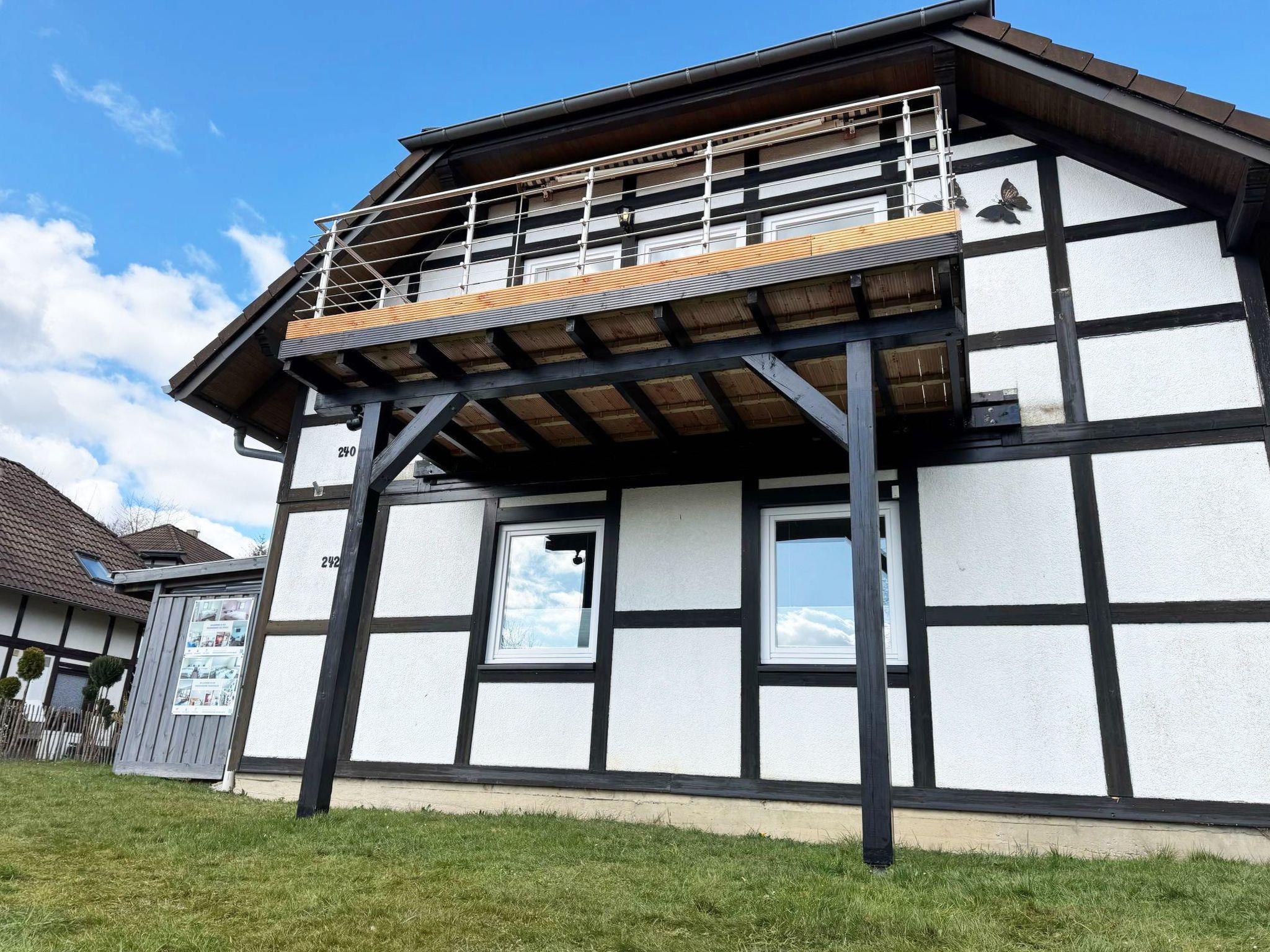 Outside, you will find a quiet lawn surrounding the holiday home. A paved path leads you to the wooden outside staircase, which you can use to enter the flat. The detached house is located at the end of a very quiet cul-de-sac in the upper part of the holiday village of Frankenau, just a few metres from the forest entrance to the Kellerwald.