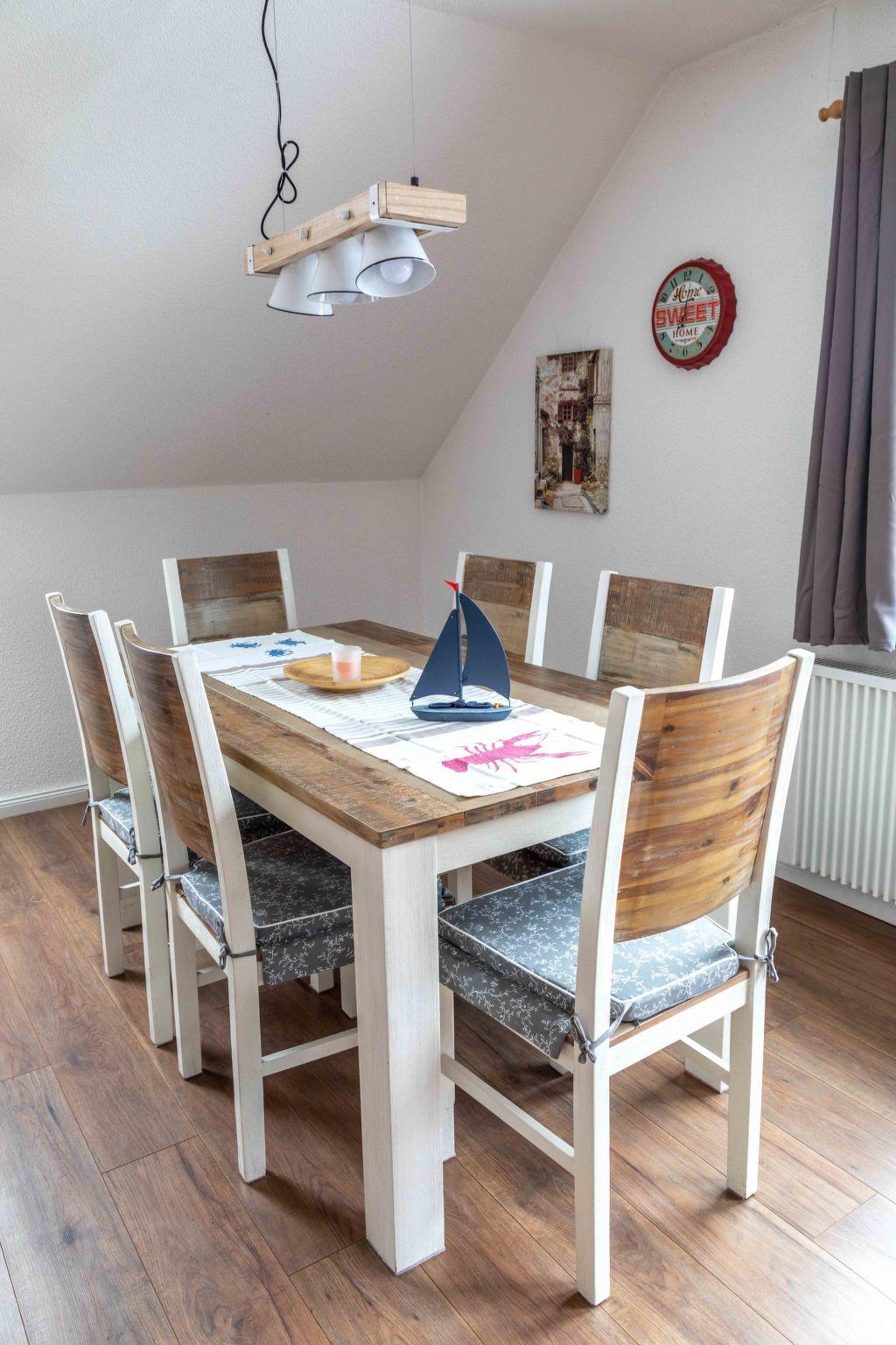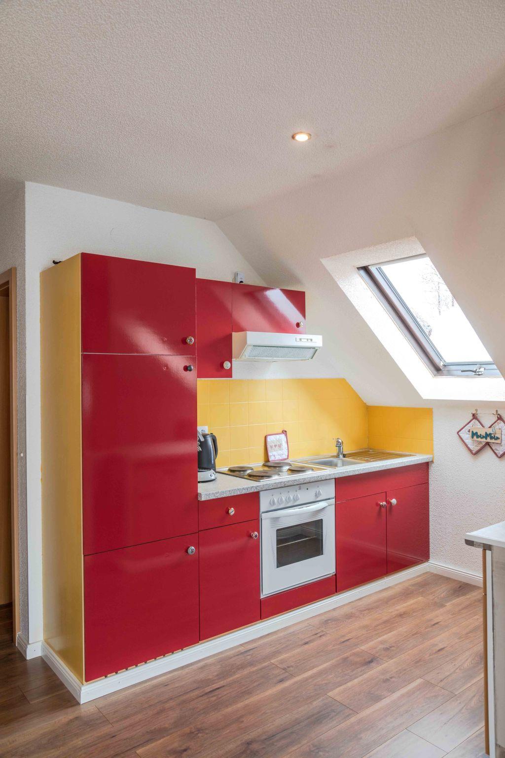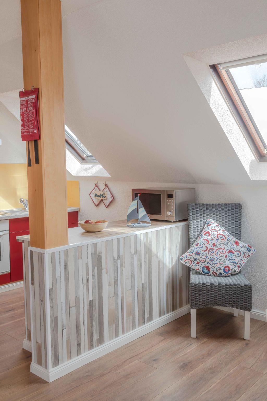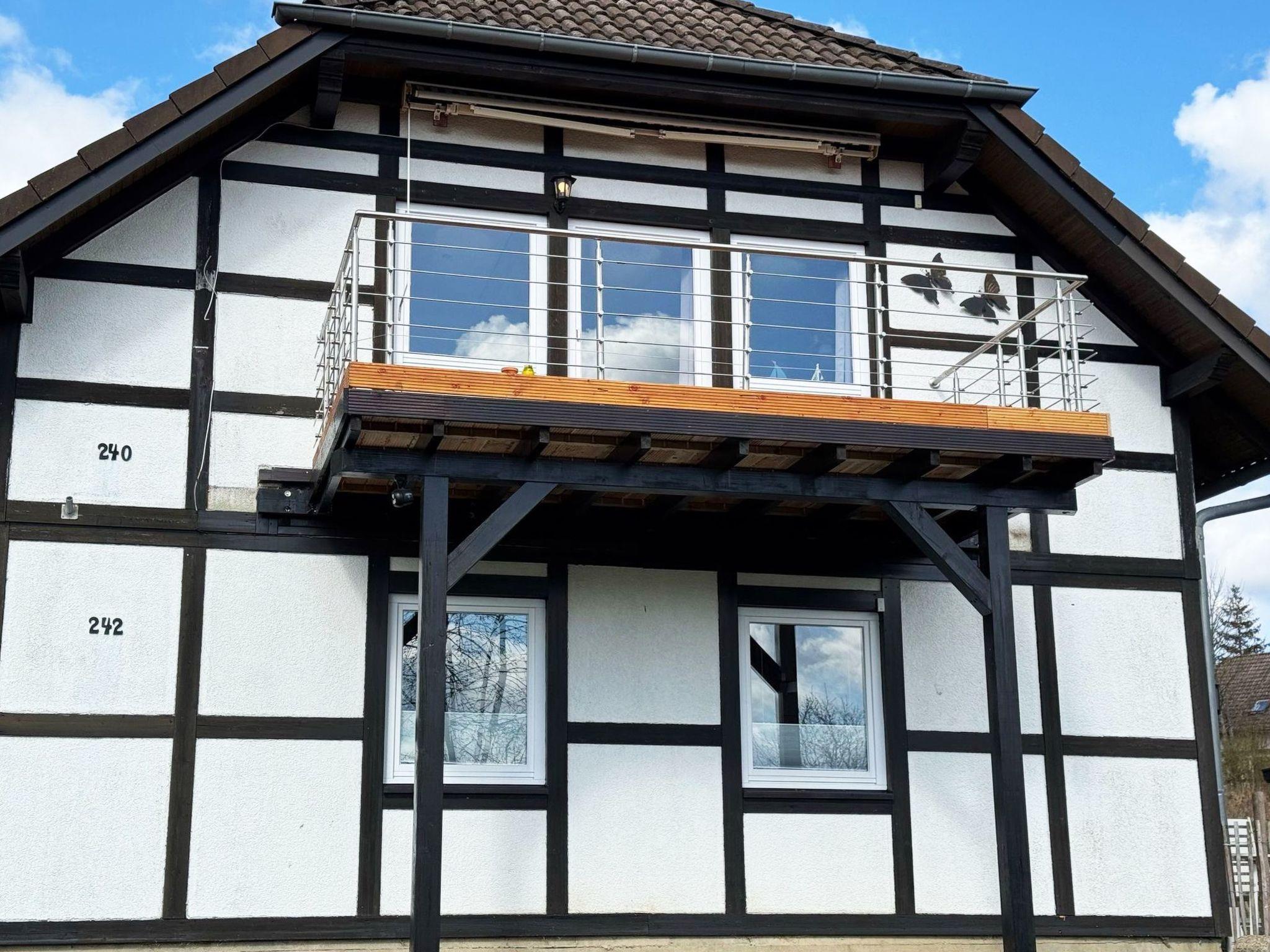 Inside, the 85 m² holiday flat, located on the first floor of a characterful half-timbered house, offers all the amenities for a comfortable stay. You enter the flat via a separate entrance, which is accessed via an external staircase. The flat has a cosy bedroom with a double bed (180 x 200 cm), a large wardrobe and another bedroom with two single beds. A modern daylight bathroom and a fully equipped open-plan kitchen with adjoining dining and living area, including a large panoramic balcony, round off the offer. A large leather living area with sleeping function, a TV, internet radio and a new pellet stove ensure cosy evenings.
