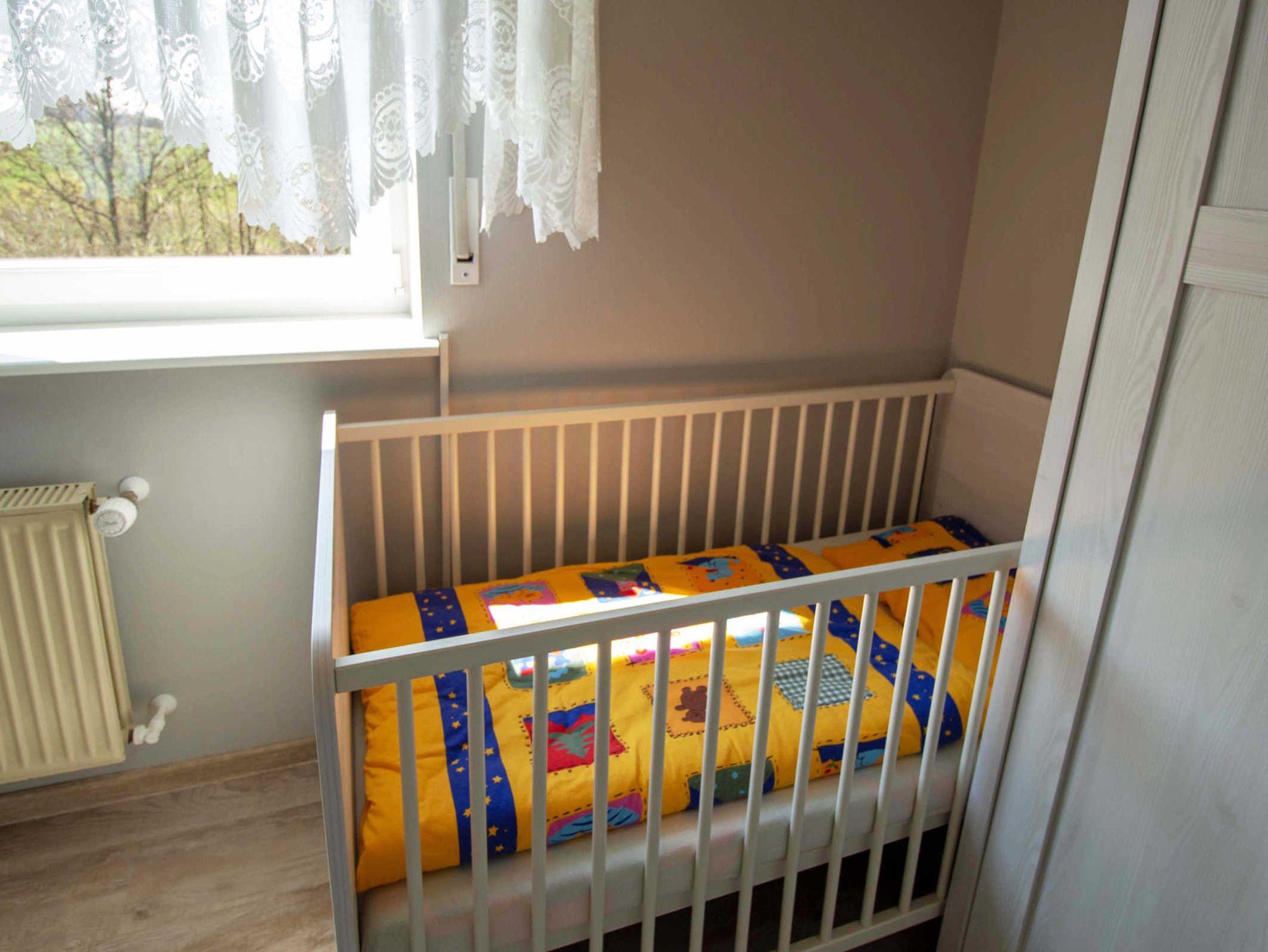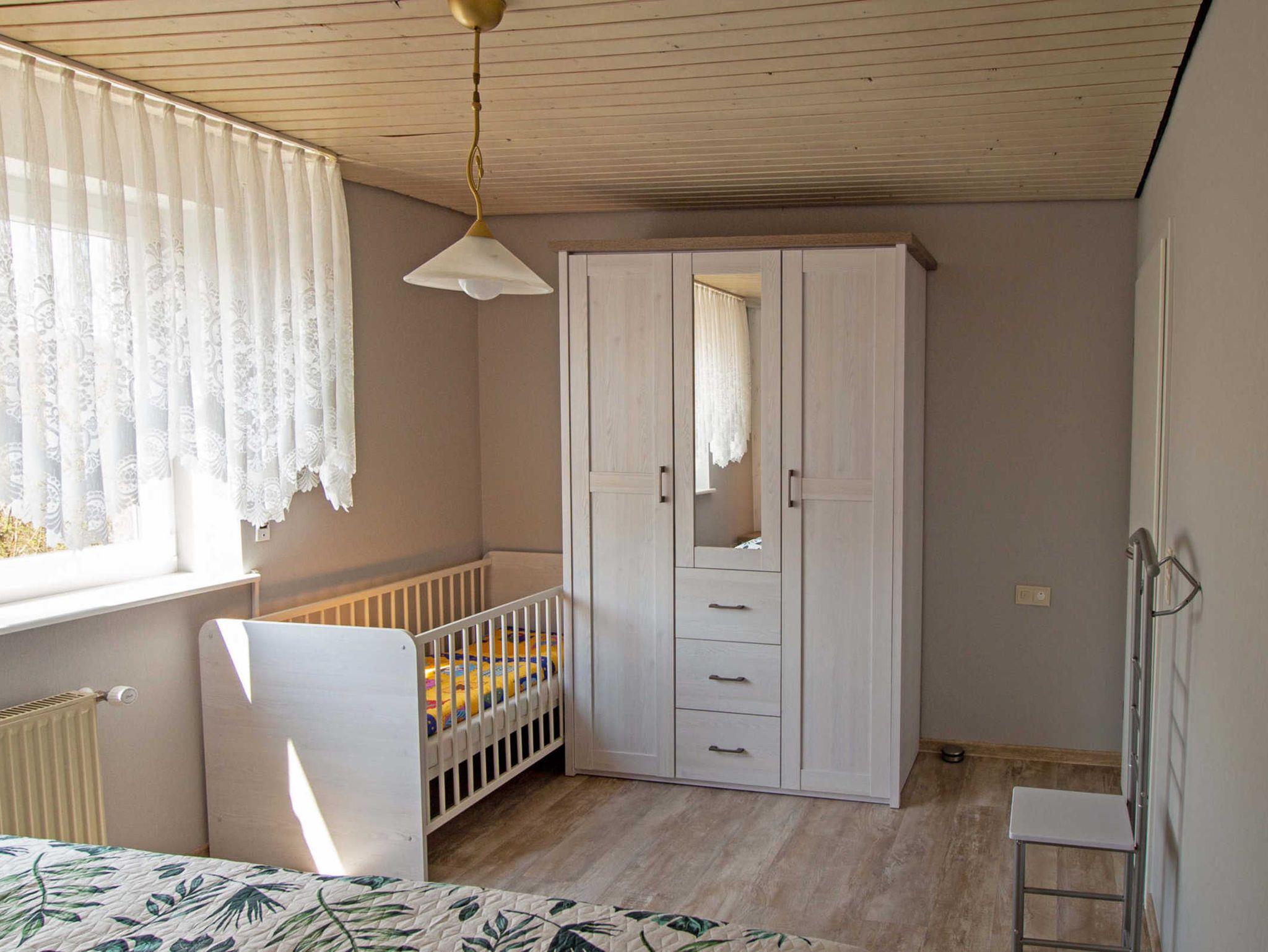 Das Schlaffzimmer ist mit einem Doppelbett (1,80 x 2,00 m) sowie Schrank und Babybett eingerichtet.