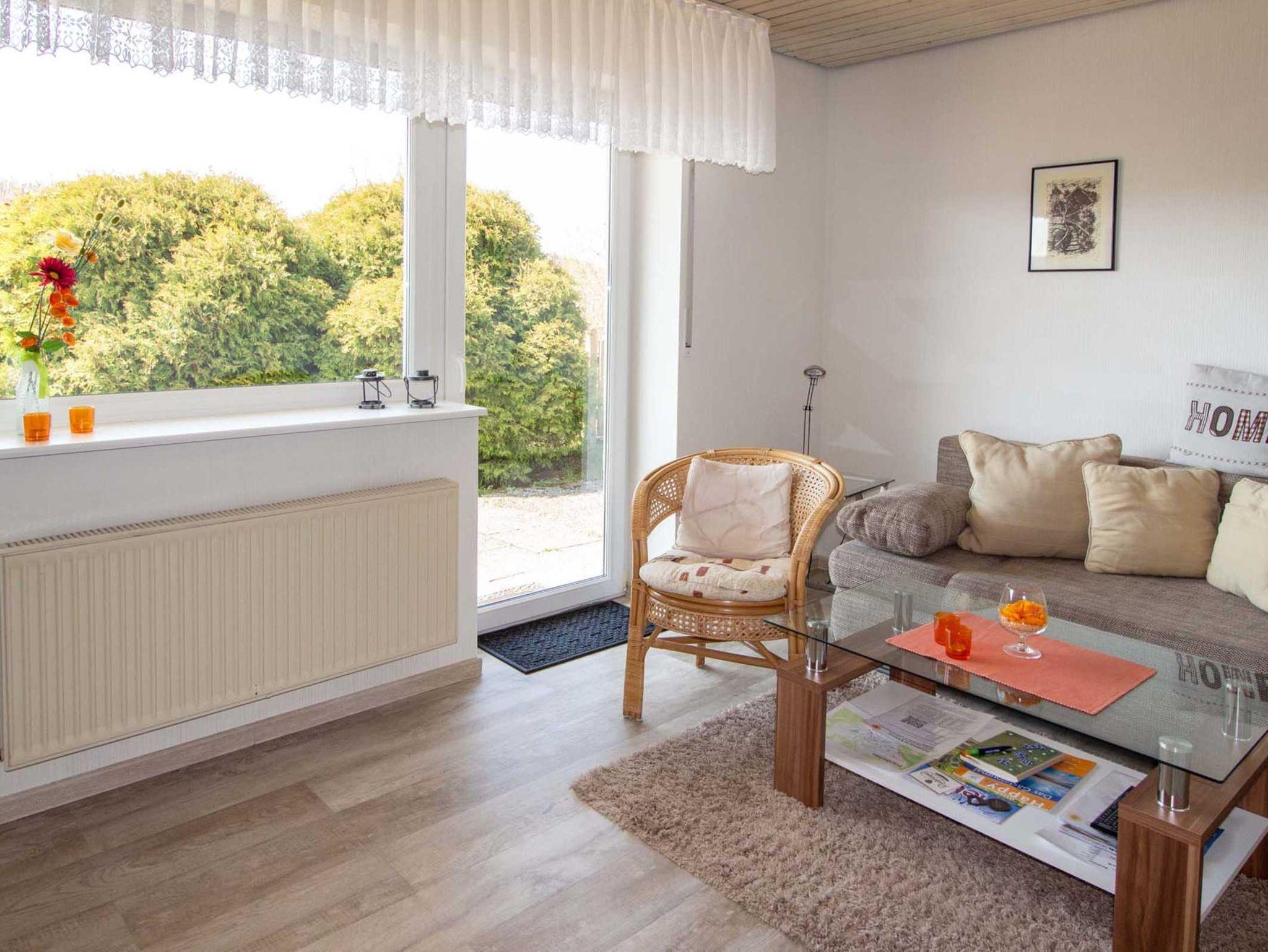 Die Ferienwohnung befindet sich im Erdgeschoss unseres Hauses und mit einer Größe von ca. 58 qm für 2-4 Personen verfügt sie über je 1 Wohnzimmer, Schlafzimmer, Diele, Küche und Bad: